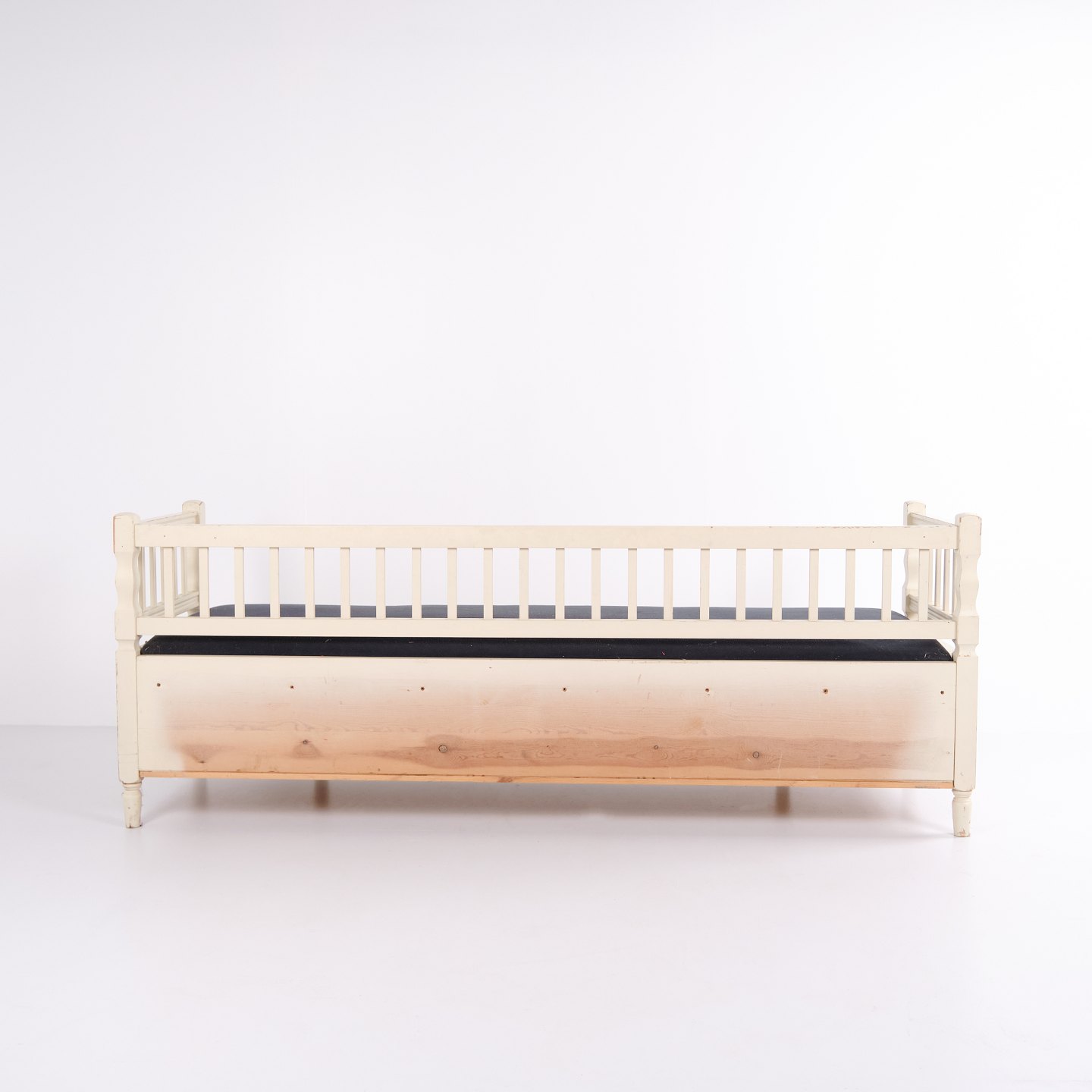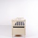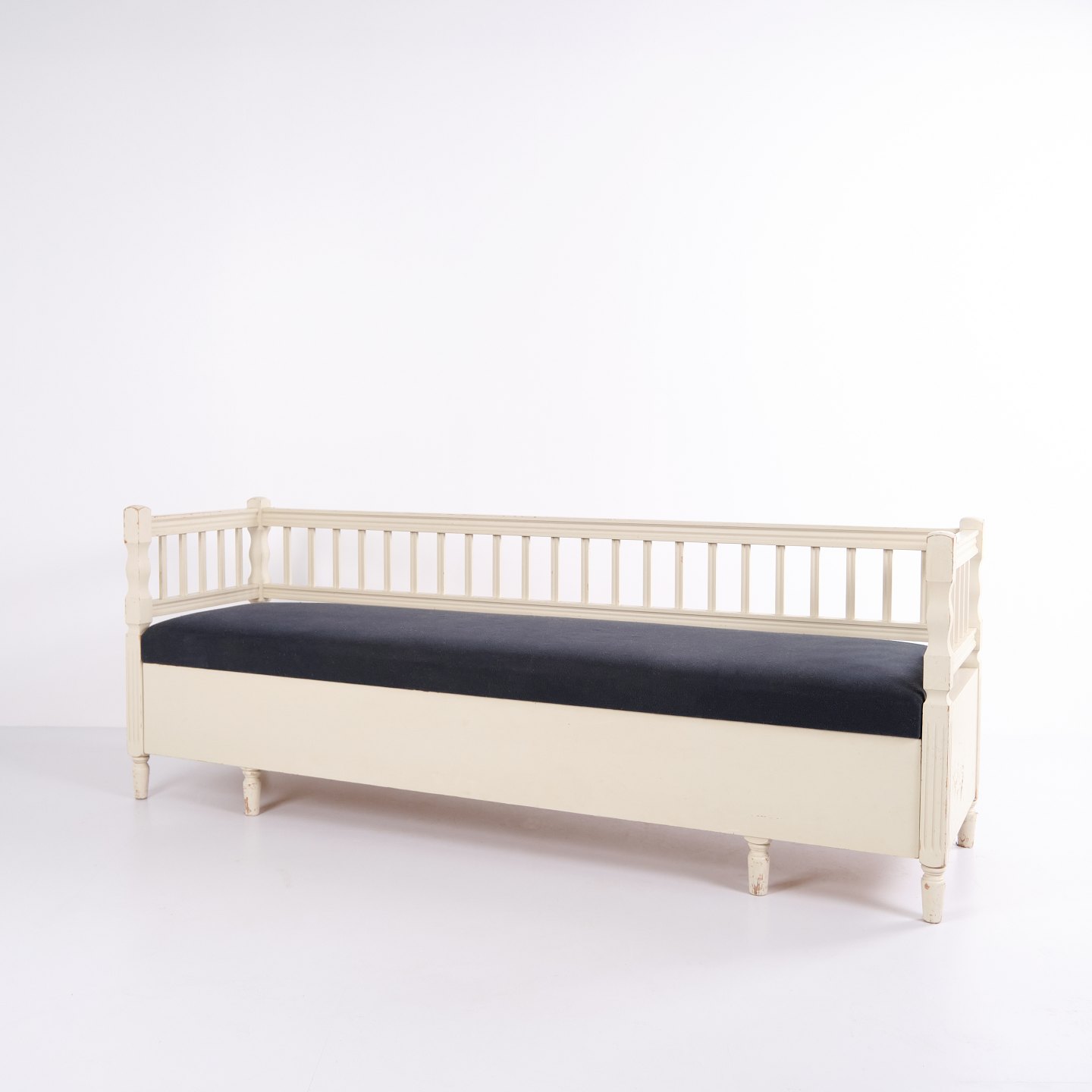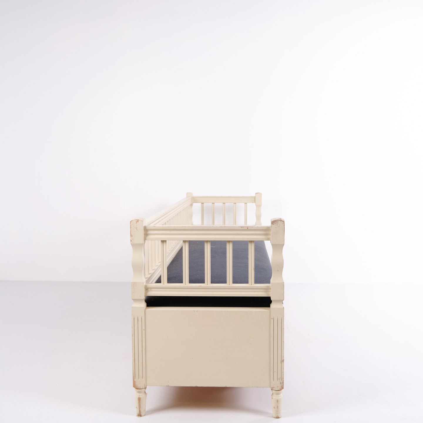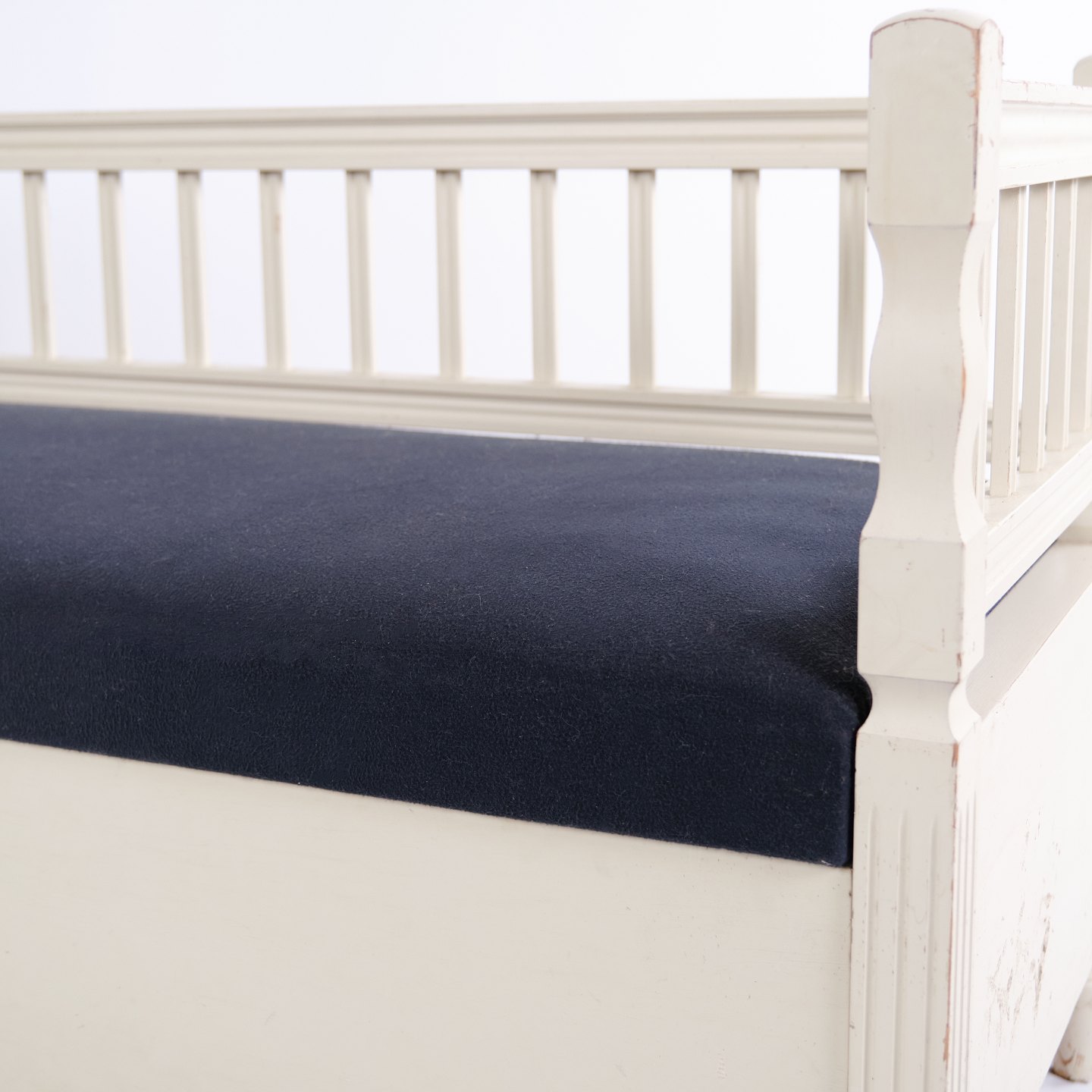 Banc coffre antique de style gustavien vers 1890. Peint en blanc avec assise rembourrée. Meuble classique avec patine et charme.