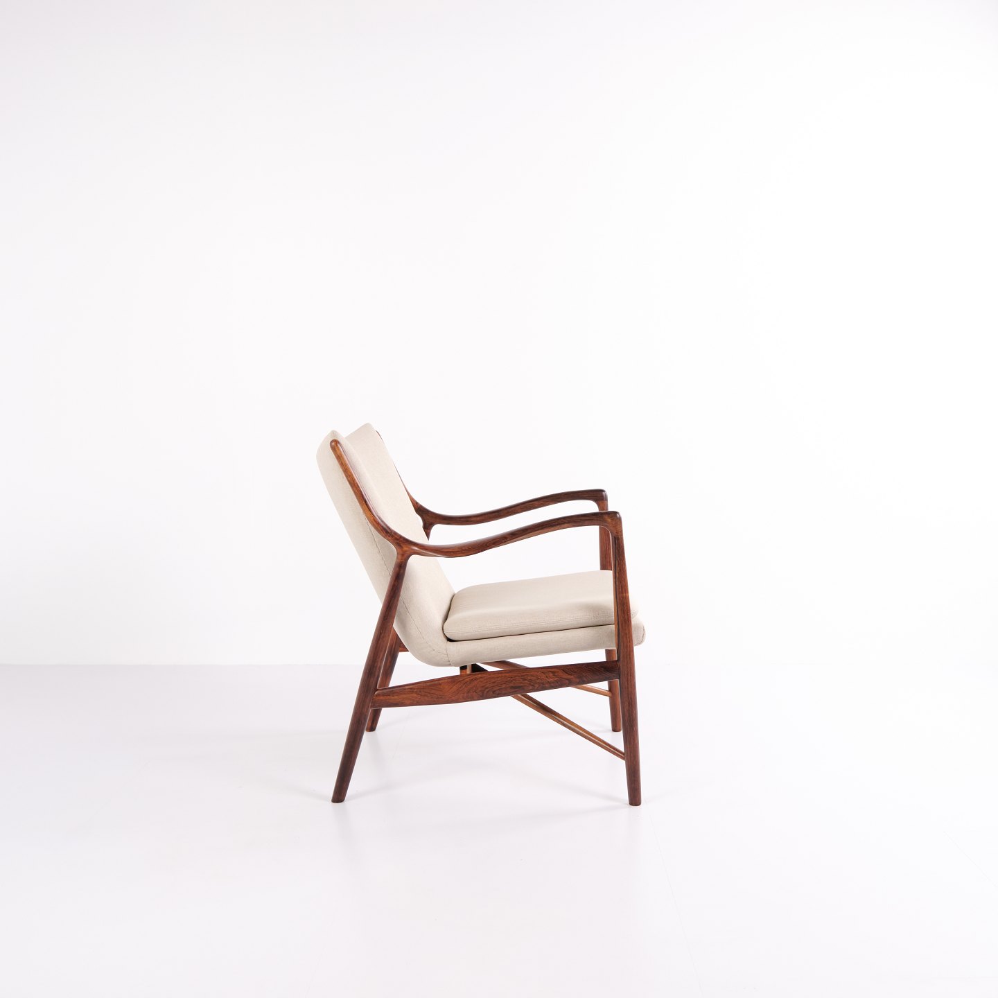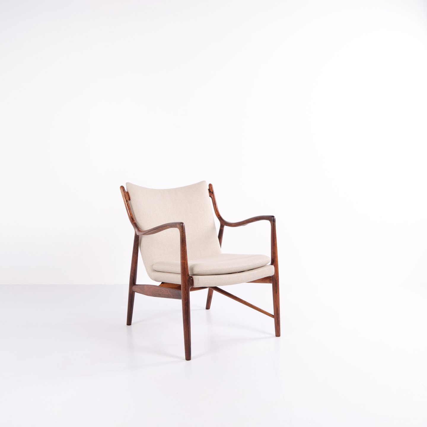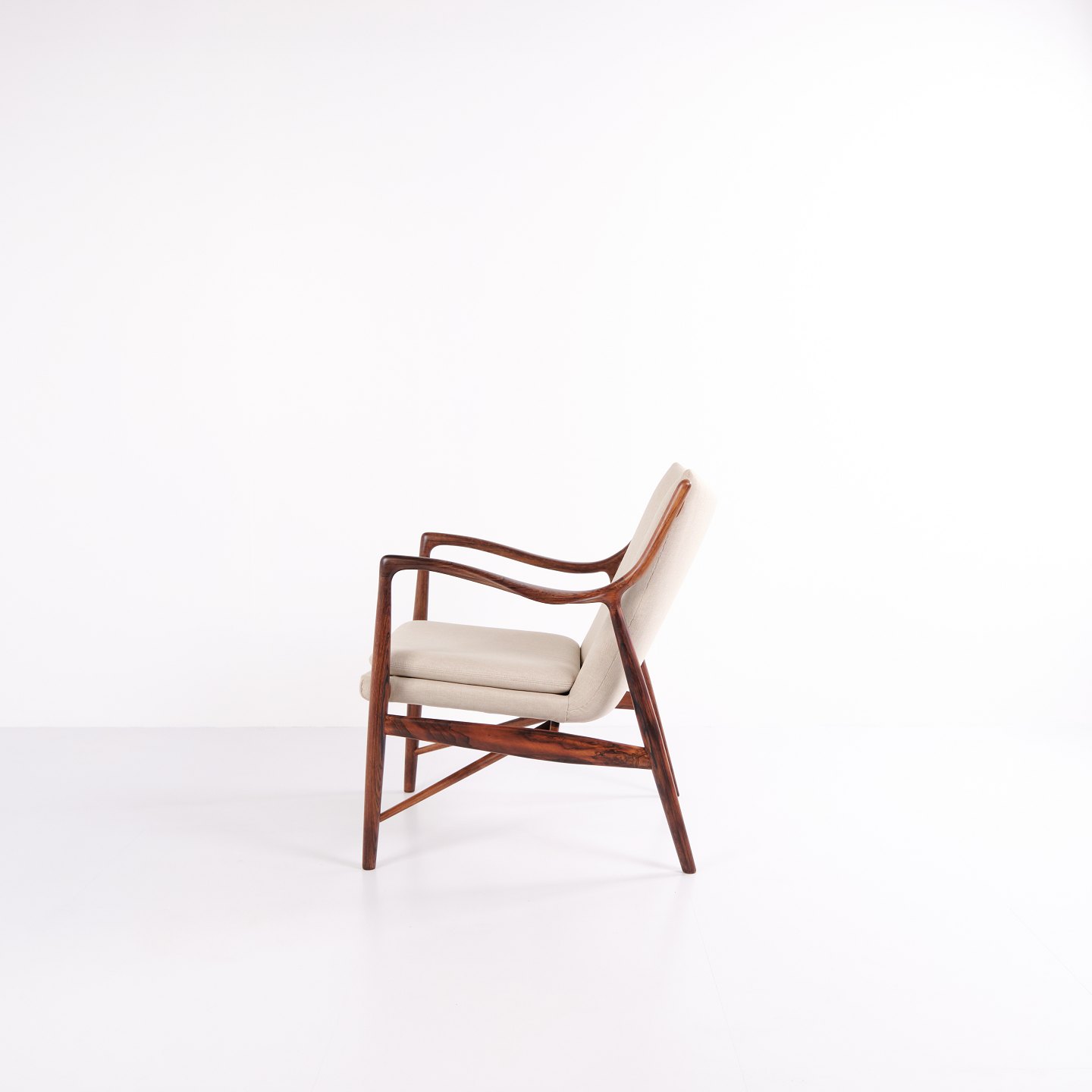 Fauteuil iconique, modèle NV45, conçu par Finn Juhl et réalisé par le maître ébéniste Niels Vodder dans les années 1950. Ce fauteuil en palissandre présente une assise et un dossier en porte-à-faux, revêtus d'un tissu léger, illustrant le style sculptural caractéristique de Finn Juhl et la légèreté de sa construction.