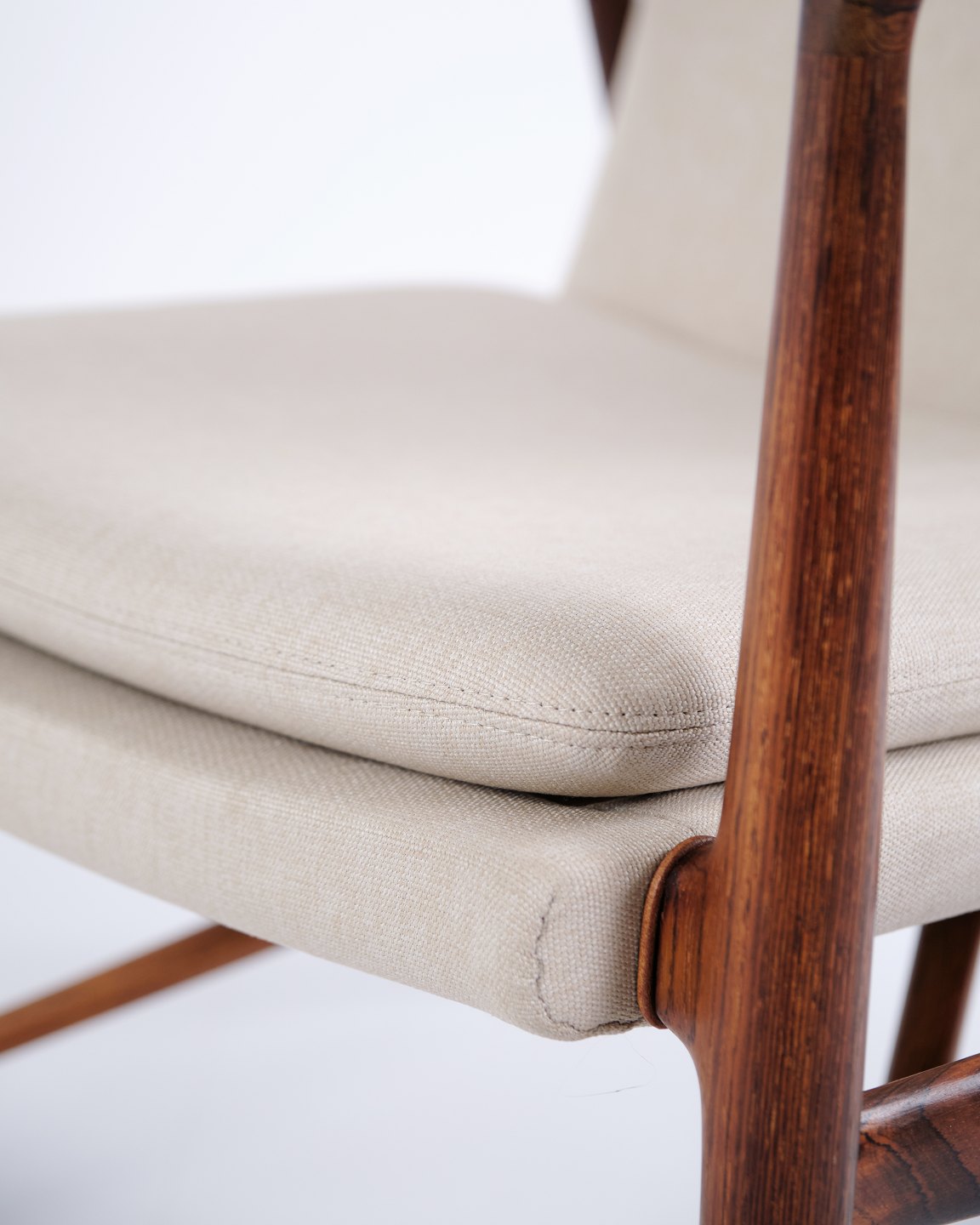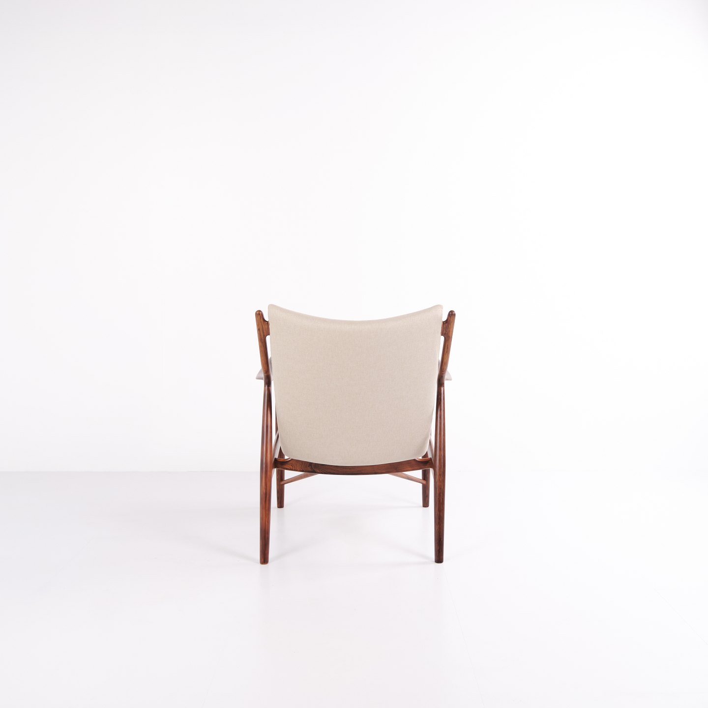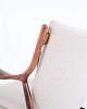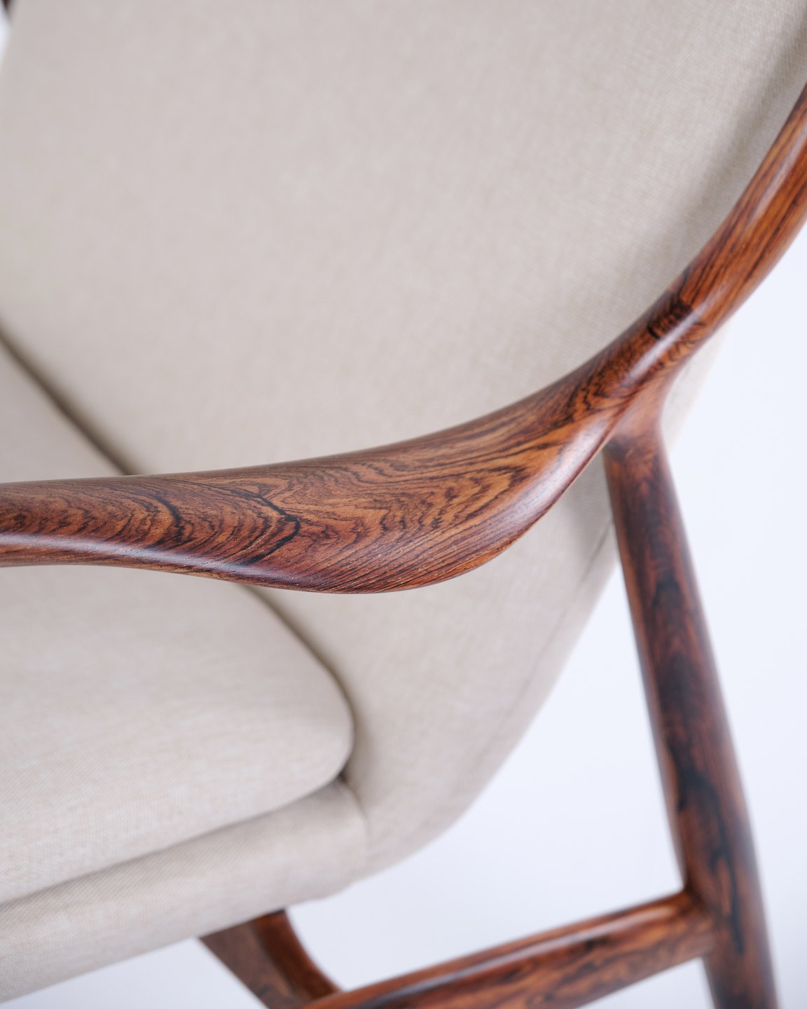 Fauteuil iconique, modèle NV45, conçu par Finn Juhl et réalisé par le maître ébéniste Niels Vodder dans les années 1950. Ce fauteuil en palissandre présente une assise et un dossier en porte-à-faux, revêtus d'un tissu léger, illustrant le style sculptural caractéristique de Finn Juhl et la légèreté de sa construction.