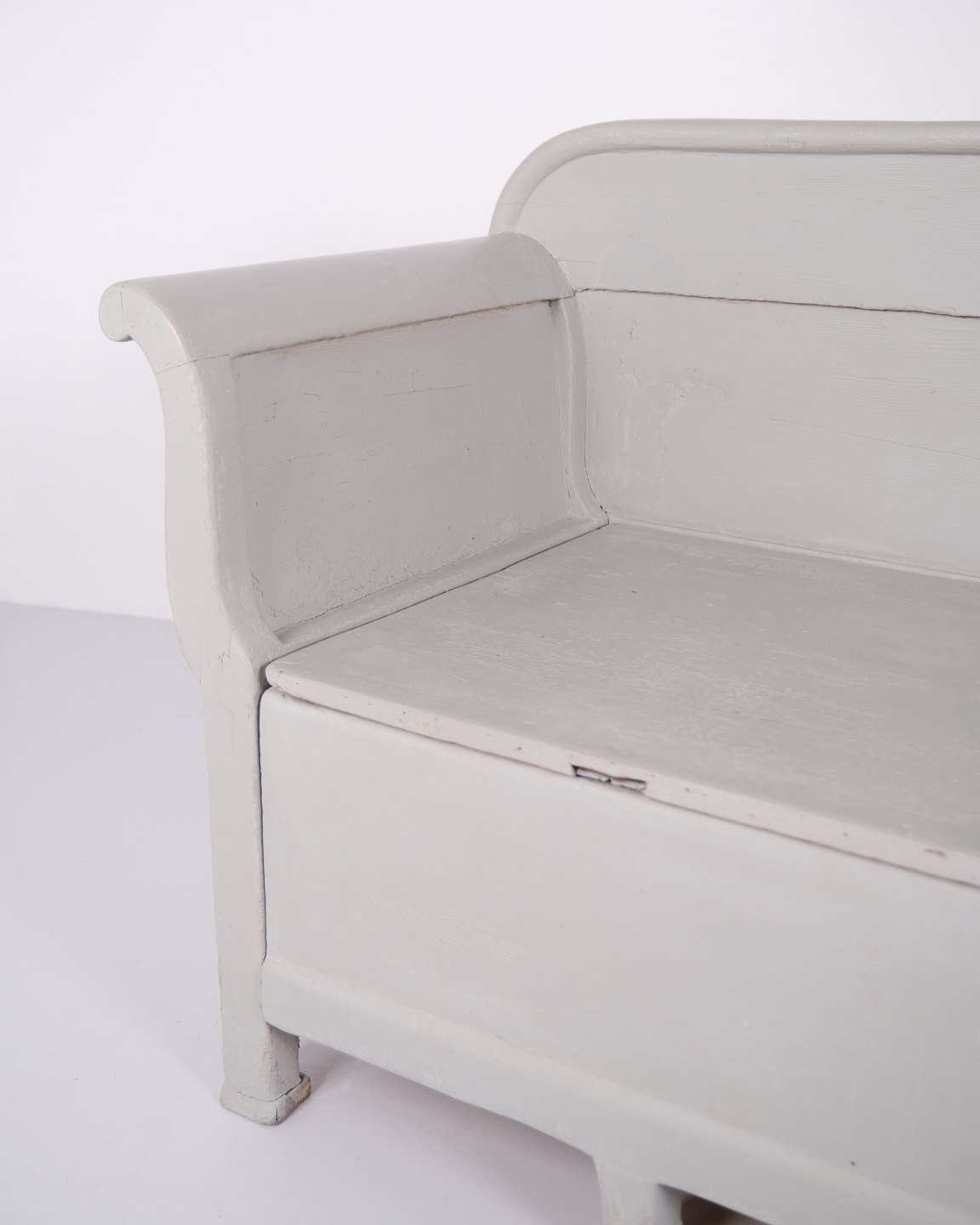 Antique storage bench from the 1890s in grey-painted pine wood. Antique storage bench from the 19th century.