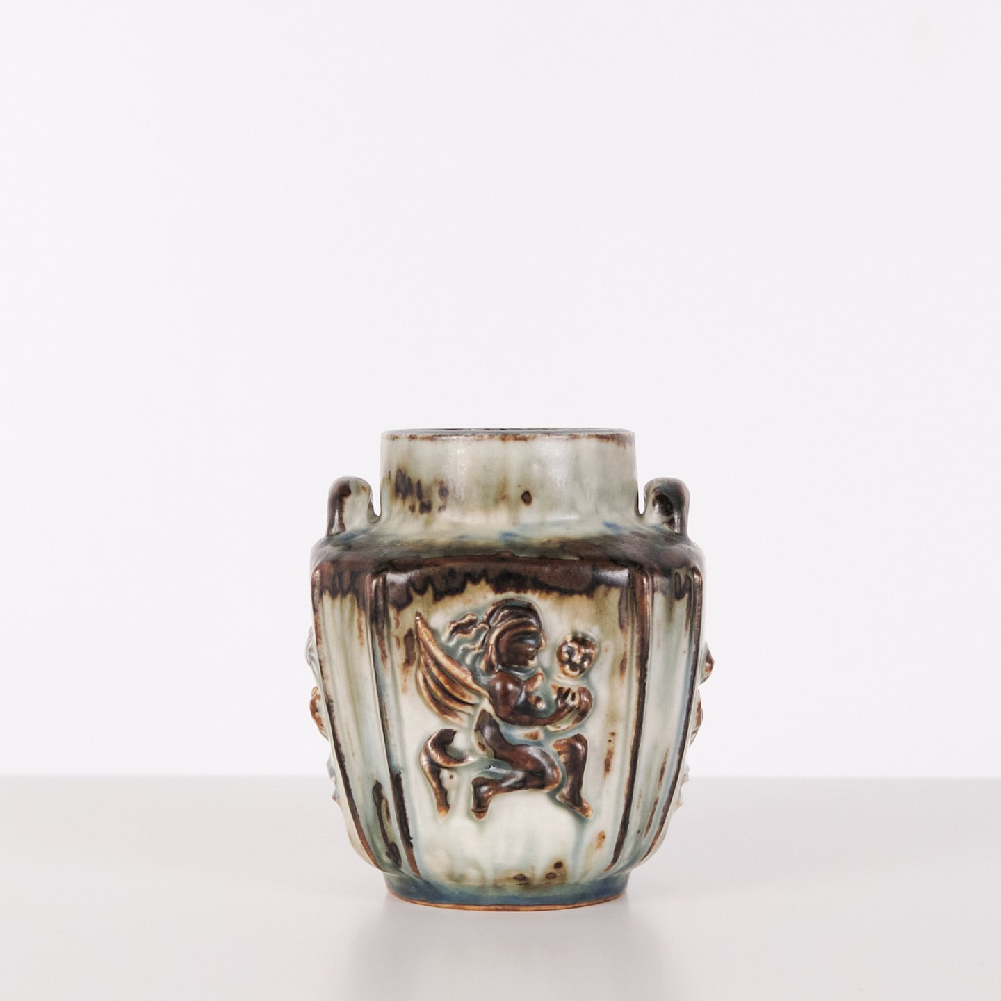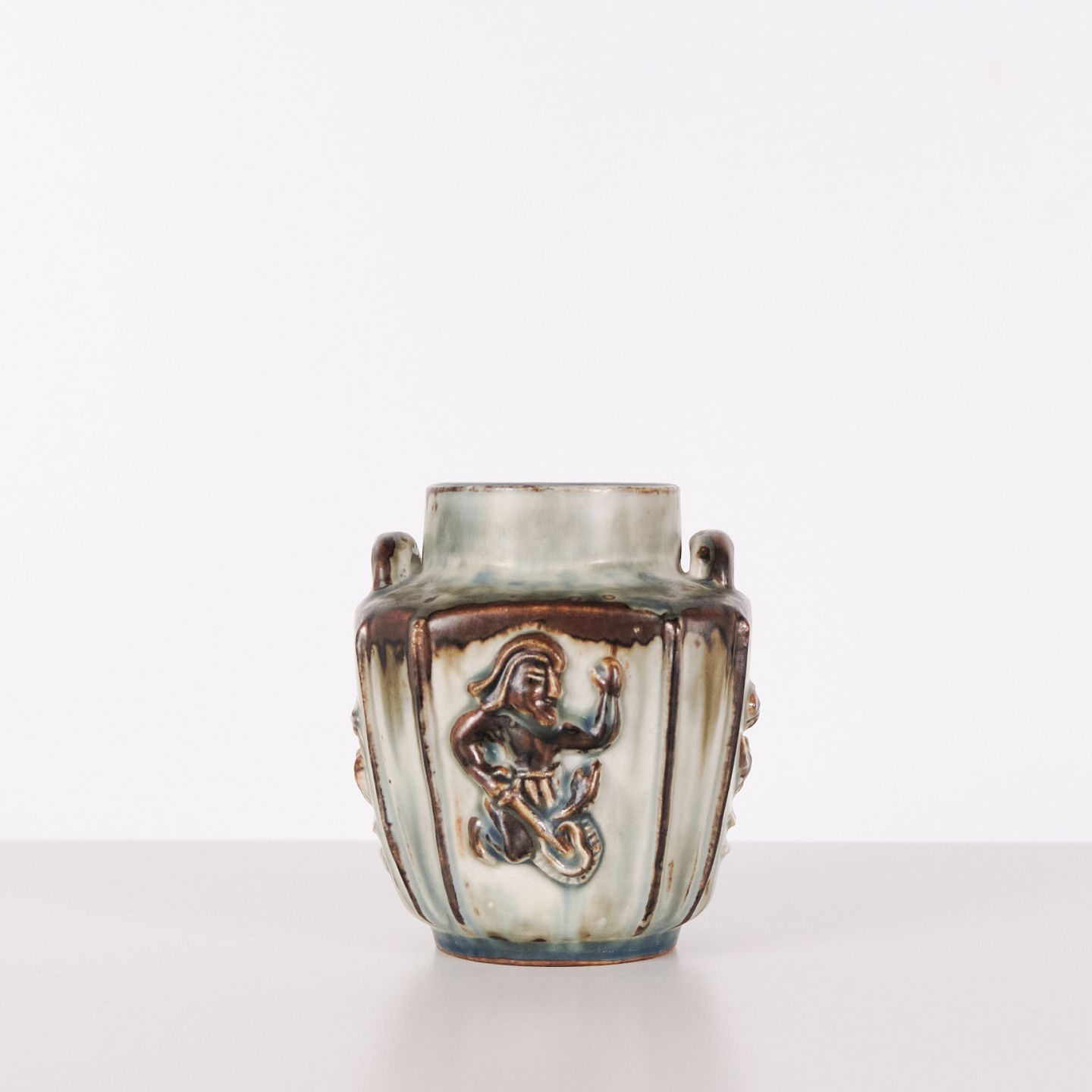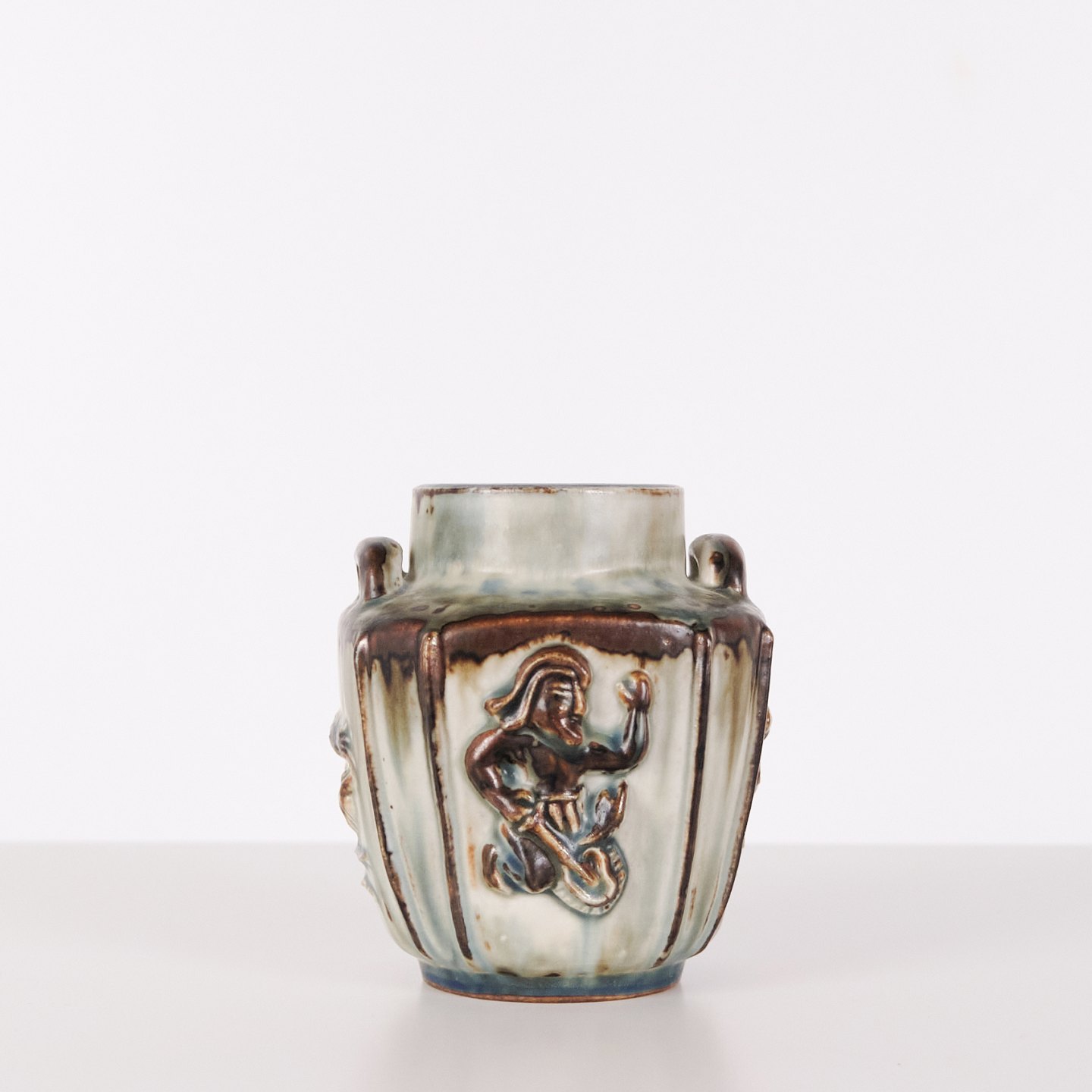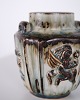Vase en grès conçue par Bode Willumsen pour Royal Copenhagen. La vase est décorée de motifs en relief et a été produite au Danemark par Royal Copenhagen entre 1969 et 1973. Signée avec monogramme et numéro de modèle 20121. Exemple du design céramique danois de la fin du XXe siècle.