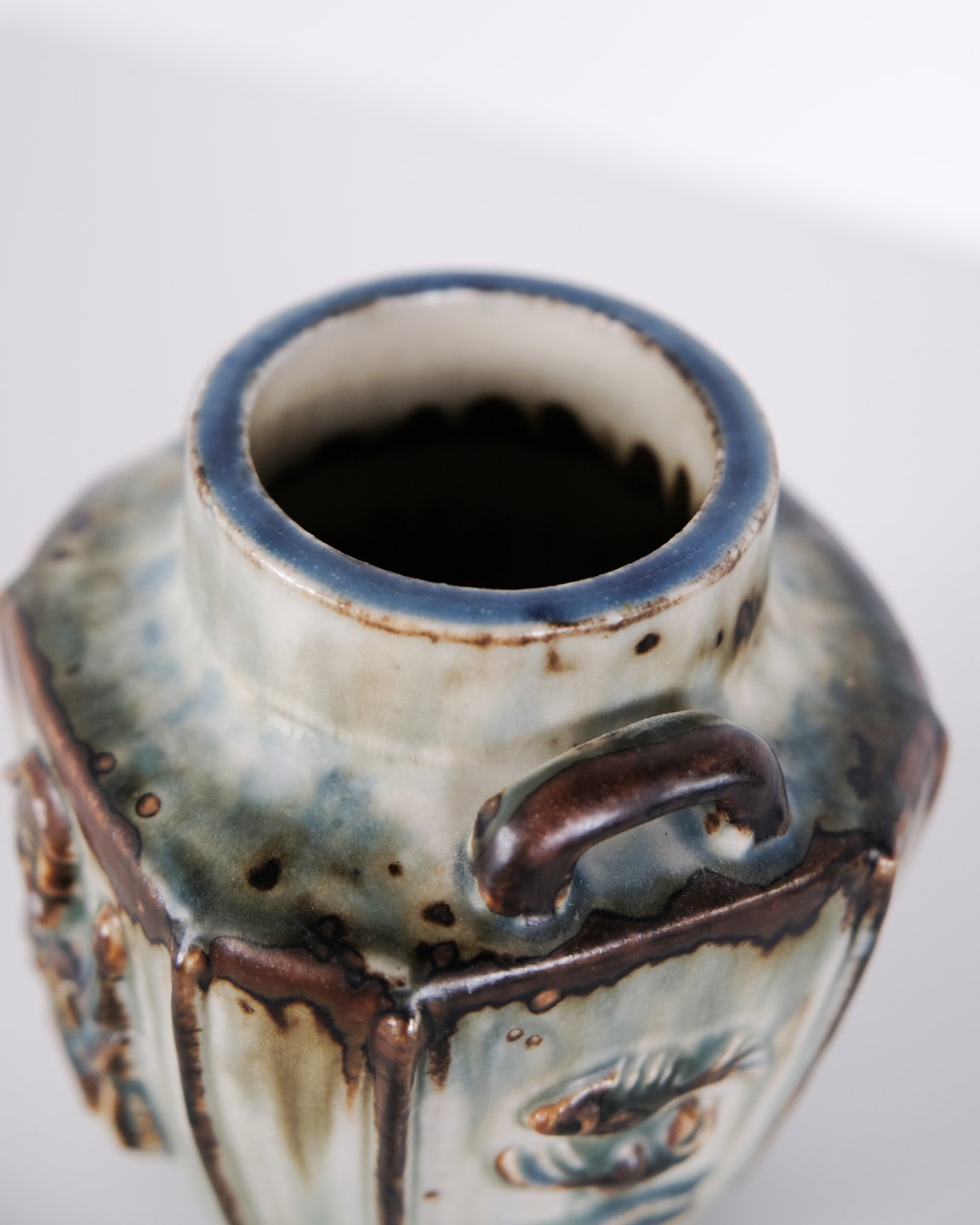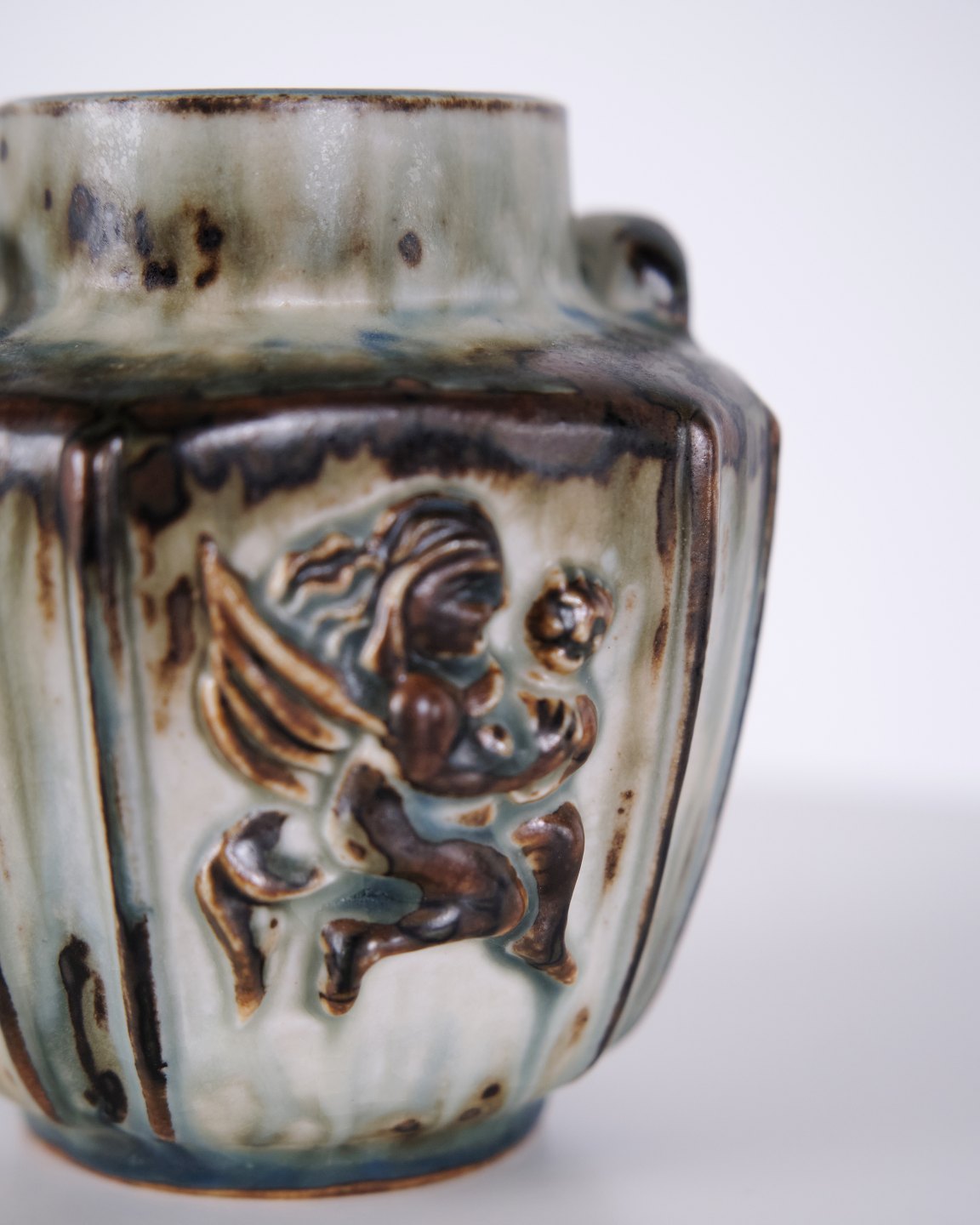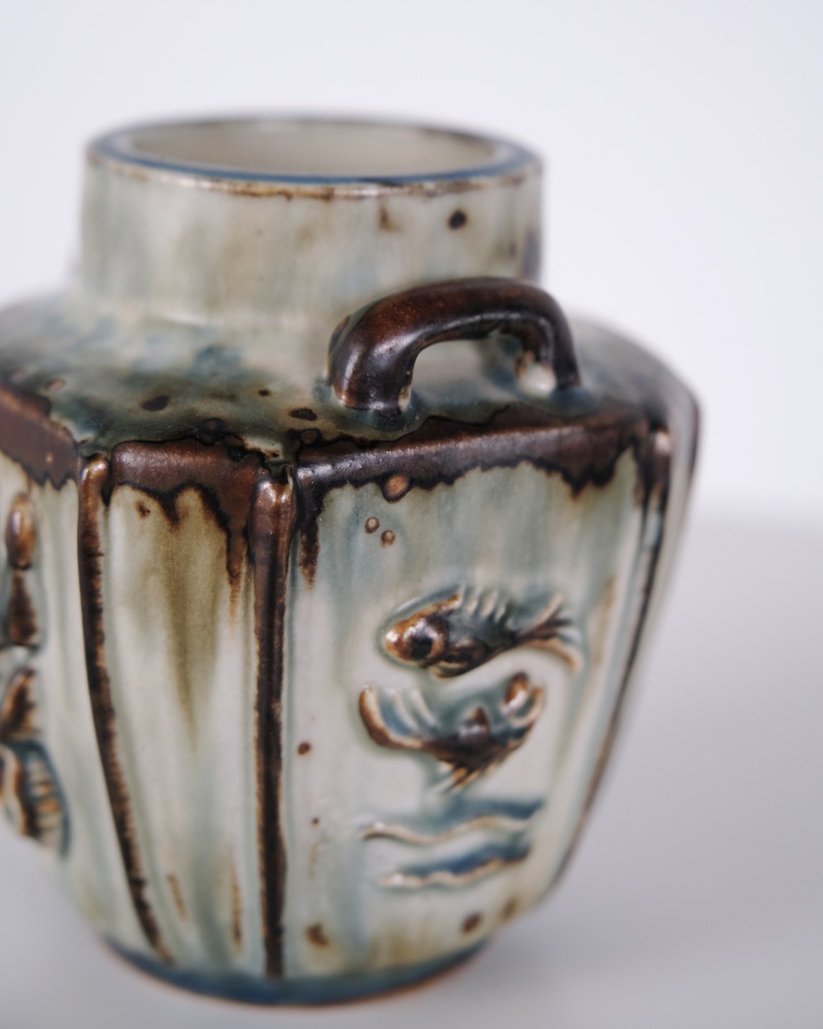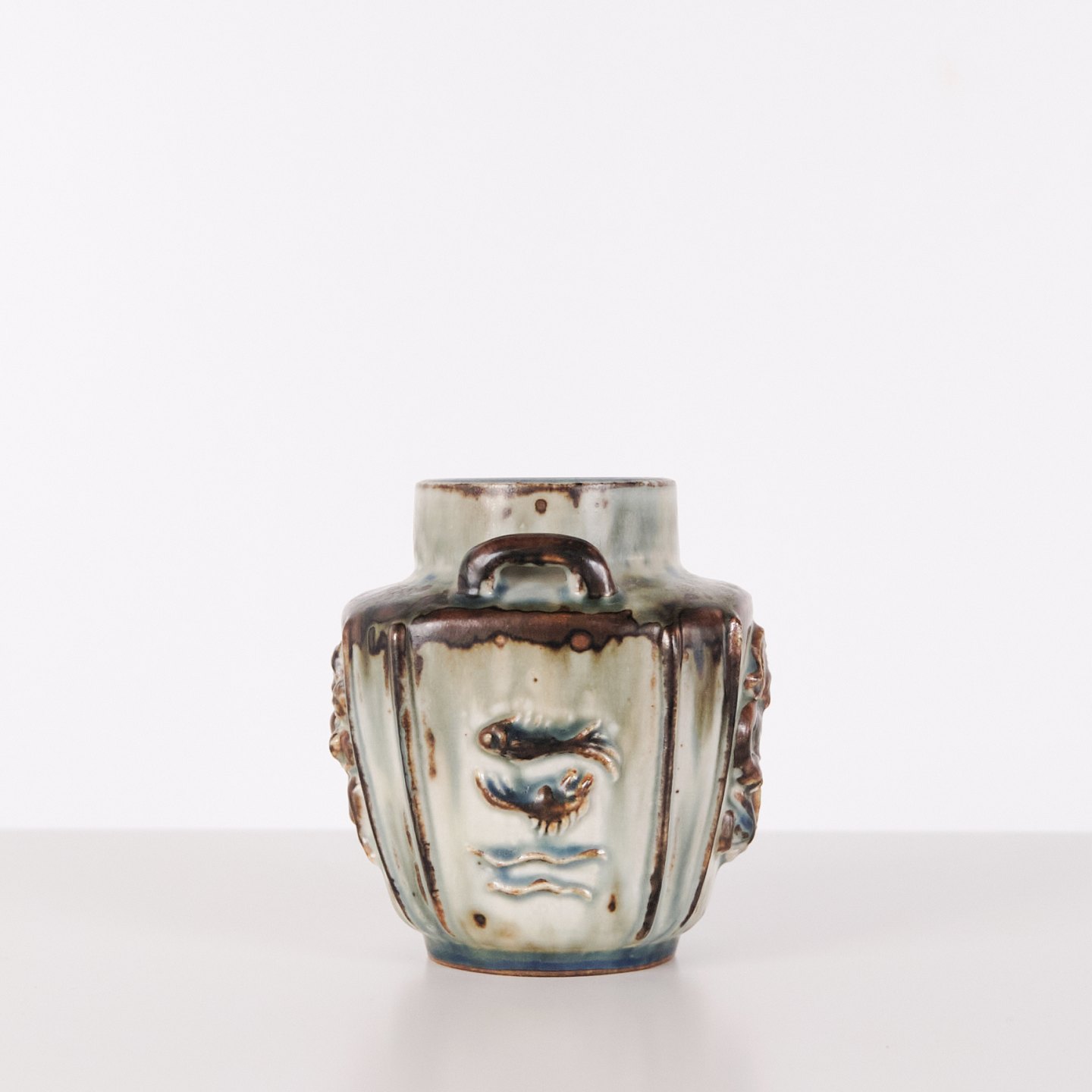 Vase en grès conçue par Bode Willumsen pour Royal Copenhagen. La vase est décorée de motifs en relief et a été produite au Danemark par Royal Copenhagen entre 1969 et 1973. Signée avec monogramme et numéro de modèle 20121. Exemple du design céramique danois de la fin du XXe siècle.