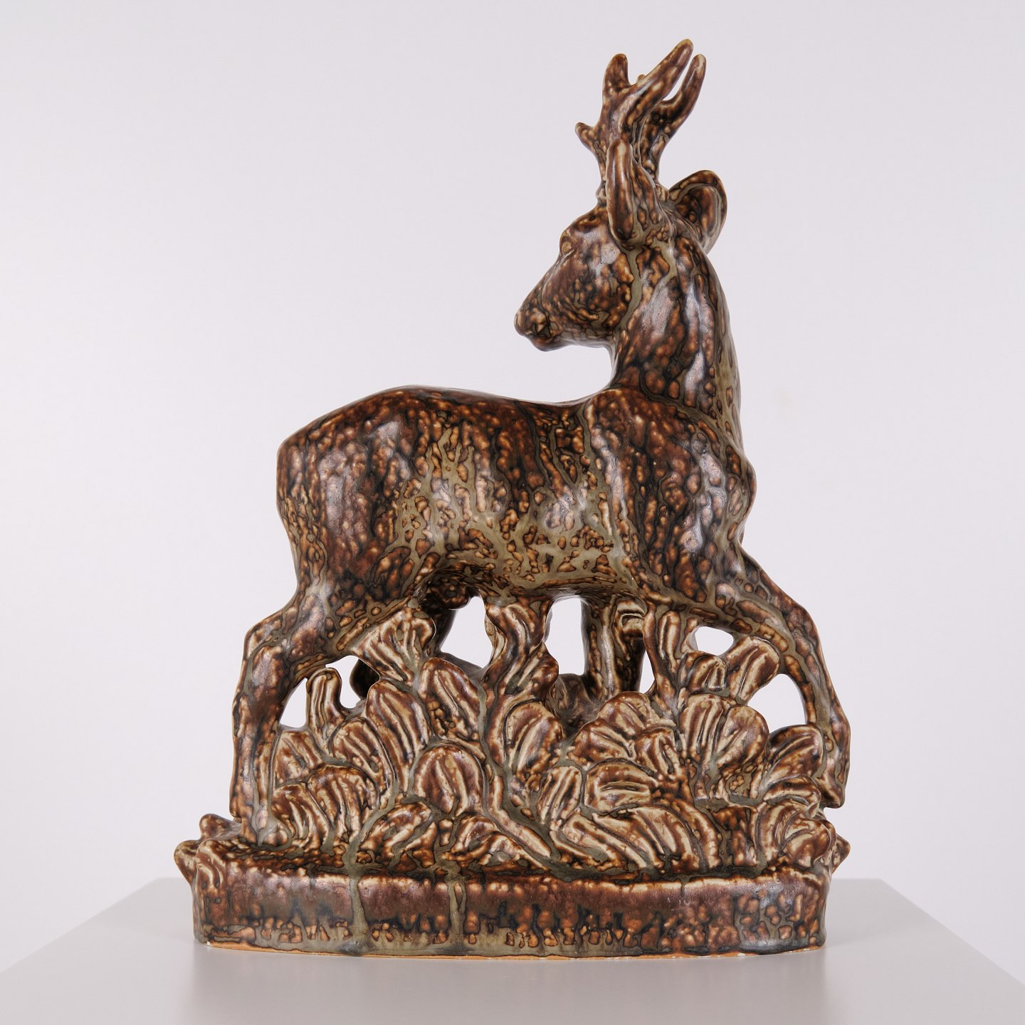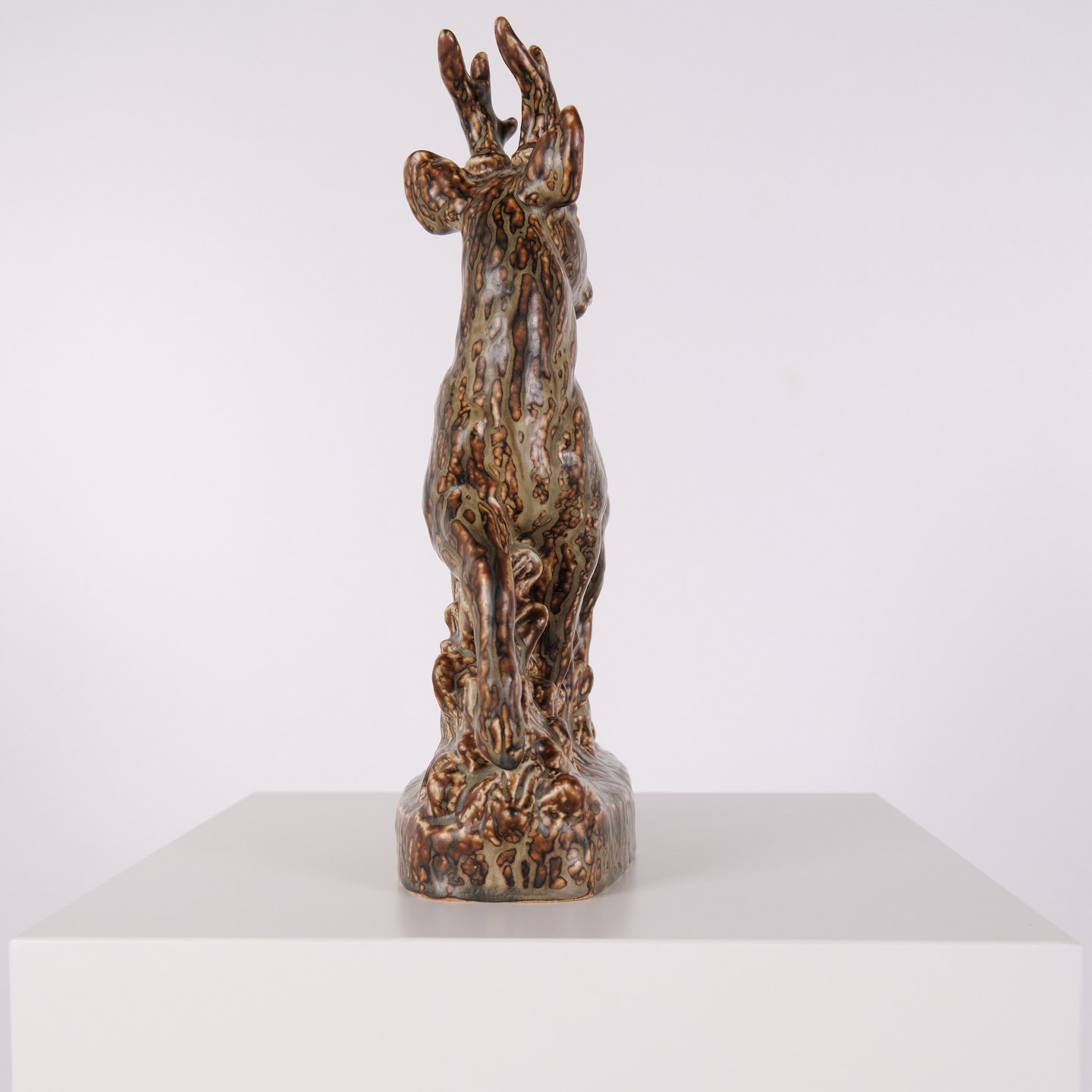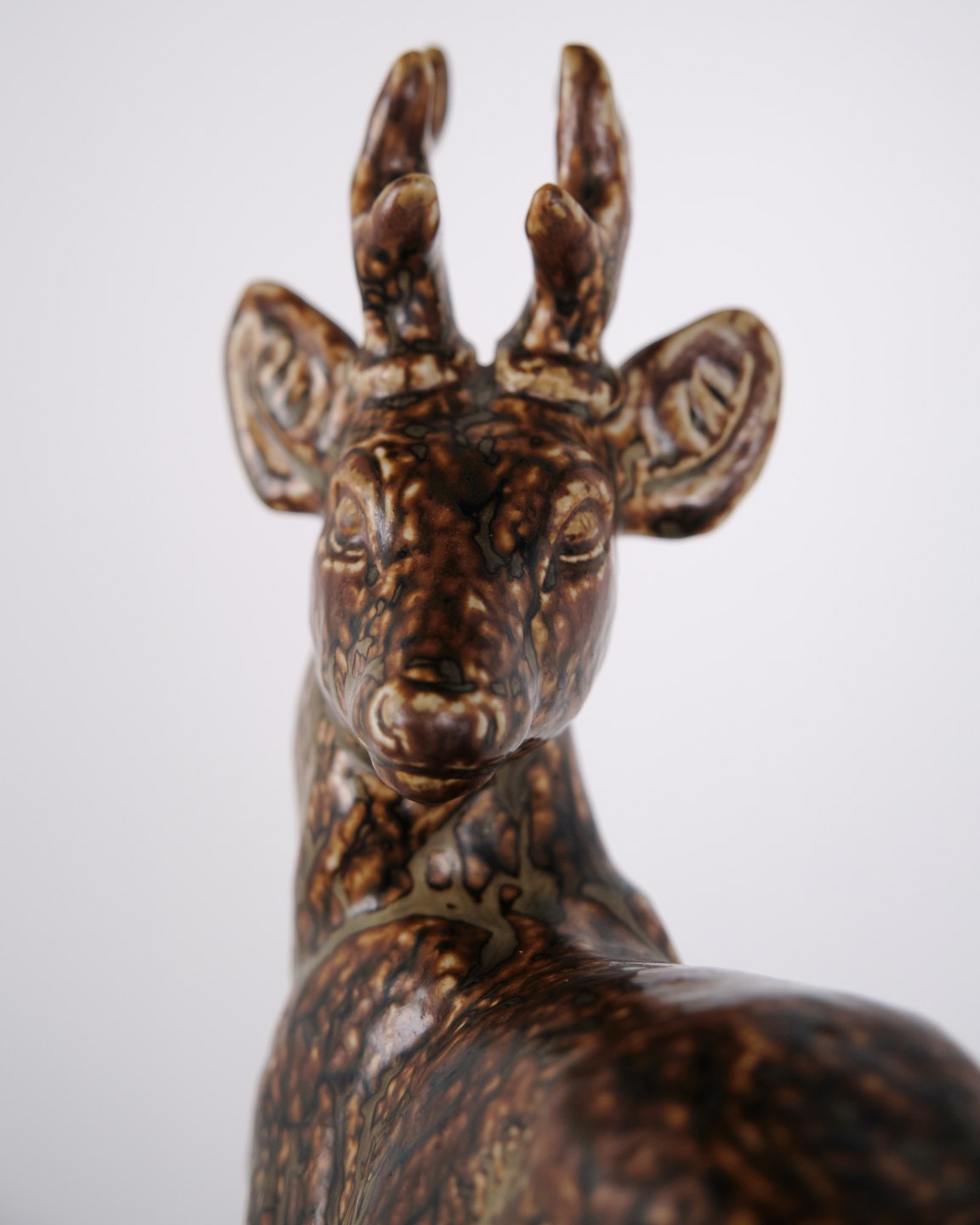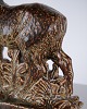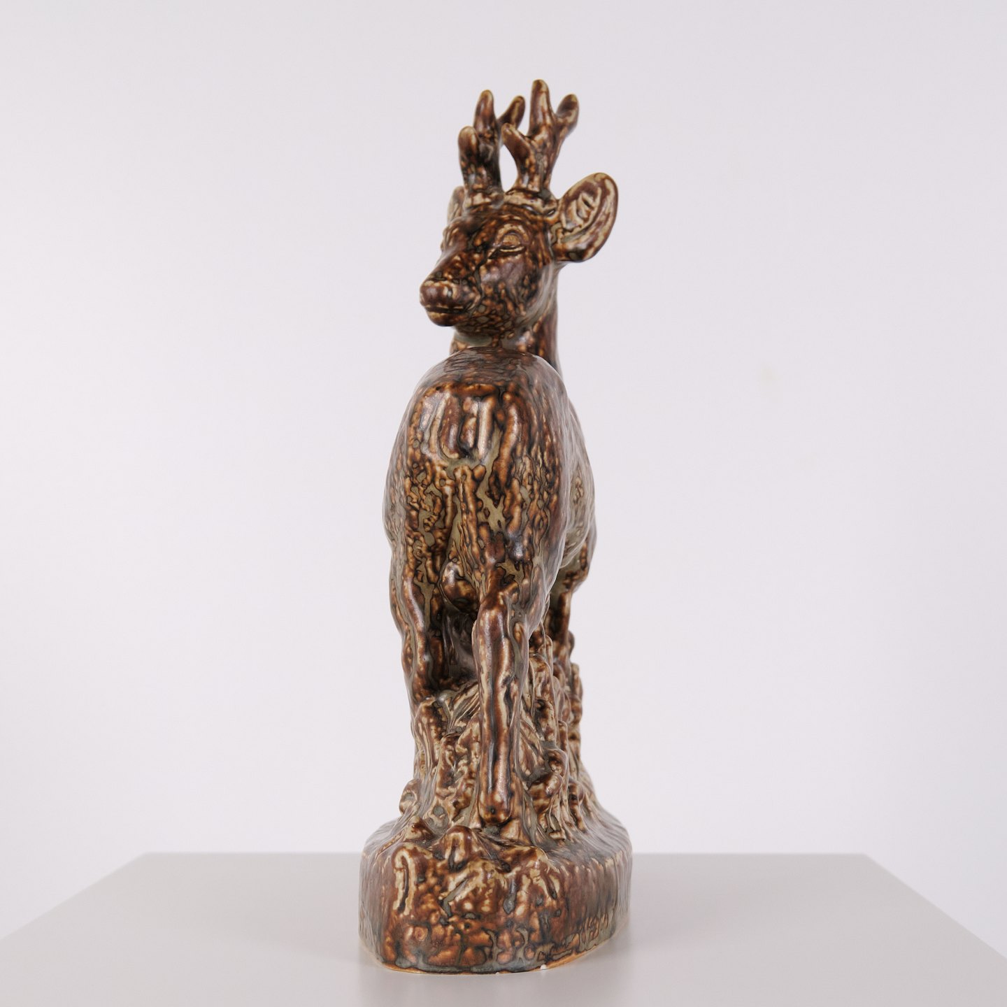Figure en grès représentant un cerf debout, modèle n° 21333, conçue par Knud Kyhn pour Royal Copenhagen. Réalisée en grès, cette pièce fait partie des sculptures animalières de Knud Kyhn produites chez Royal Copenhagen au milieu du XXe siècle.