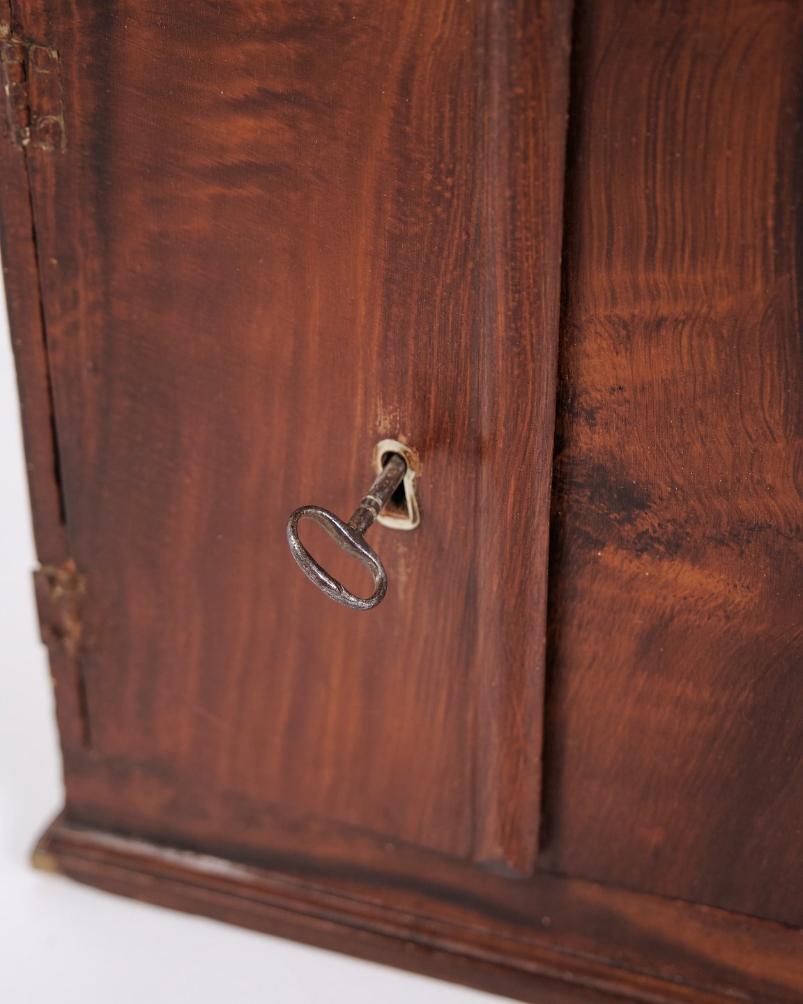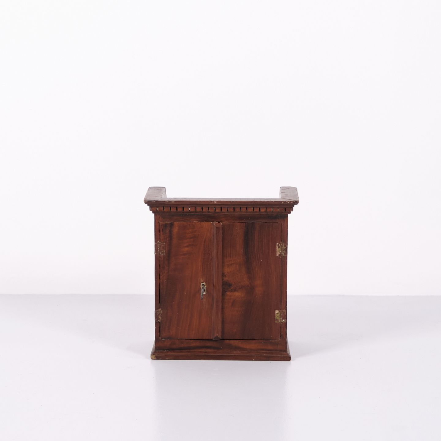 Meuble miniature antique en chêne avec ferrures forgées à la main datant des années 1840. Objet de collection unique et décoratif avec un caractère historique.