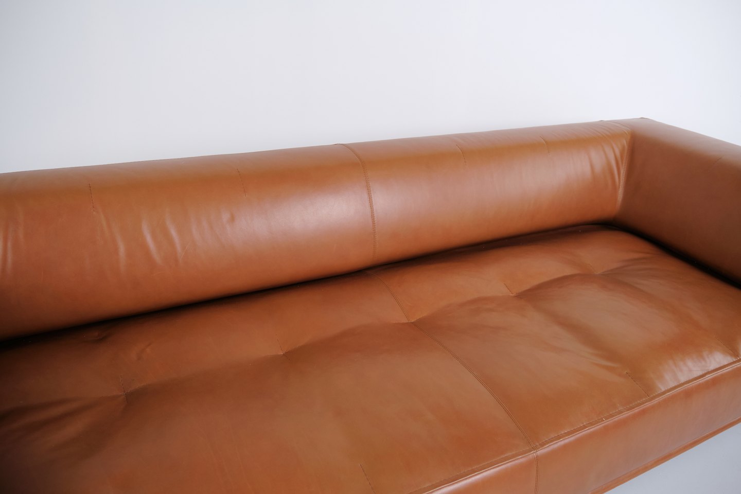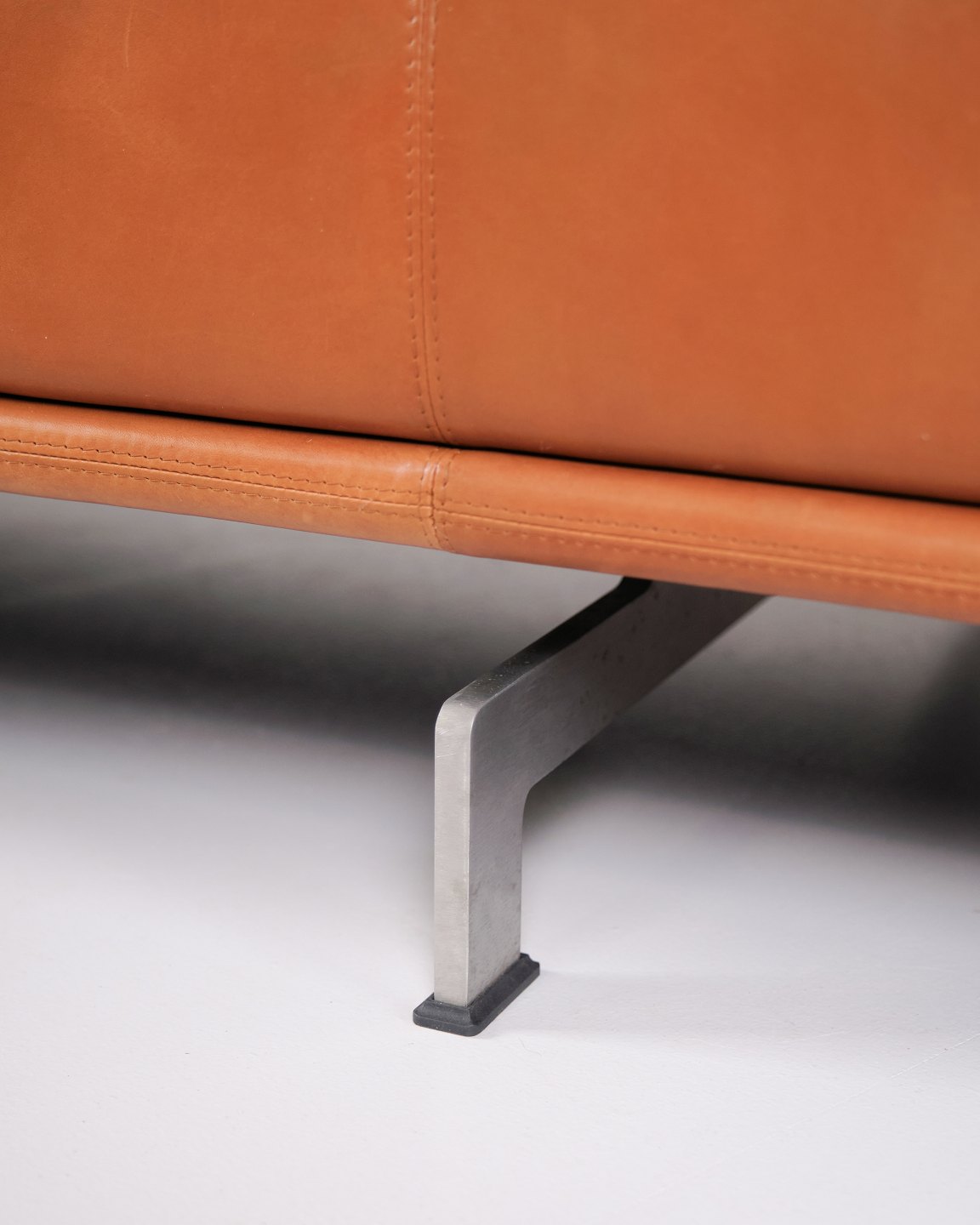 Canapé Delphi modèle EJ 450 d’Erik Jørgensen conçu par Hannes Wettstein en cuir cognac avec structure en aluminium brossé. Design scandinave moderne.