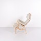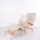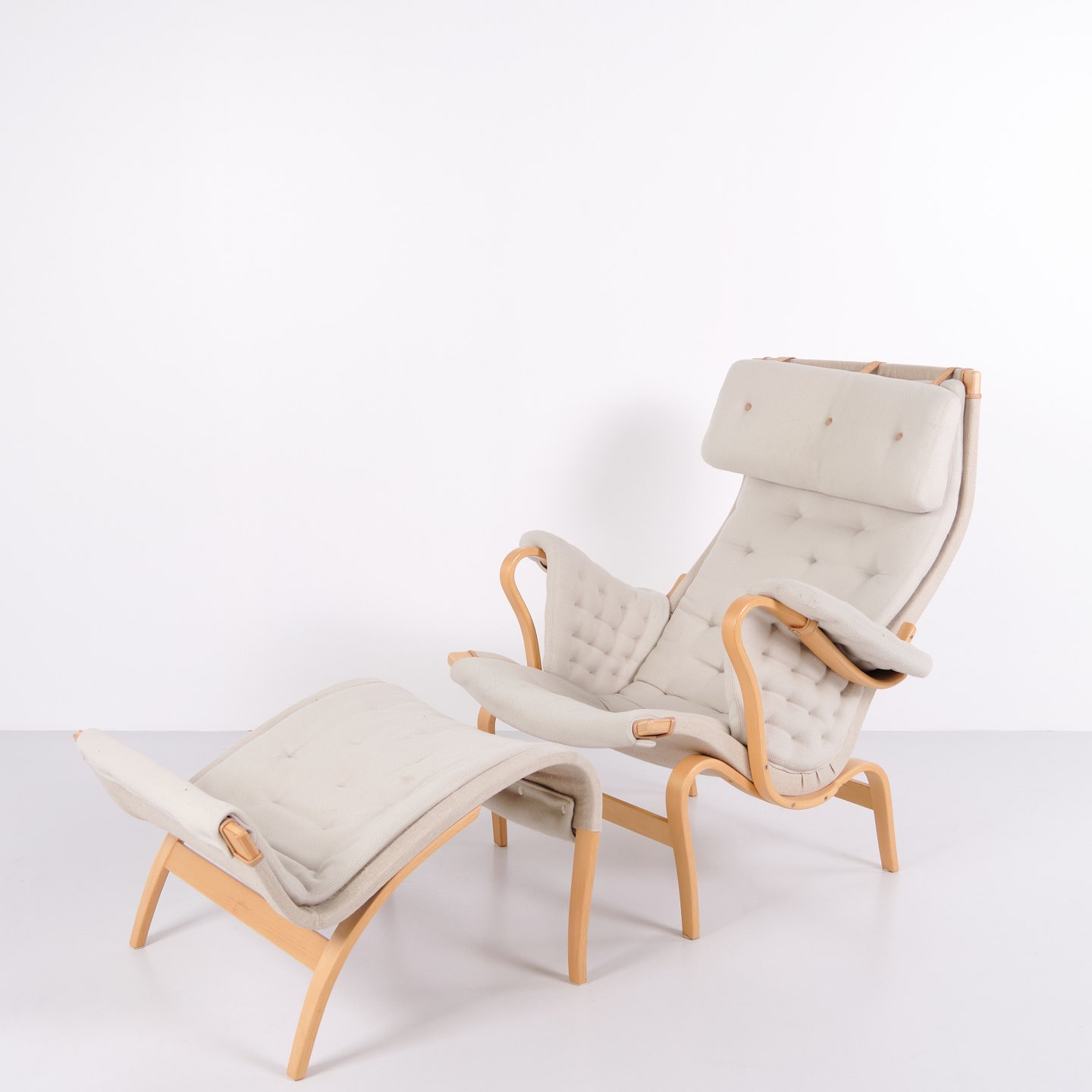 Fauteuil Pernilla avec repose-pieds assorti, modèle 69, conçu par Bruno Mathsson et fabriqué par DUX en édition 35e anniversaire. Le fauteuil est réalisé en bois de hêtre avec un revêtement en tissu clair et présente un design ergonomique caractéristique qui suit les courbes naturelles du corps et assure un grand confort.