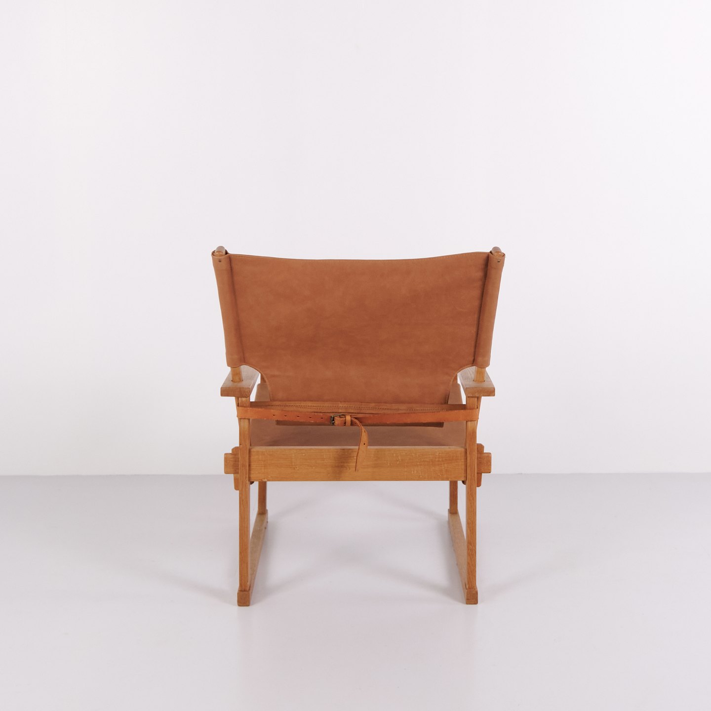 Fauteuil, modèle 60, conçu par Kai Winding en 1961 et produit par Poul Hundevad au Danemark. Le fauteuil est réalisé en chêne massif avec assise et dossier en cuir épais, offrant une expression classique et intemporelle.