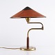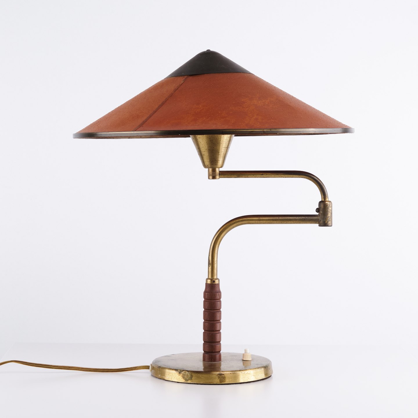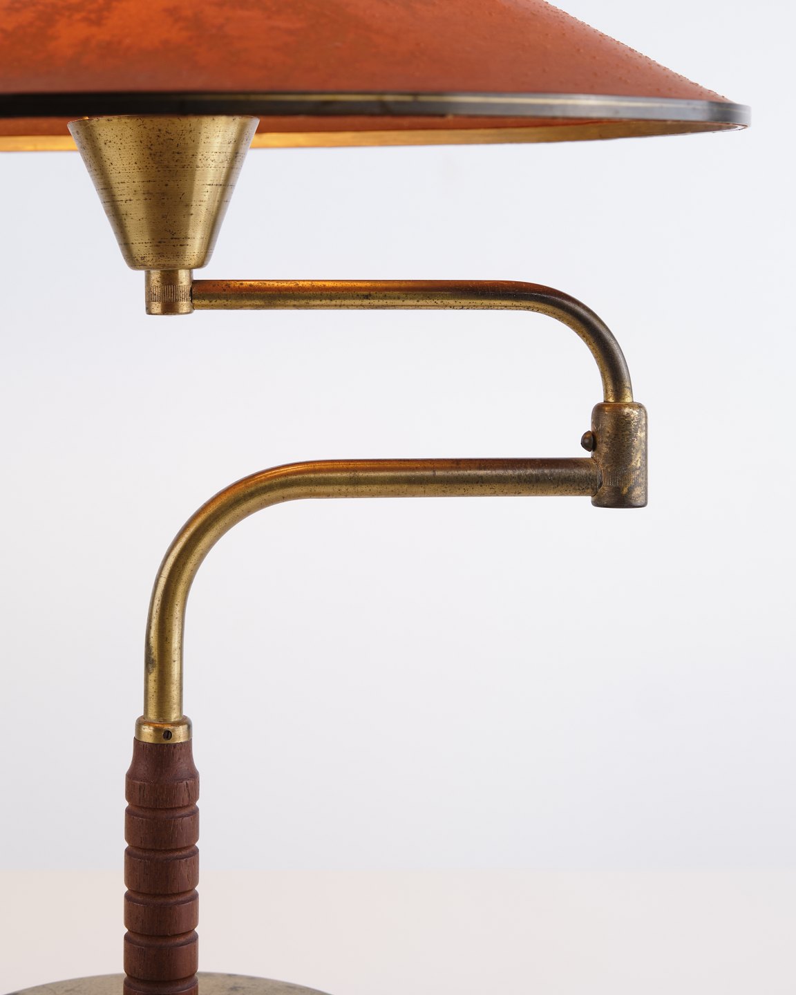 Lampe de table LYFA des années 1930/40 en laiton patiné avec bras pivotant et abat-jour d’origine couleur ambre en peau de porc. Éclairage danois classique.