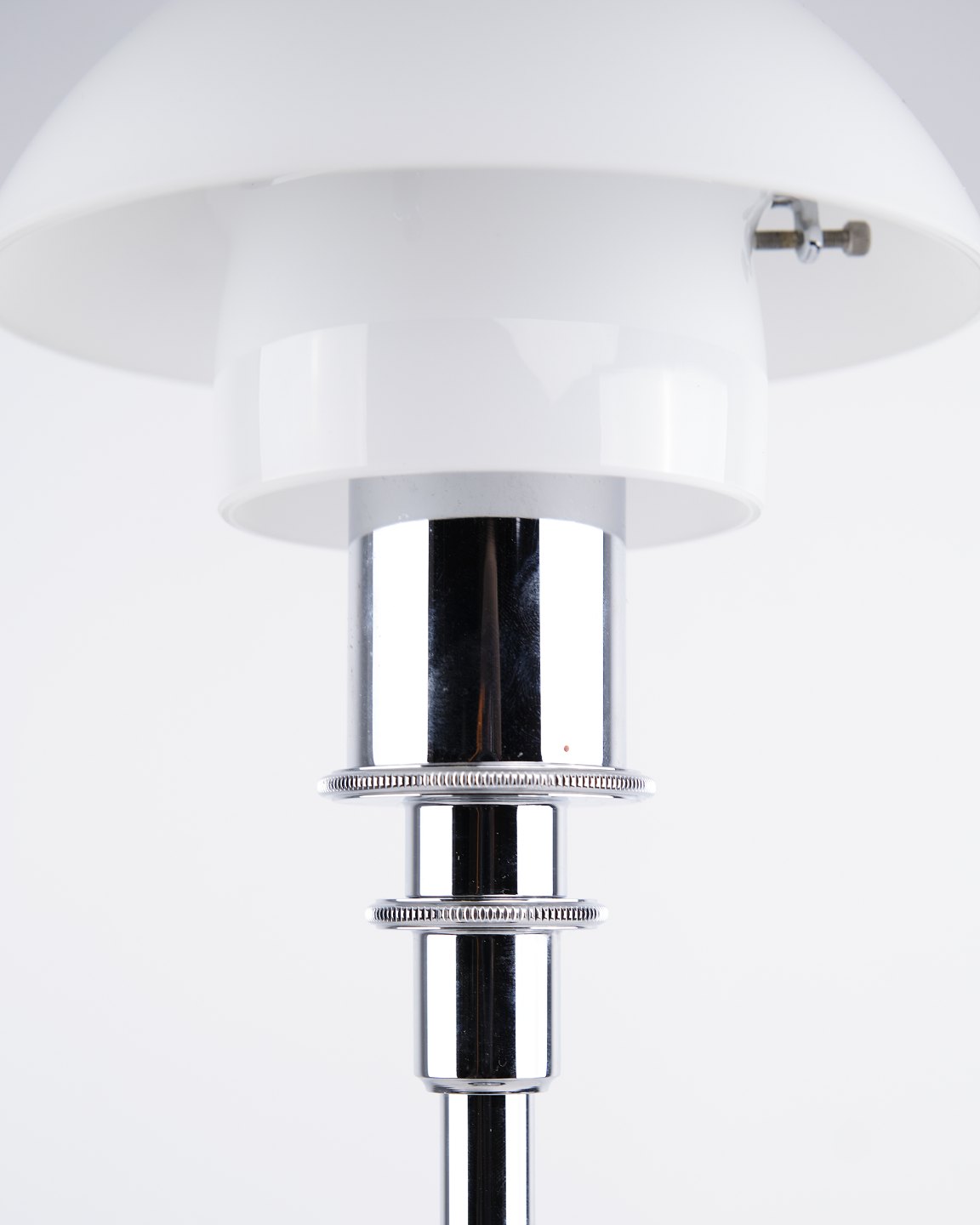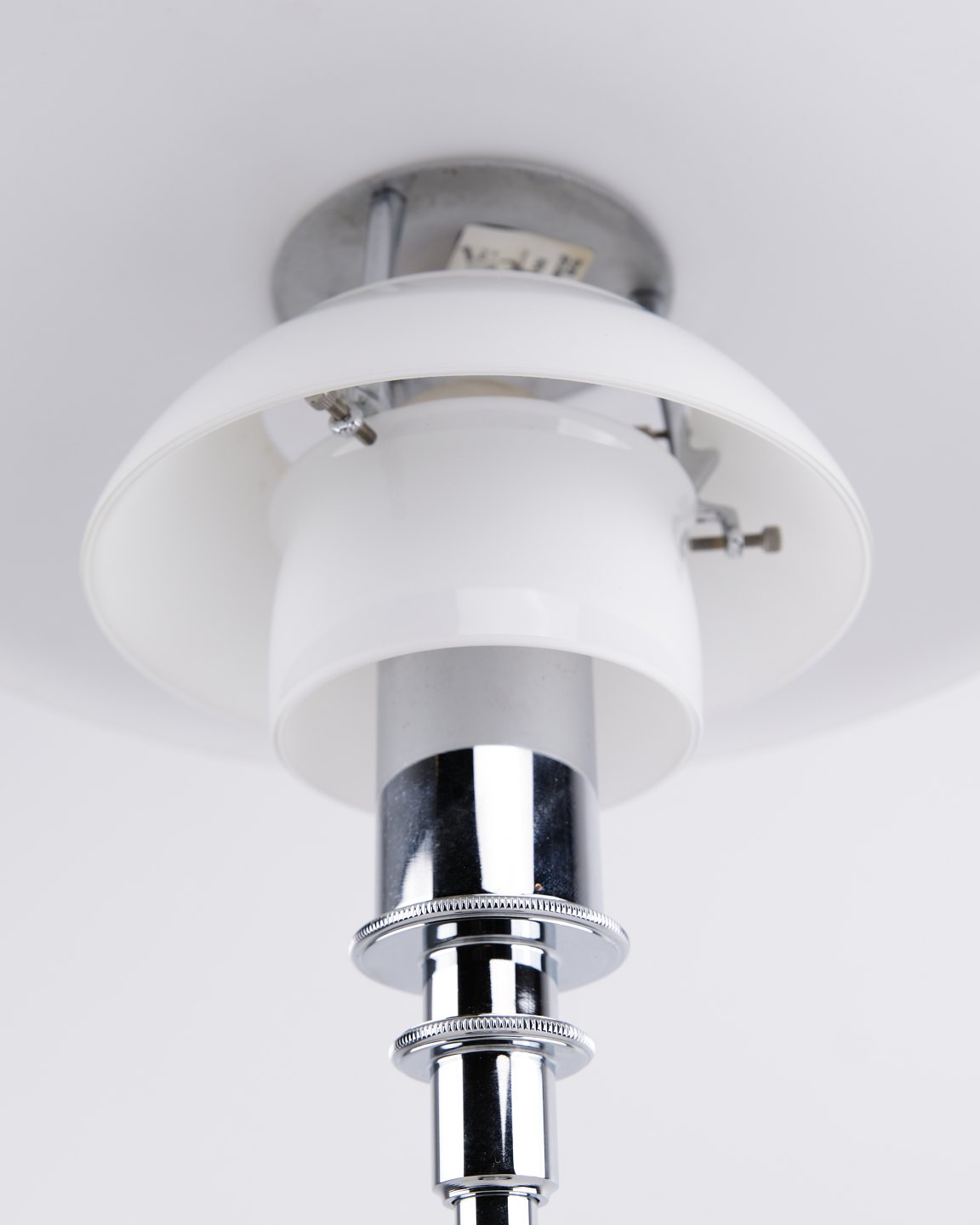 Lampe de table PH 3/2 conçue par Poul Henningsen et fabriquée par Louis Poulsen. La lampe est réalisée avec des abat-jours en verre opalin blanc, assurant une lumière douce et sans éblouissement. Le système iconique à trois abat-jours est développé pour une répartition optimale de la lumière et constitue un élément central de la philosophie de design de Henningsen.