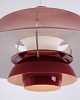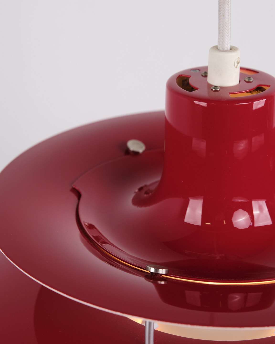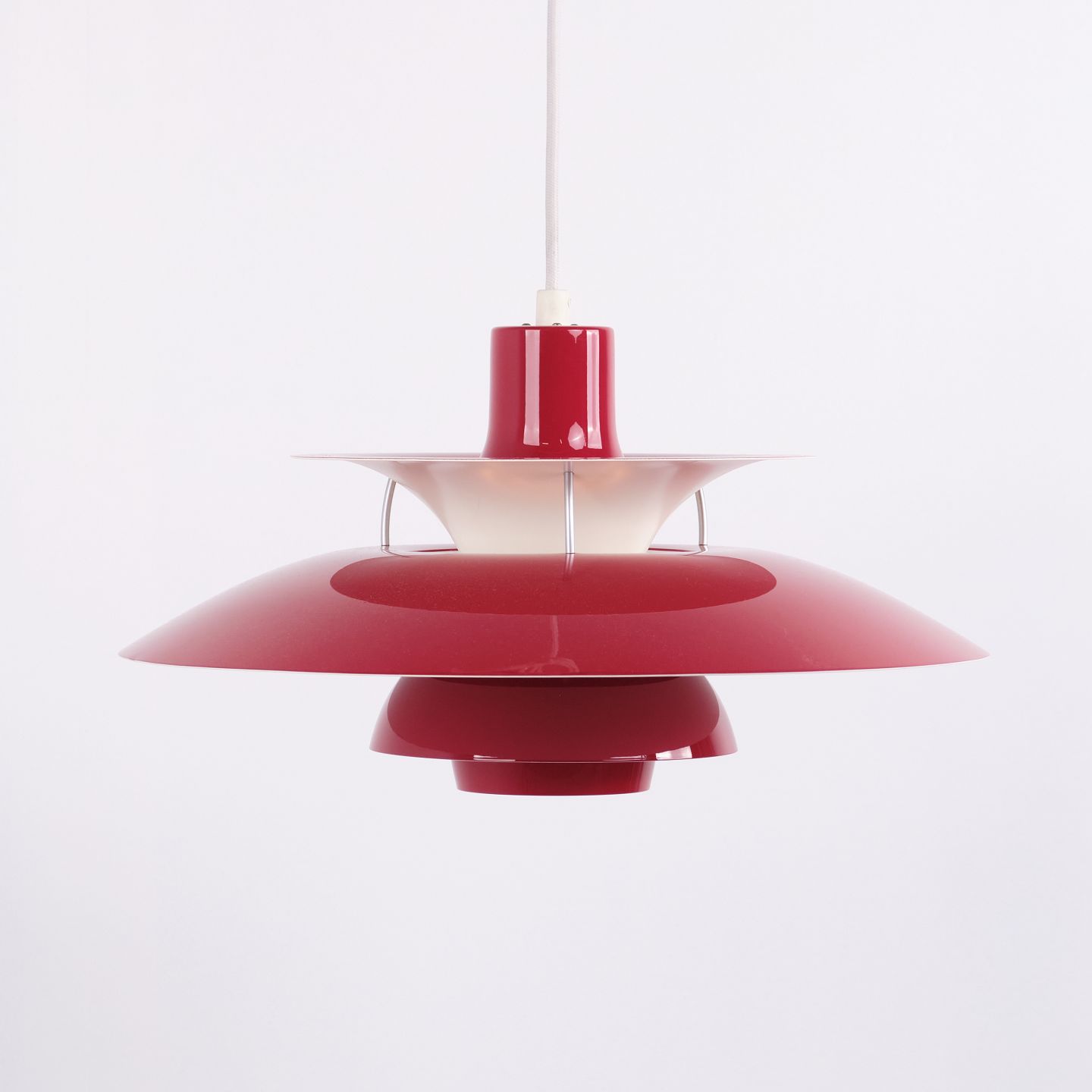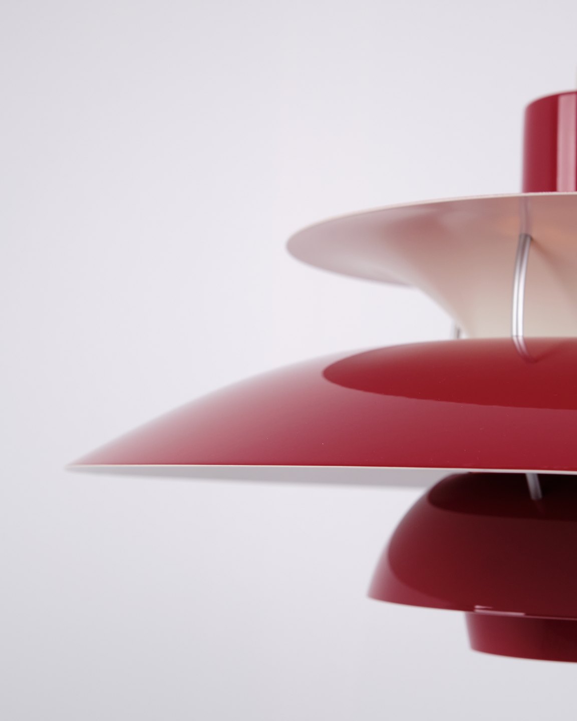 Suspension PH 5 en métal laqué rouge de Louis Poulsen conçue par Poul Henningsen. Lampe danoise classique avec une lumière fonctionnelle et sans éblouissement.