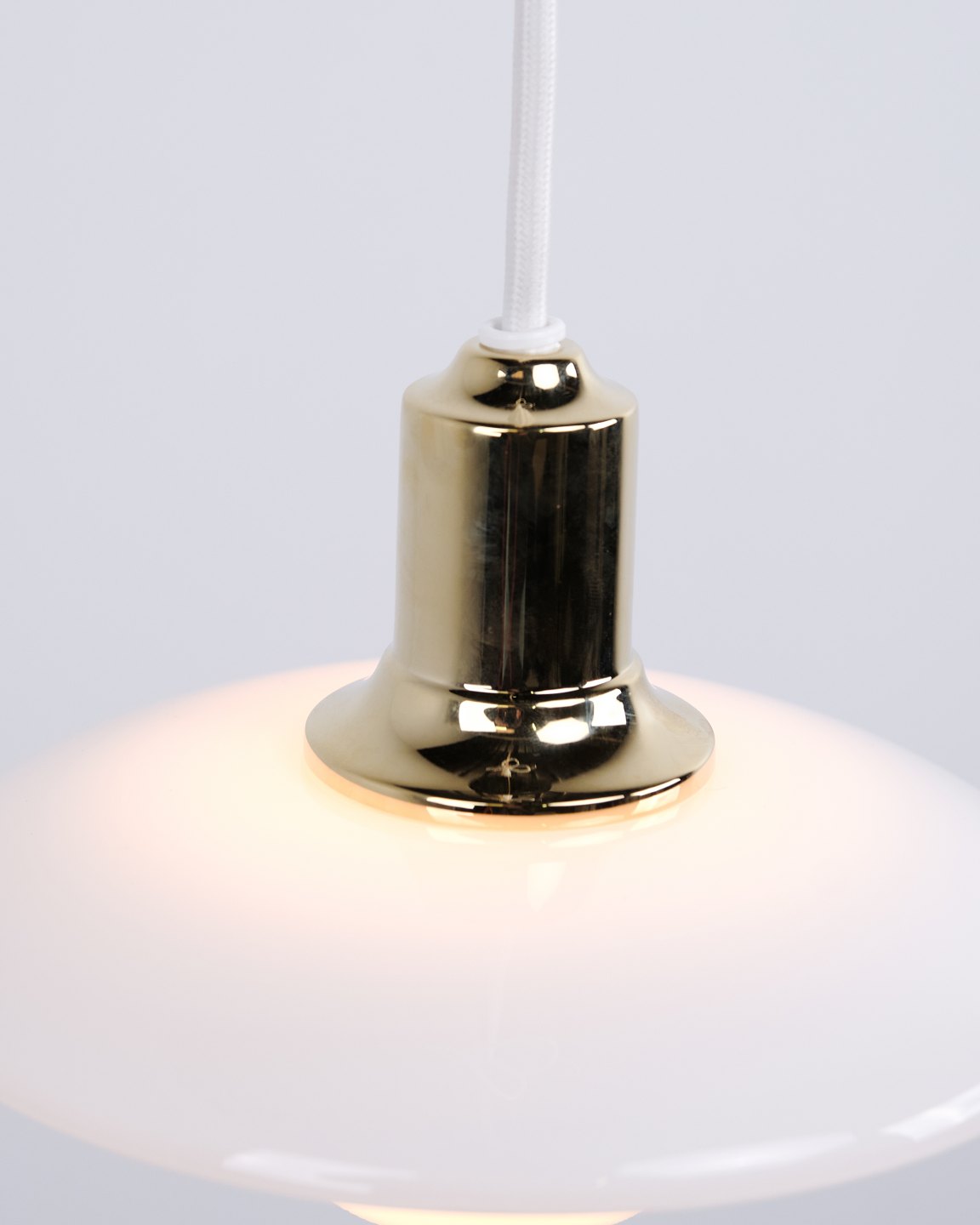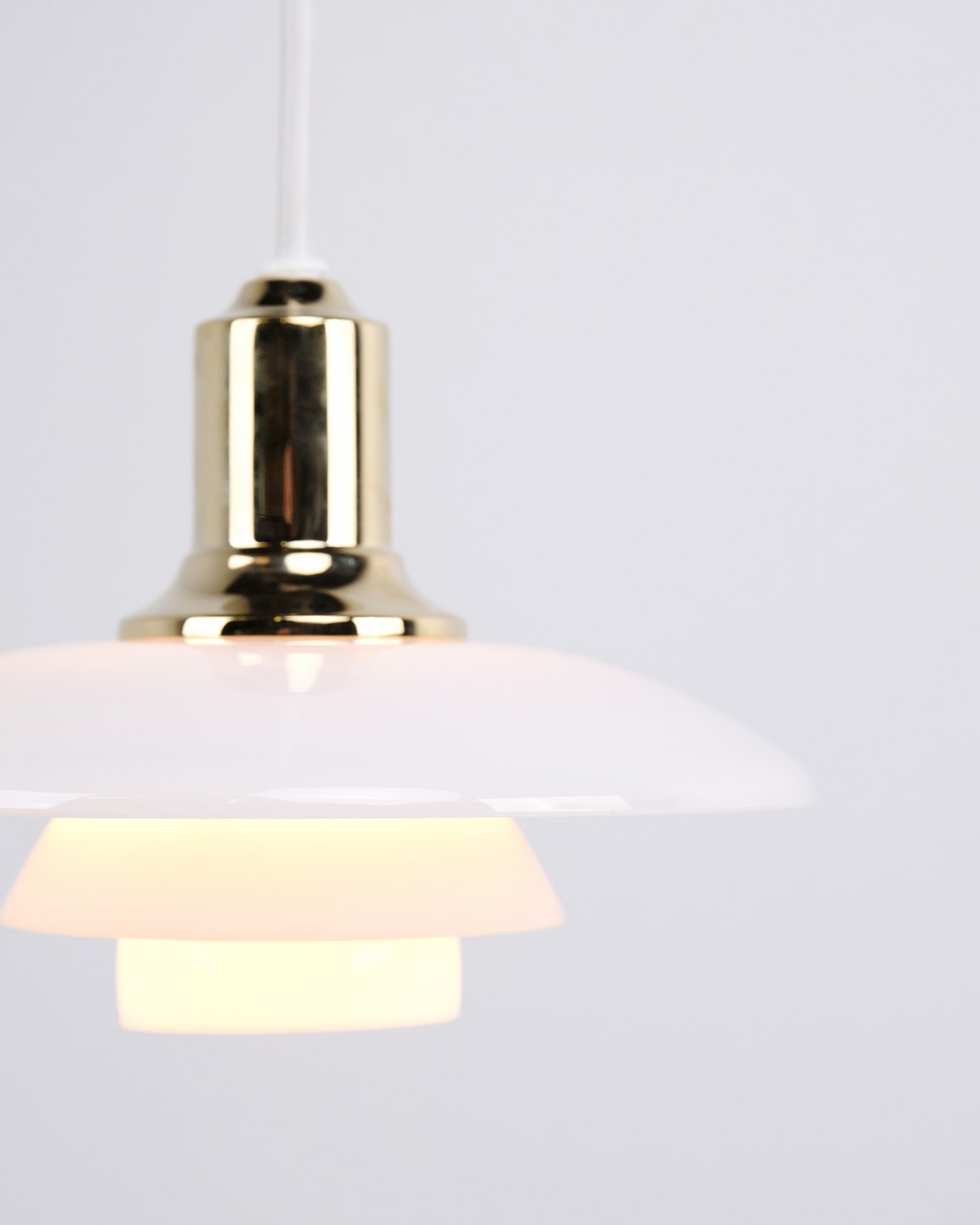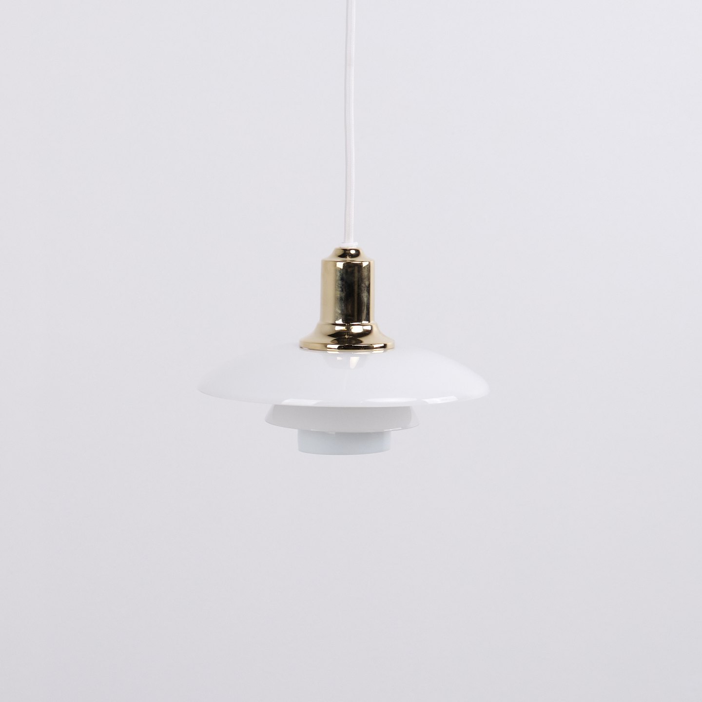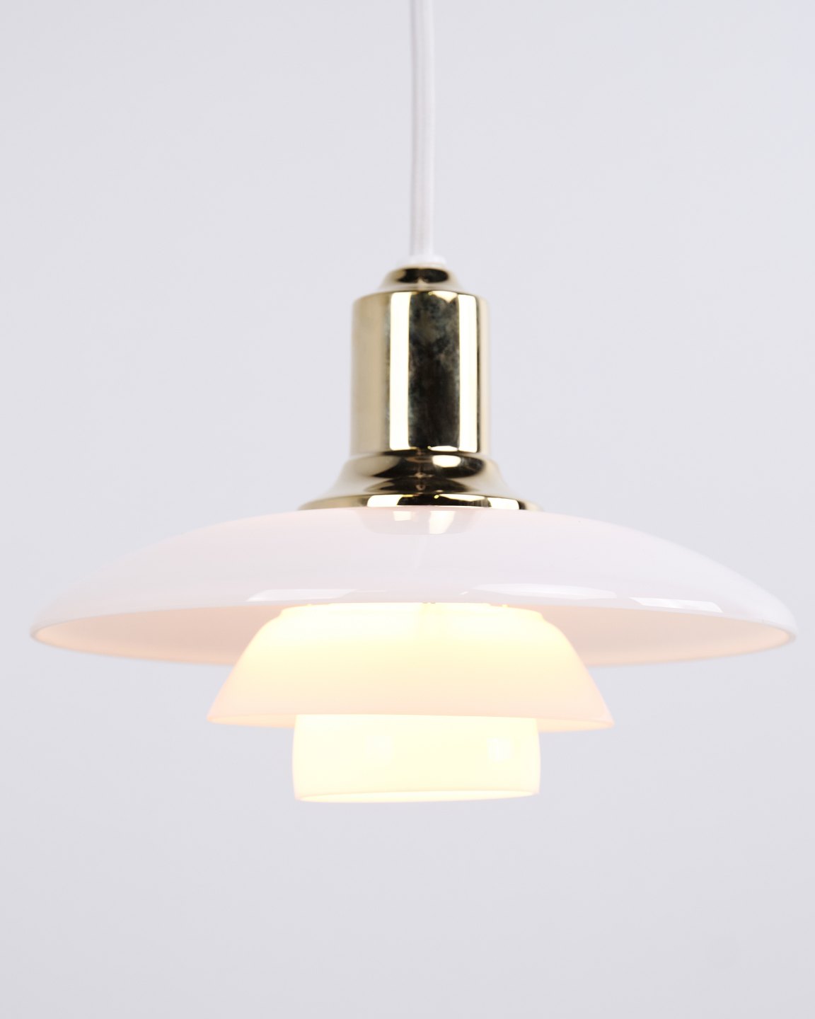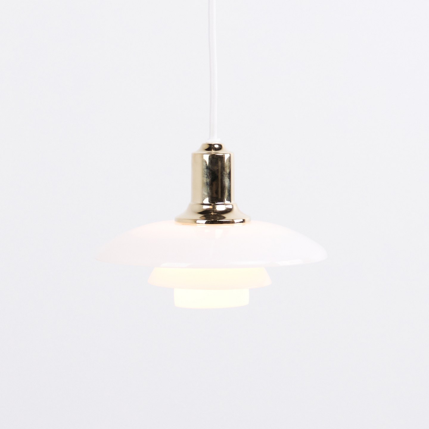 Suspension PH 2/1 en laiton avec verre opalin de Louis Poulsen. Conçue par Poul Henningsen avec un design d’éclairage danois classique et un éclairage sans éblouissement.