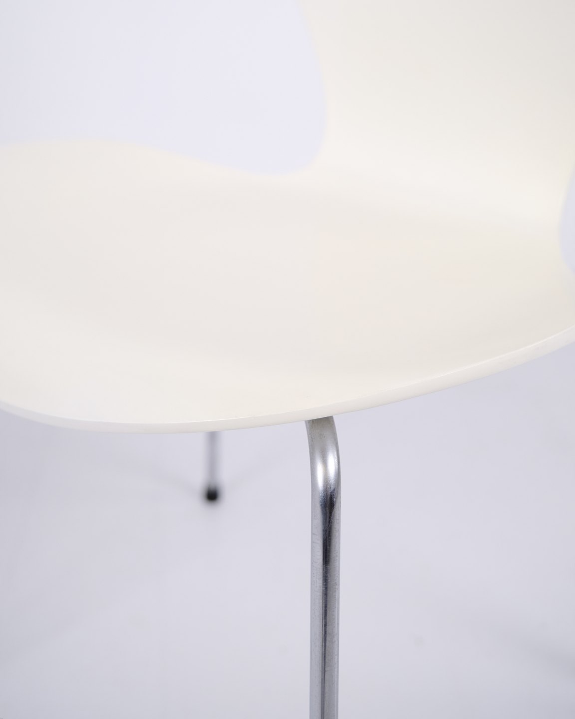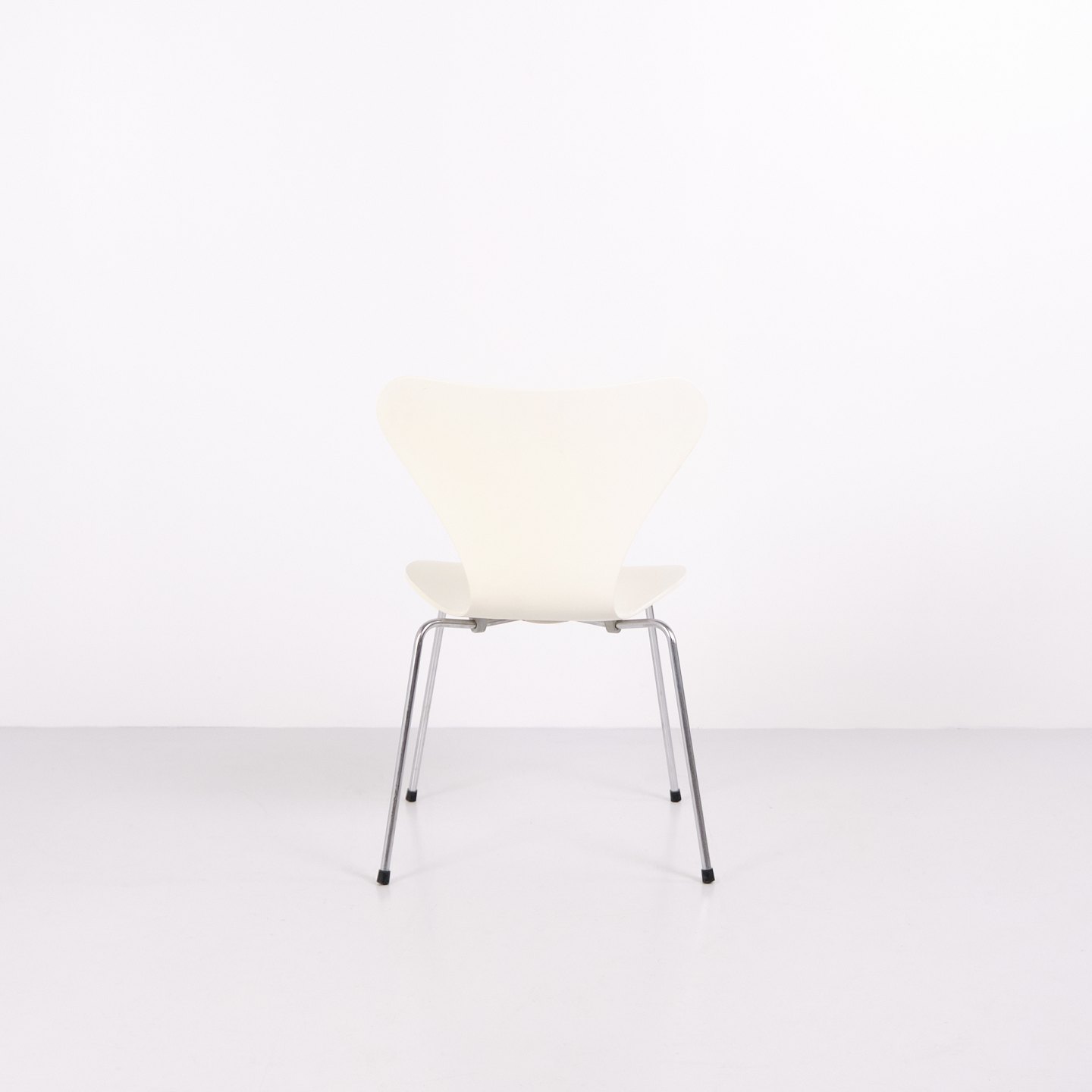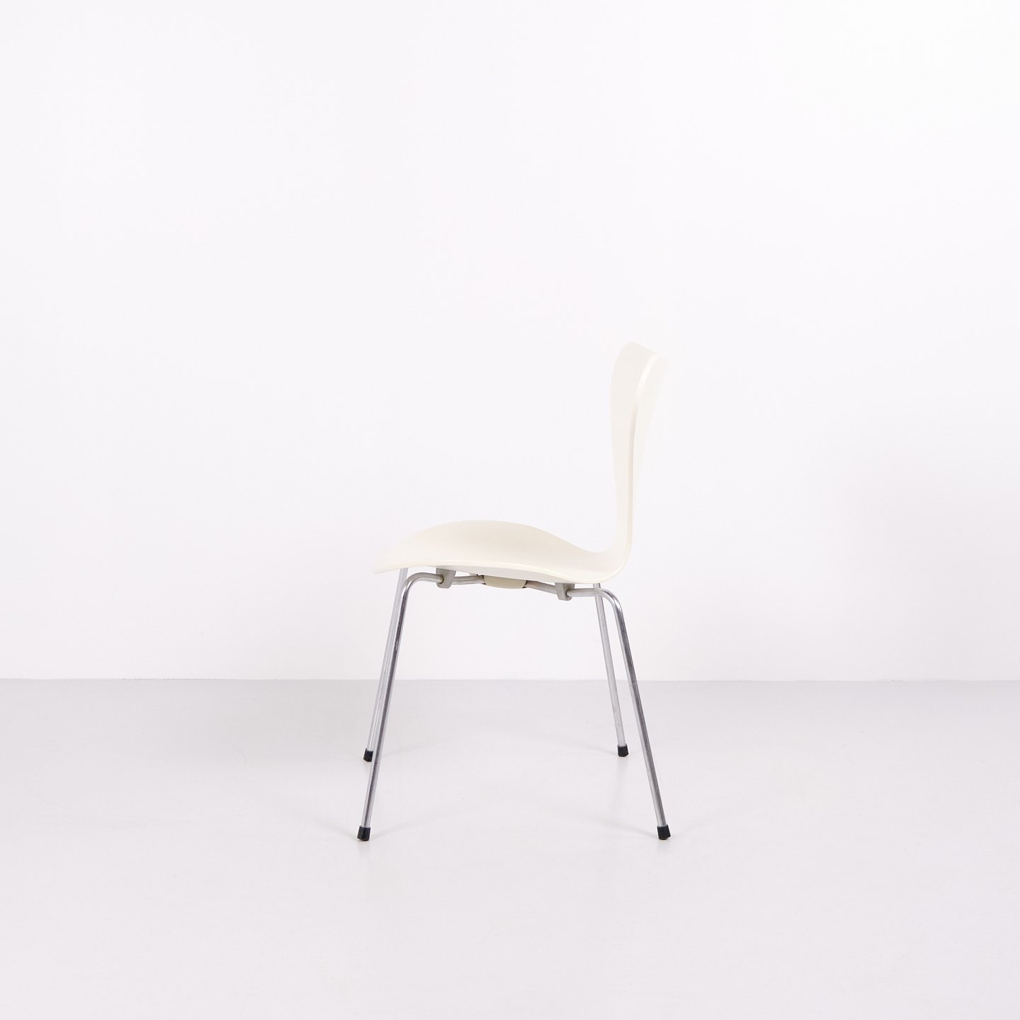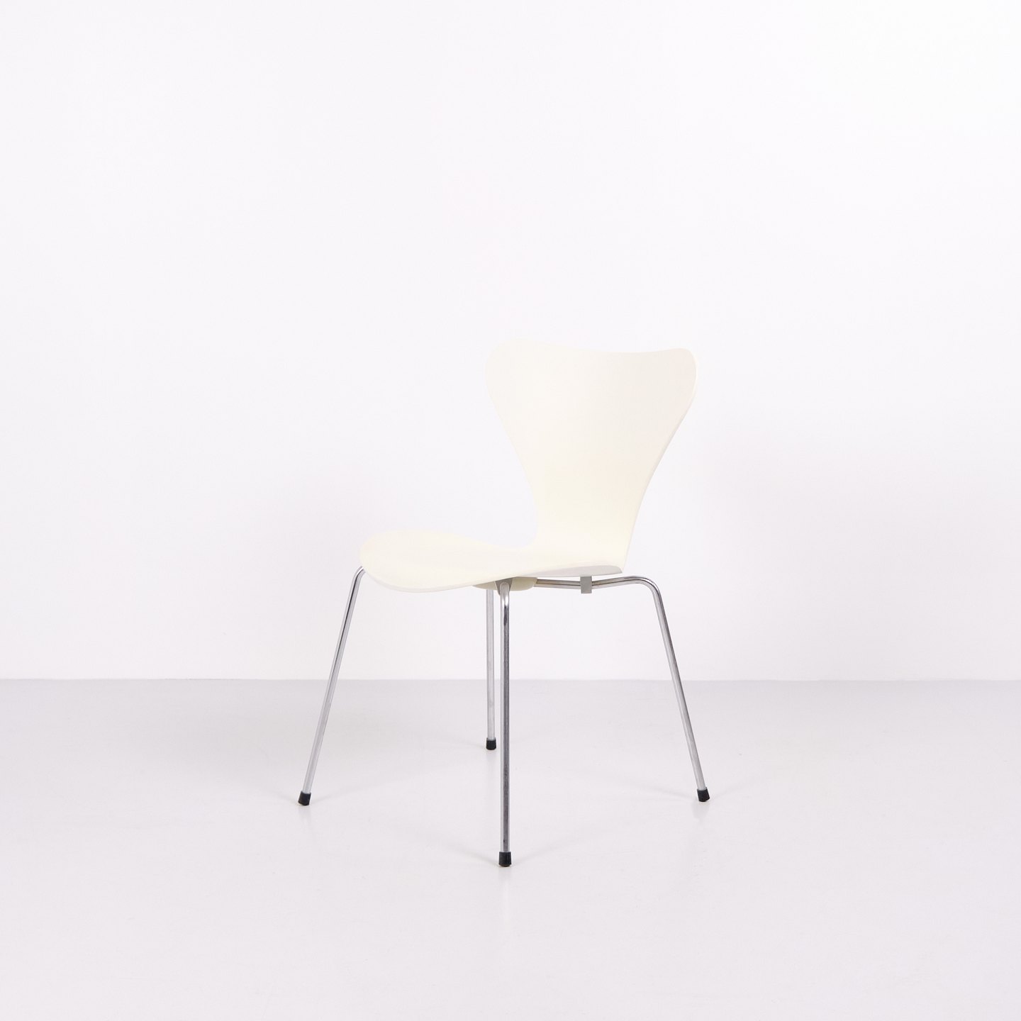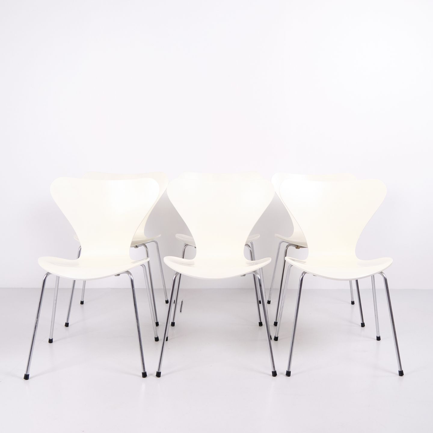 Suite de 6 chaises Série 7 modèle 3107 dessinées par Arne Jacobsen pour Fritz Hansen. Le modèle a été lancé en 1955 comme évolution de la chaise Fourmi de 1952. Réalisées en placage moulé sous pression avec finition laquée blanche et piètement tubulaire en acier chromé. La silhouette caractéristique en forme de 7 a fait de ce modèle l’une des chaises les plus produites de l’histoire du design danois. Le modèle 3107 a été utilisé dans des maisons privées, restaurants, bureaux et espaces publics dans le monde entier, et est toujours fabriqué par Fritz Hansen. Vendues uniquement en ensemble complet.