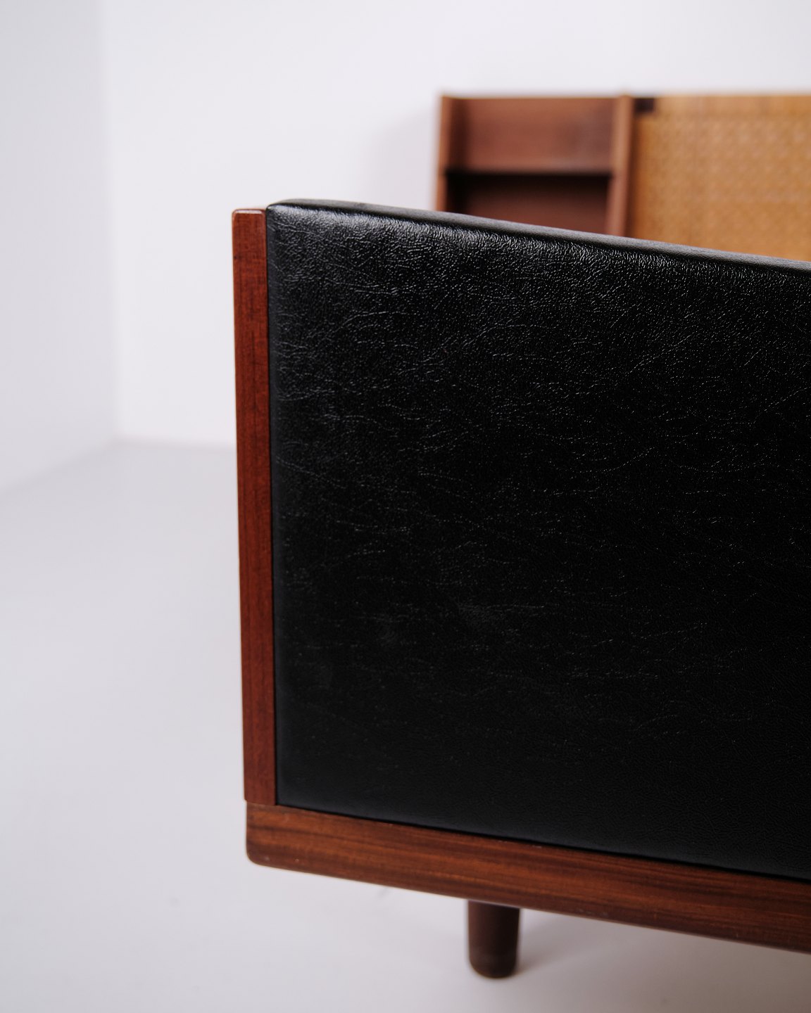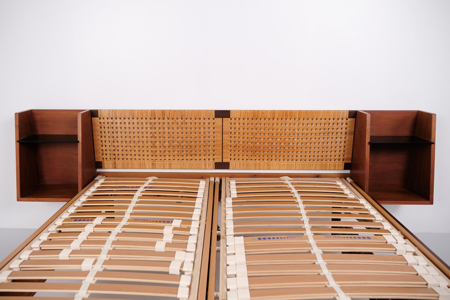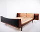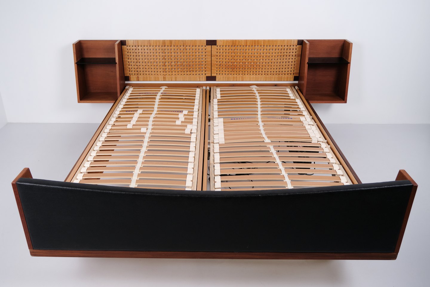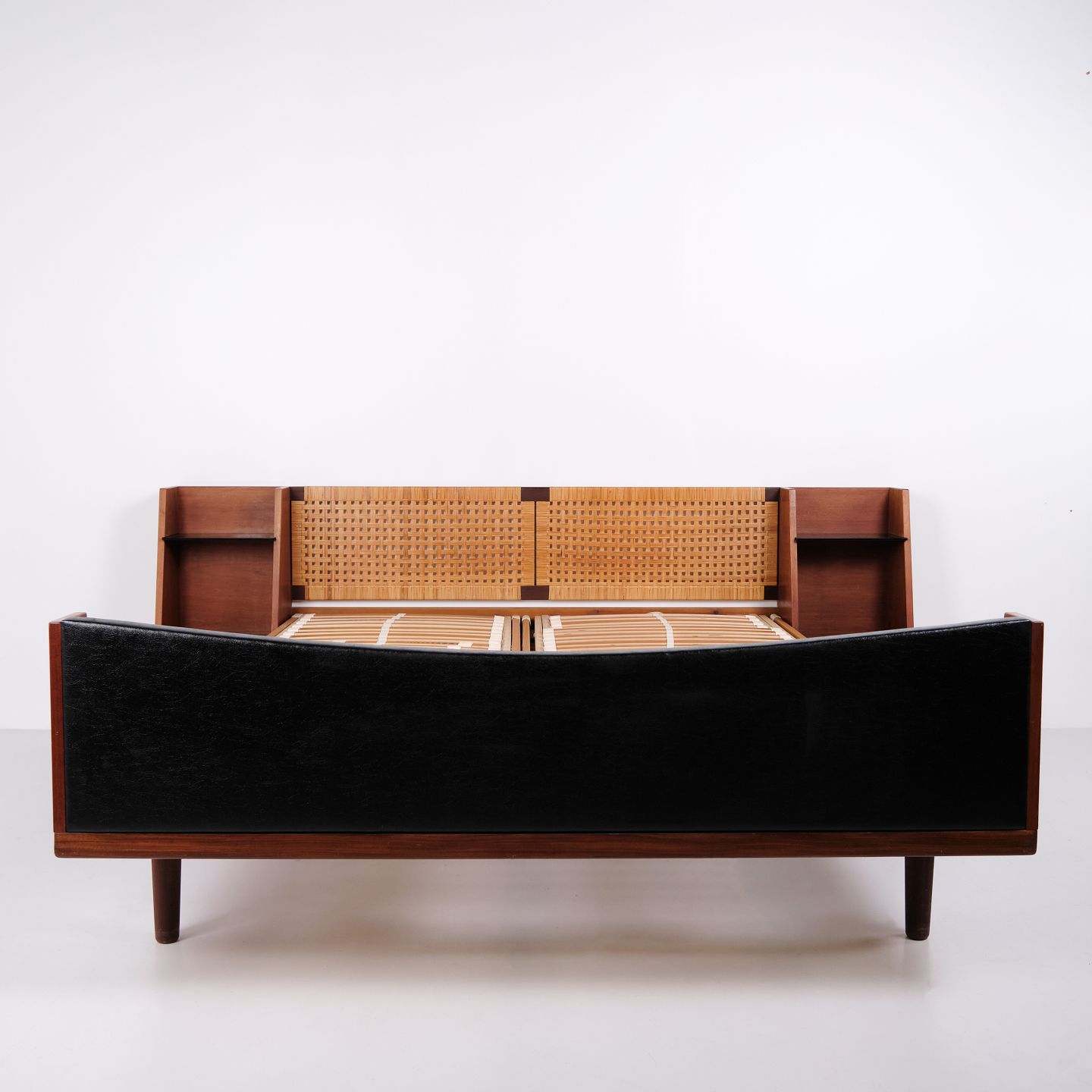 Lit double modèle GE 701 dessiné par Hans J. Wegner et fabriqué par Getama dans les années 1950. Réalisé en teck massif et plaqué. Tête et pied de lit avec cannage et simili cuir noir. Tête de lit avec tables de chevet intégrées comprenant étagères en verre noir ainsi qu’une tablette inférieure. Ferrures en laiton. Hans J. Wegner a collaboré de nombreuses années avec Getama et a dessiné plusieurs meubles en teck pour l’habitat et la chambre.