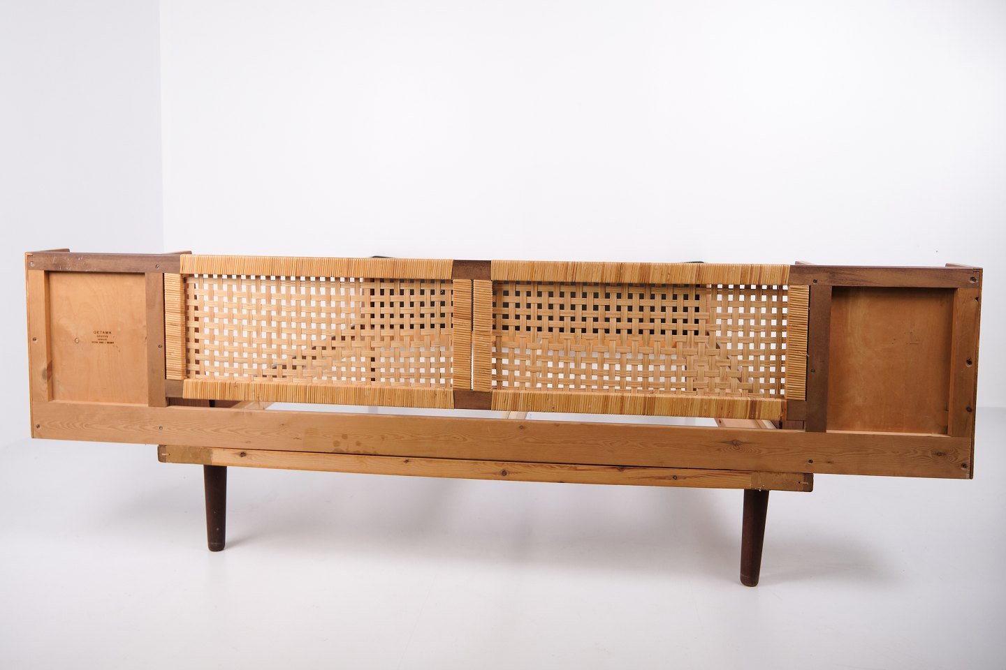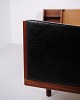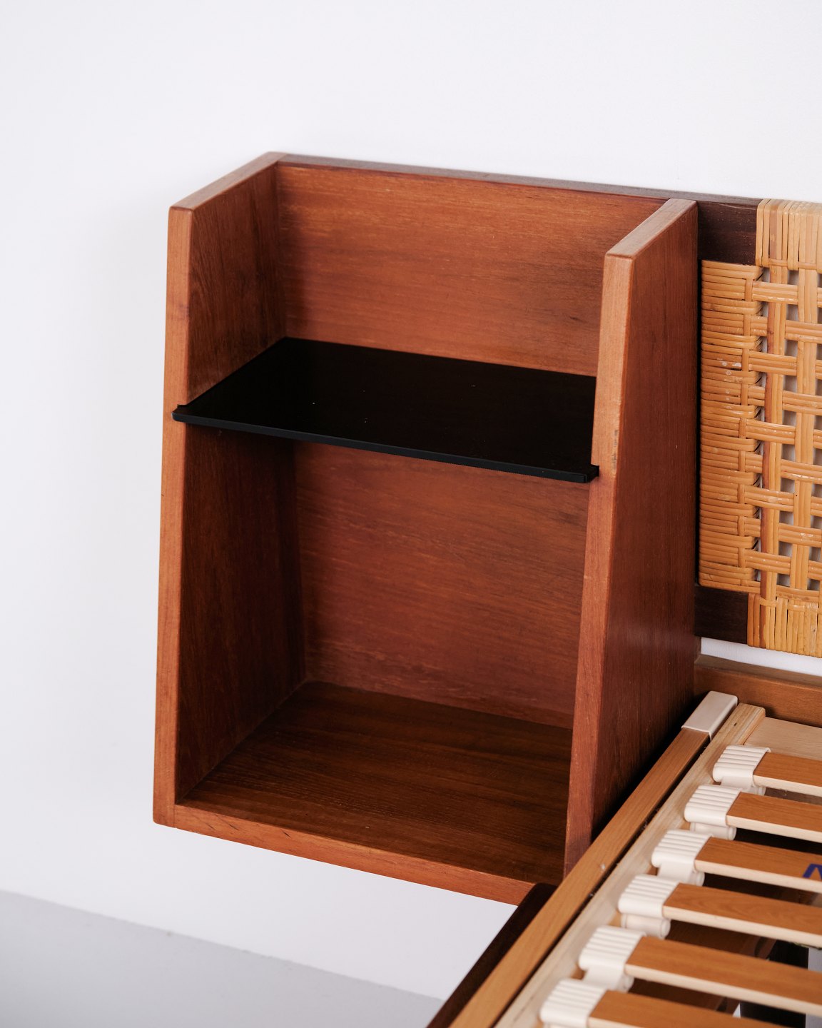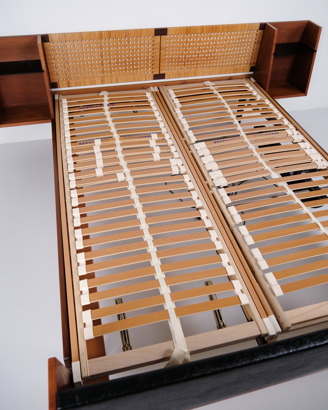 Lit double modèle GE 701 dessiné par Hans J. Wegner et fabriqué par Getama dans les années 1950. Réalisé en teck massif et plaqué. Tête et pied de lit avec cannage et simili cuir noir. Tête de lit avec tables de chevet intégrées comprenant étagères en verre noir ainsi qu’une tablette inférieure. Ferrures en laiton. Hans J. Wegner a collaboré de nombreuses années avec Getama et a dessiné plusieurs meubles en teck pour l’habitat et la chambre.