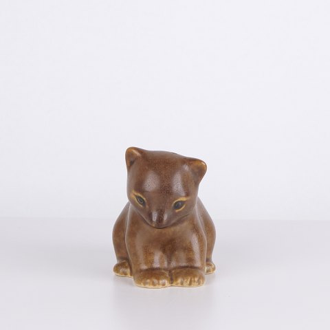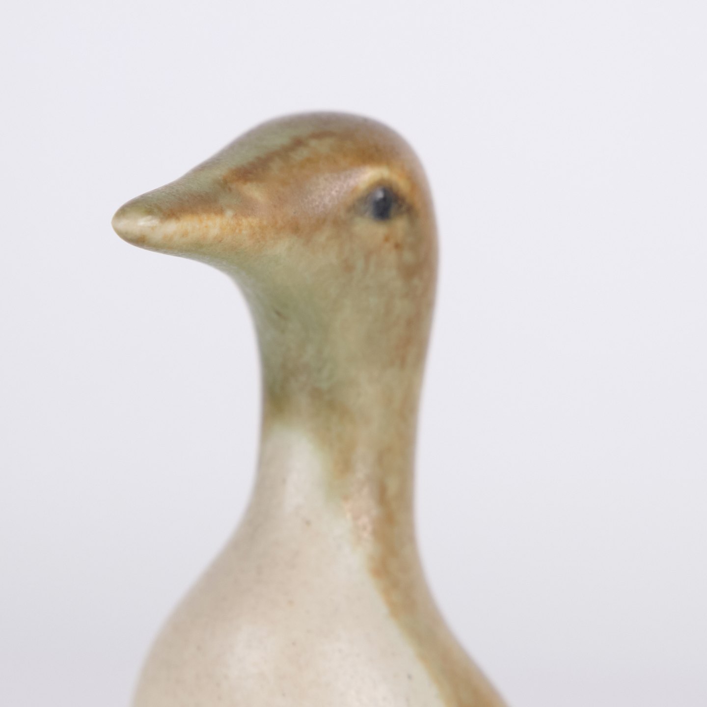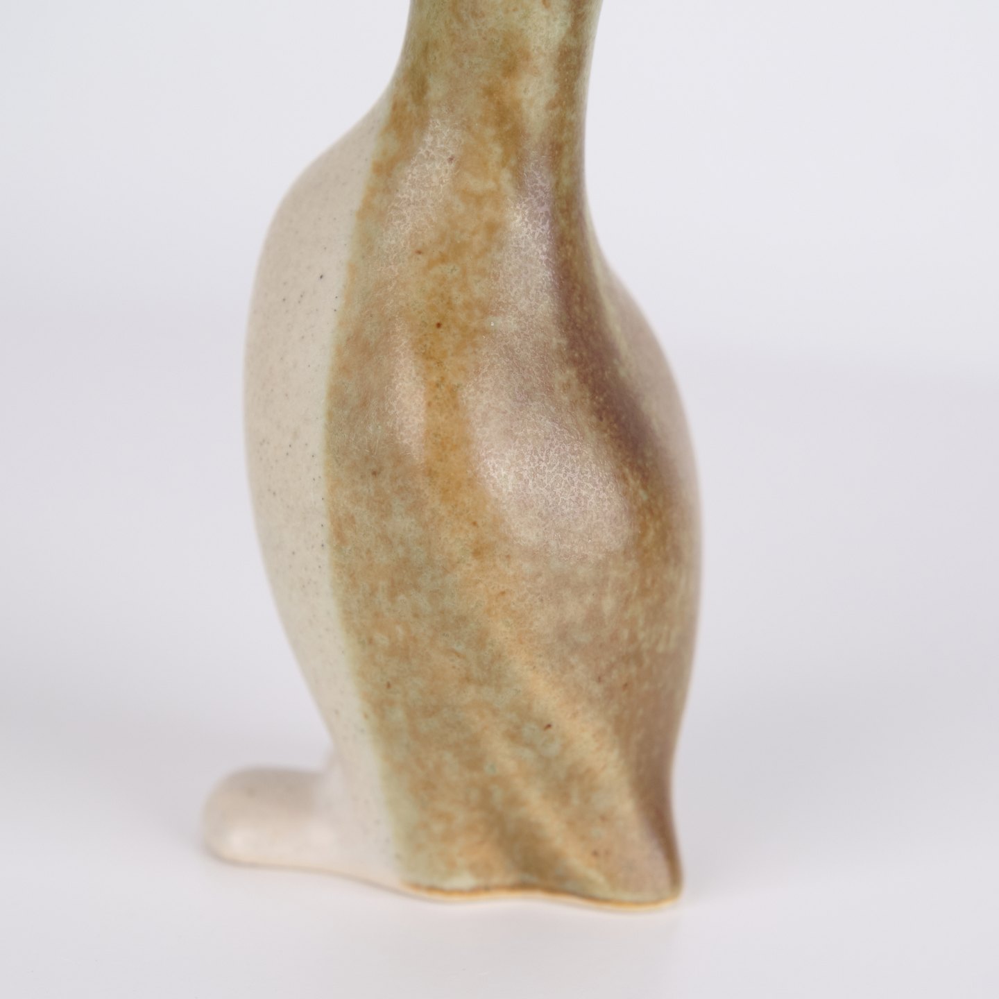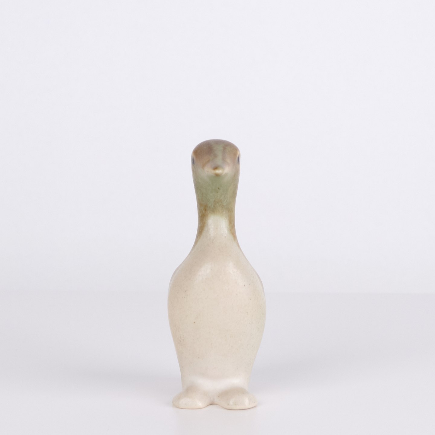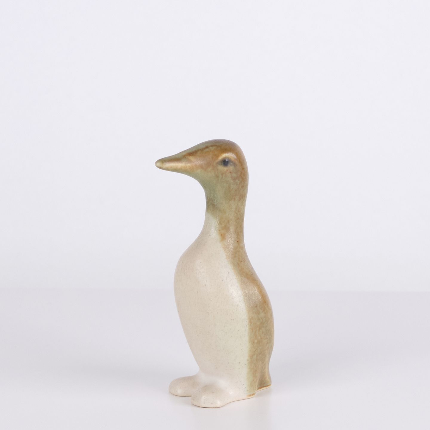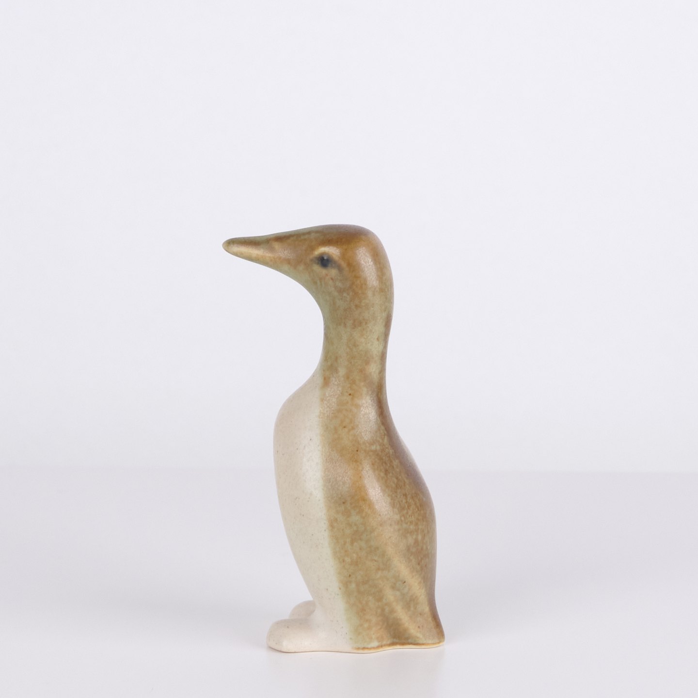 Figurine pingouin en céramique réalisée en grès émaillé des années 1960. La figure présente une forme scandinave simple avec émaux clairs et décoration brune.