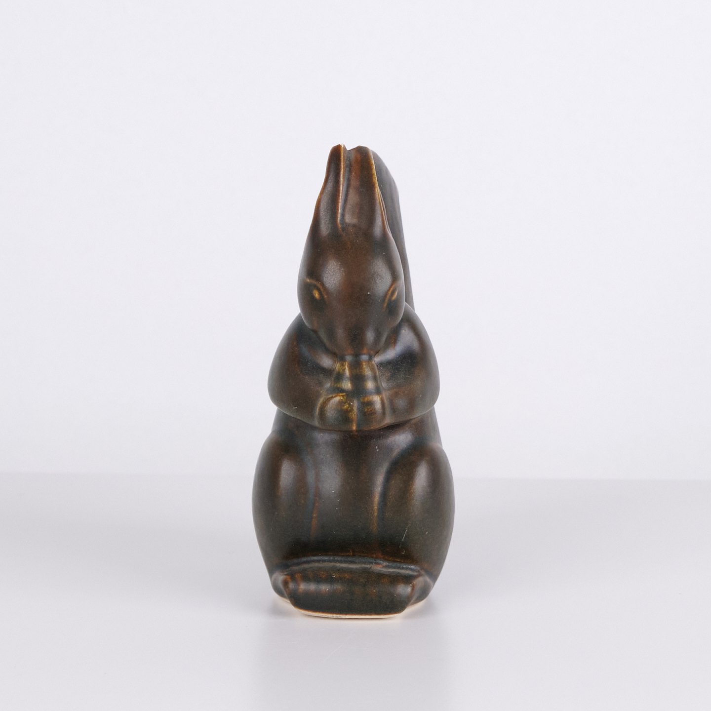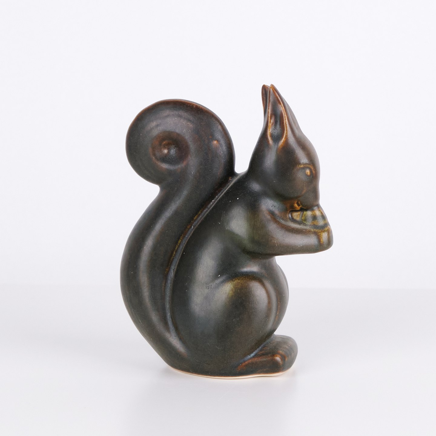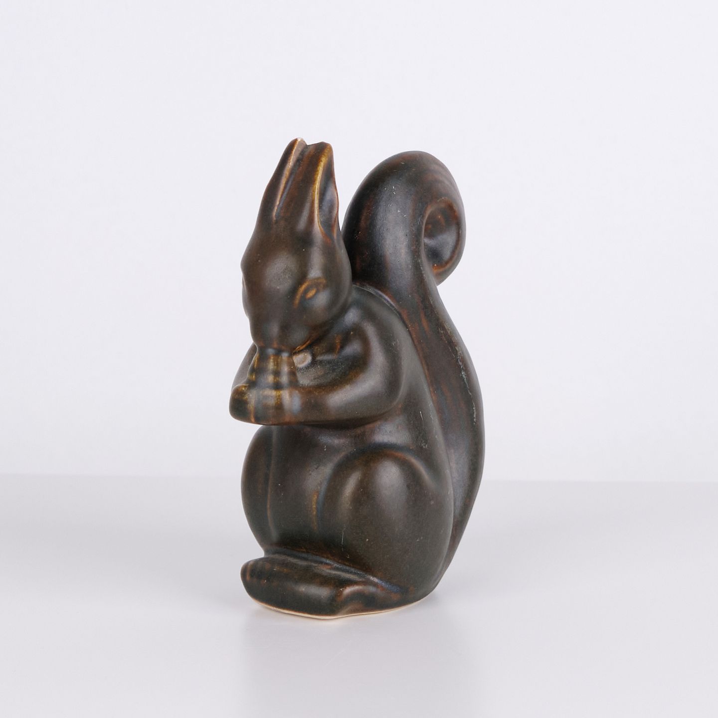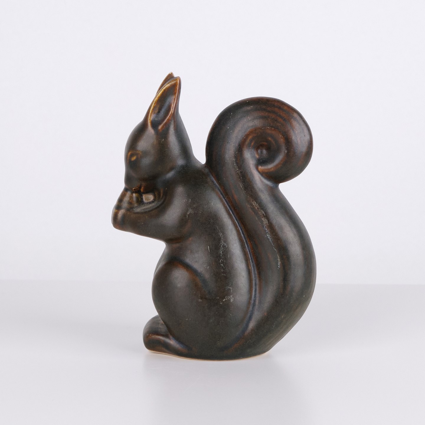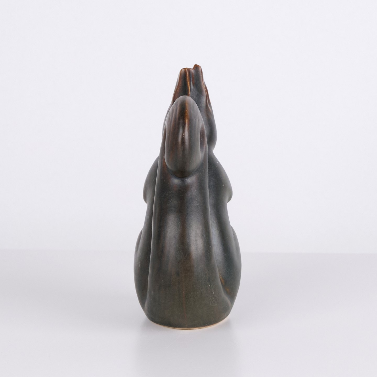 Figurine écureuil en céramique par Knud Basse réalisée avec glaçure foncée aux nuances brunes chaudes. La figure représente un écureuil assis avec noix et présente des lignes organiques marquées, caractéristiques de la céramique d’atelier danoise de cette période. Les figurines Knud Basse sont des objets de collection reconnus dans le domaine de la céramique animalière danoise.