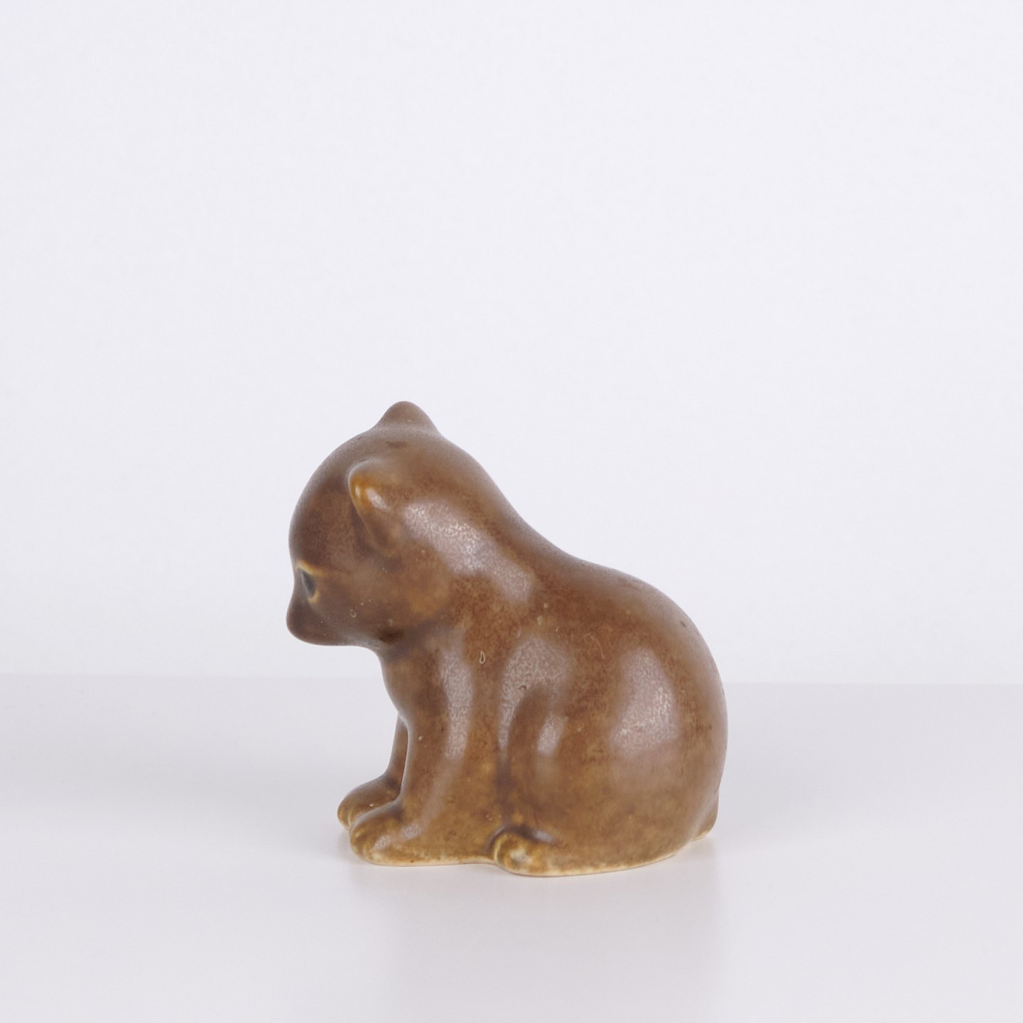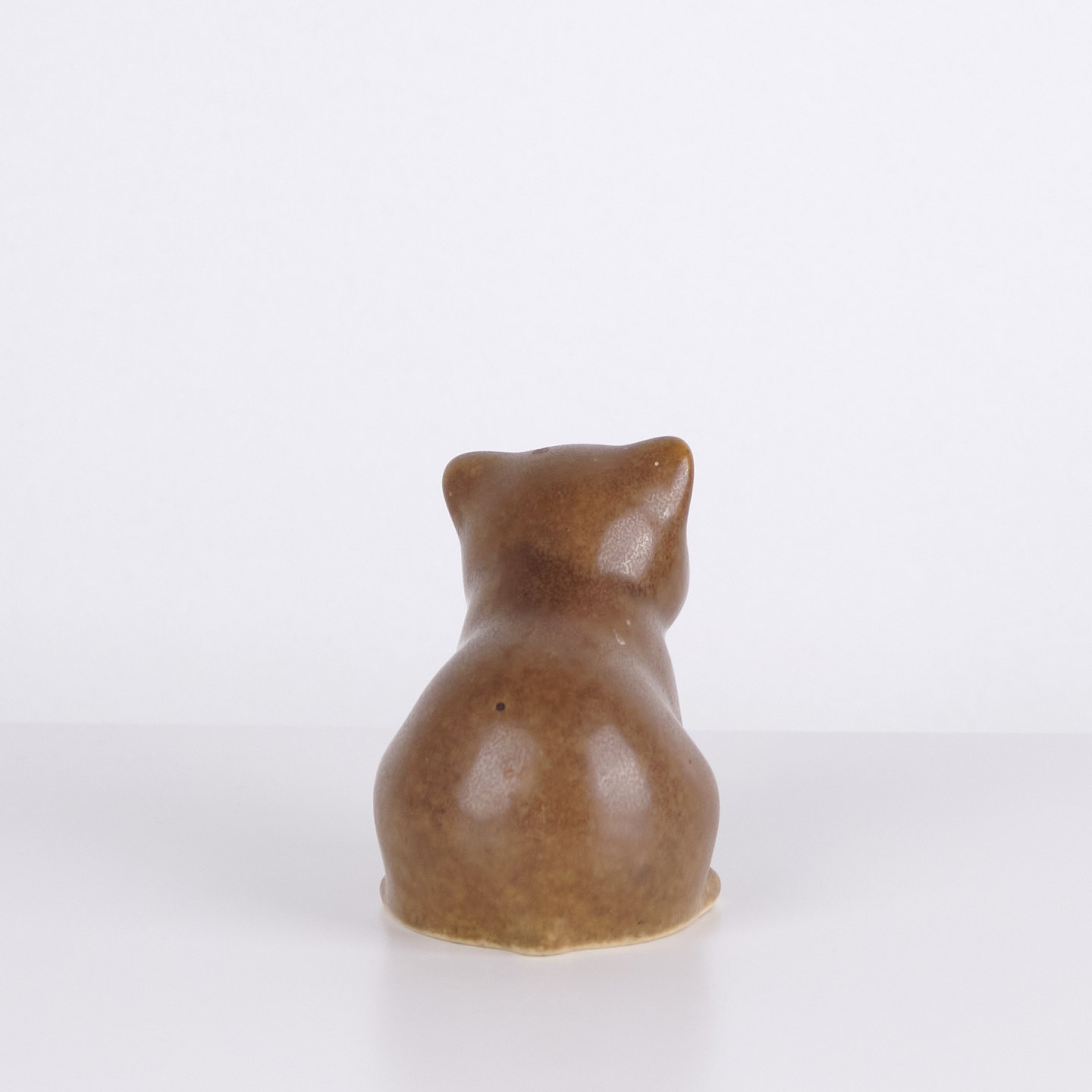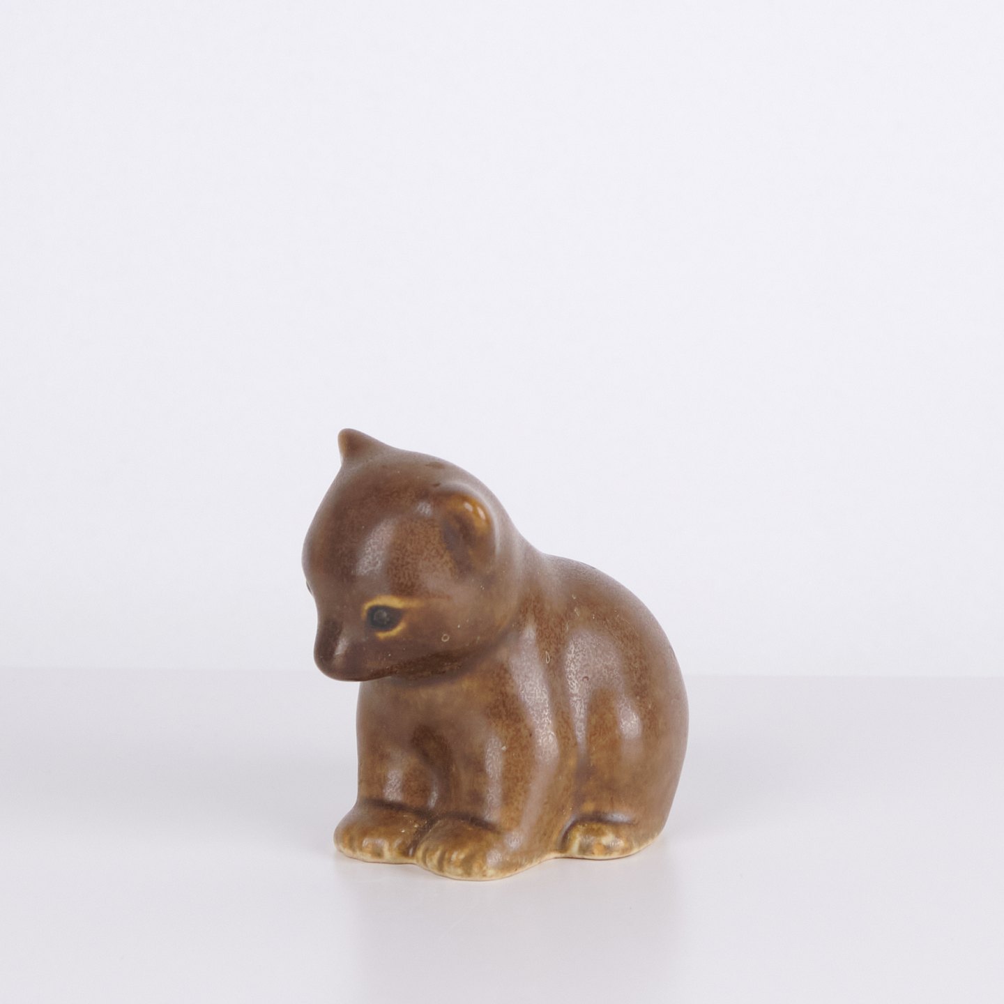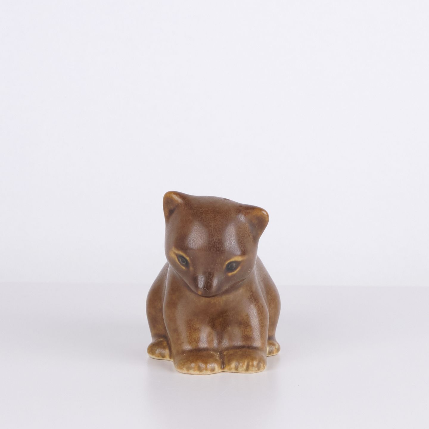 Figurine ours par Knud Basse réalisée en céramique émaillée brune. La figure représente un ours assis avec tête baissée, pattes marquées et formes douces. Un modèle plus petit issu de la série de figurines animales de Knud Basse, produit au Danemark dans les années 1960.