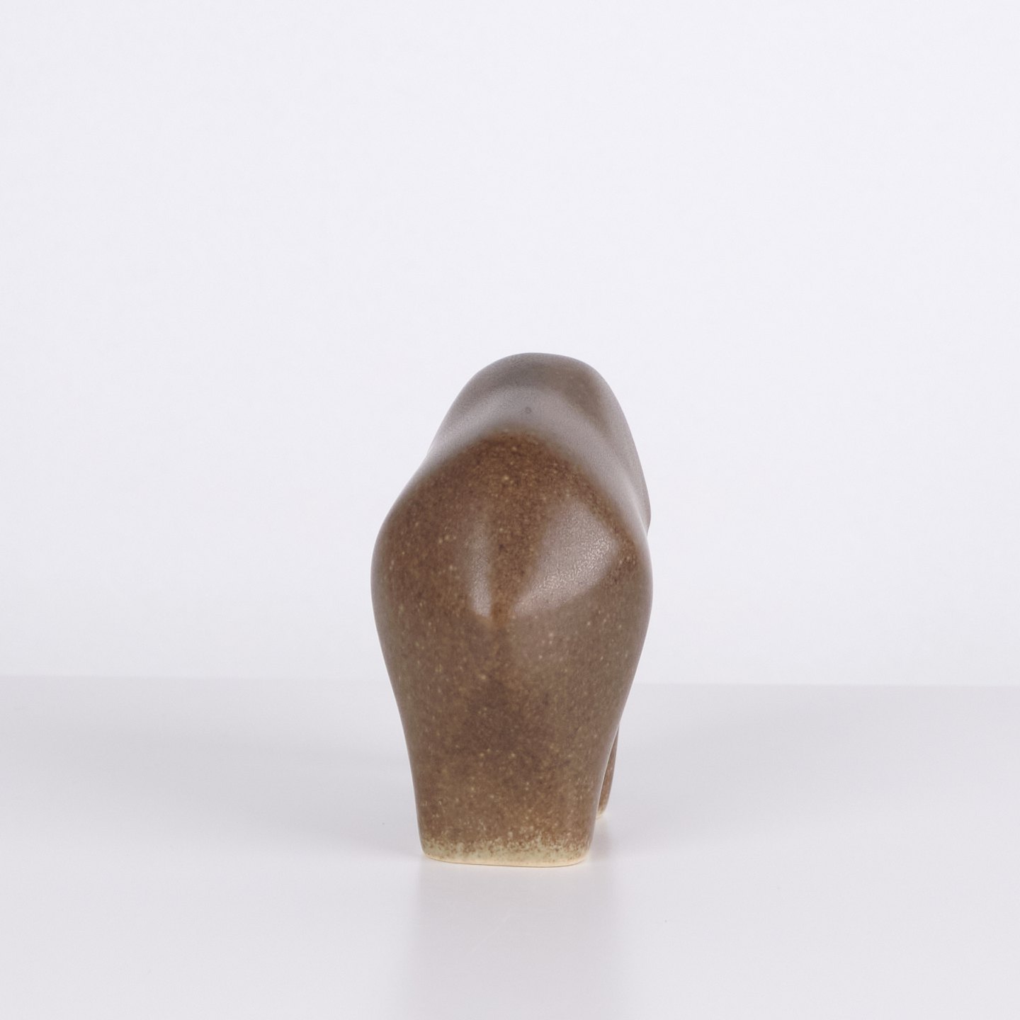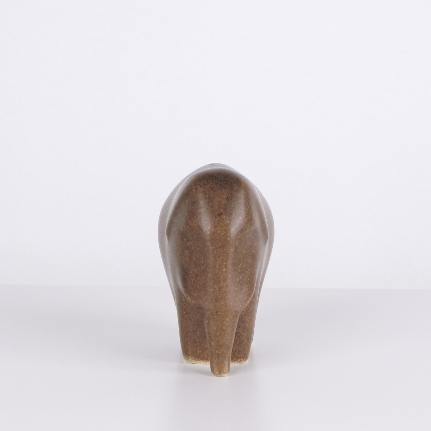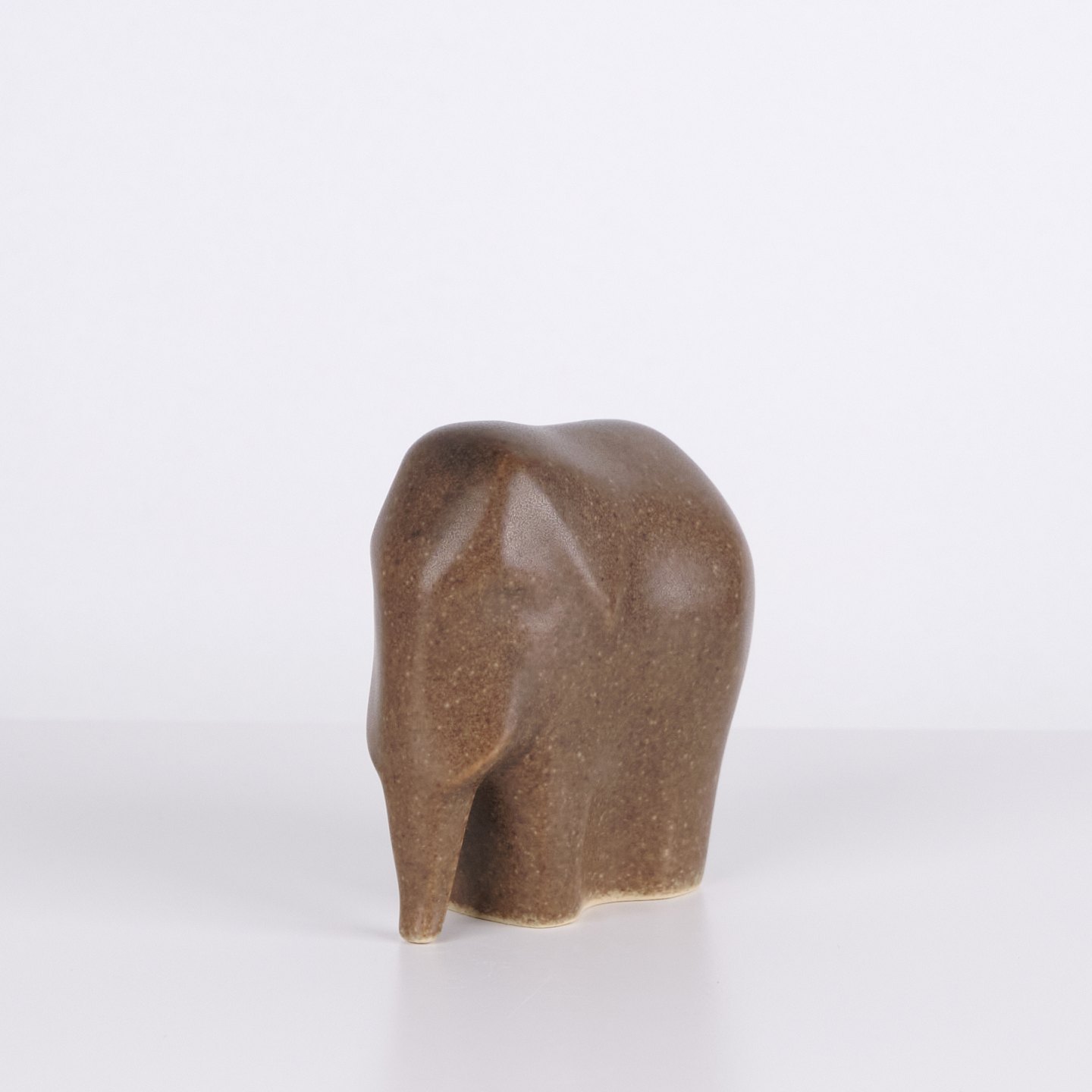 Figurine éléphant par Knud Basse réalisée en céramique émaillée brune. La figure est modelée dans une forme simple et compacte avec trompe inclinée vers le bas et côtés arrondis. Modèle minimaliste issu de la série de figurines animales de Knud Basse, produit au Danemark dans les années 1960.