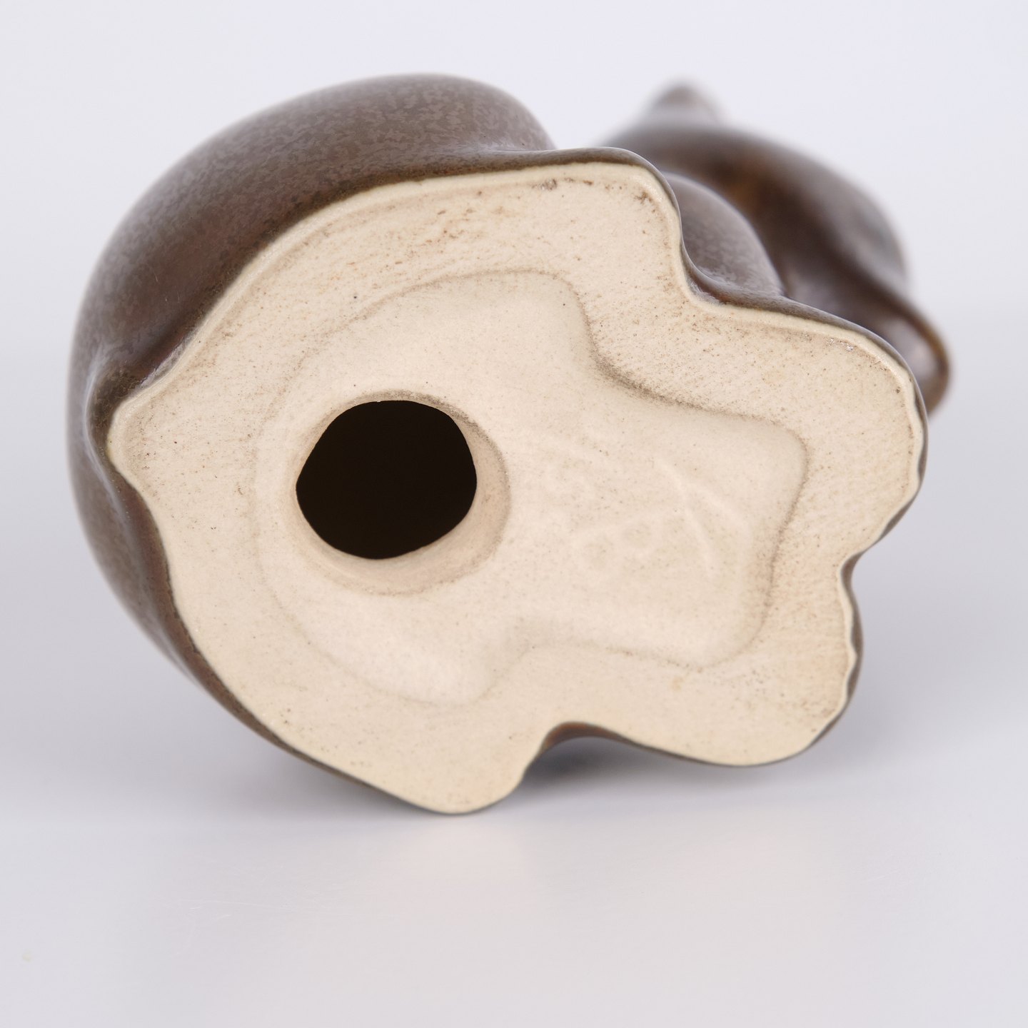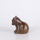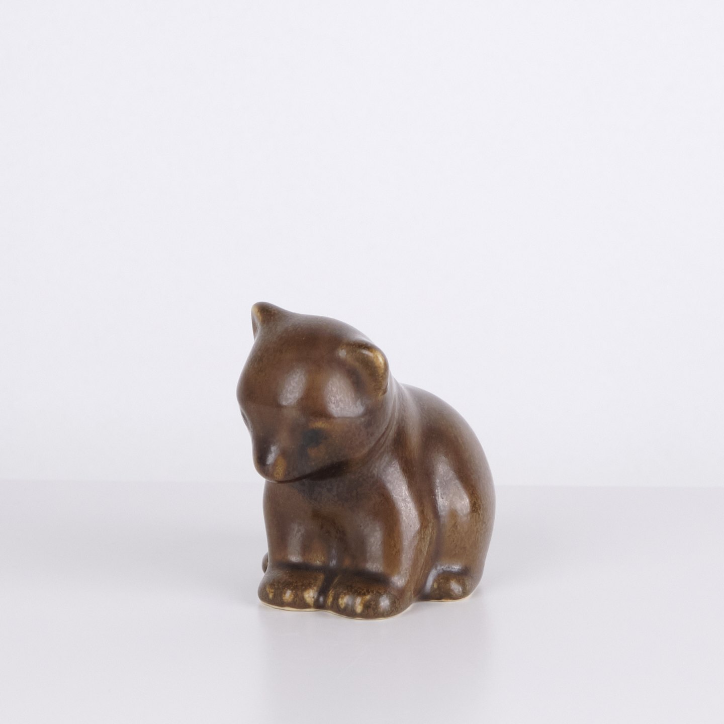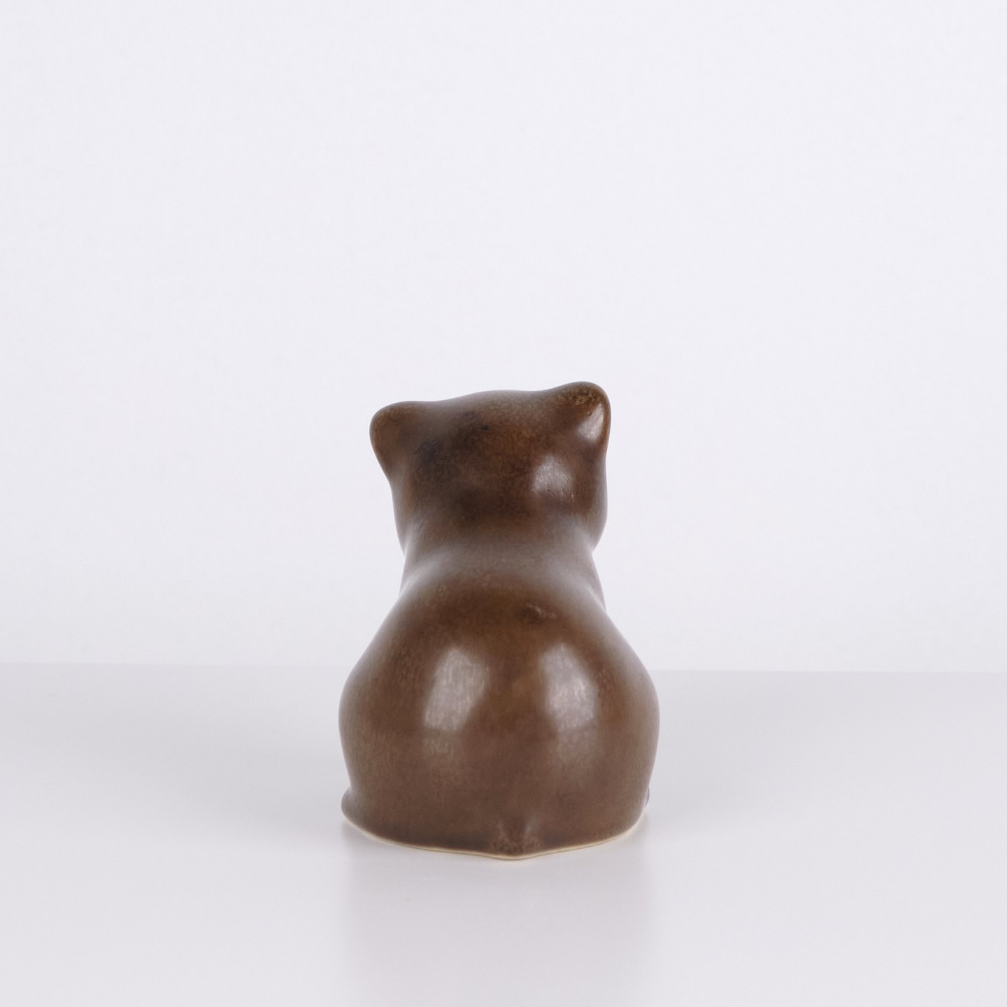 Figurine ours par Knud Basse réalisée en céramique émaillée brune. La figure est modelée en position assise avec tête légèrement inclinée et lignes arrondies, créant une expression calme et caractéristique. Un bel exemple des figurines animales populaires de Knud Basse et de la céramique d’art danoise de la période mid-century.