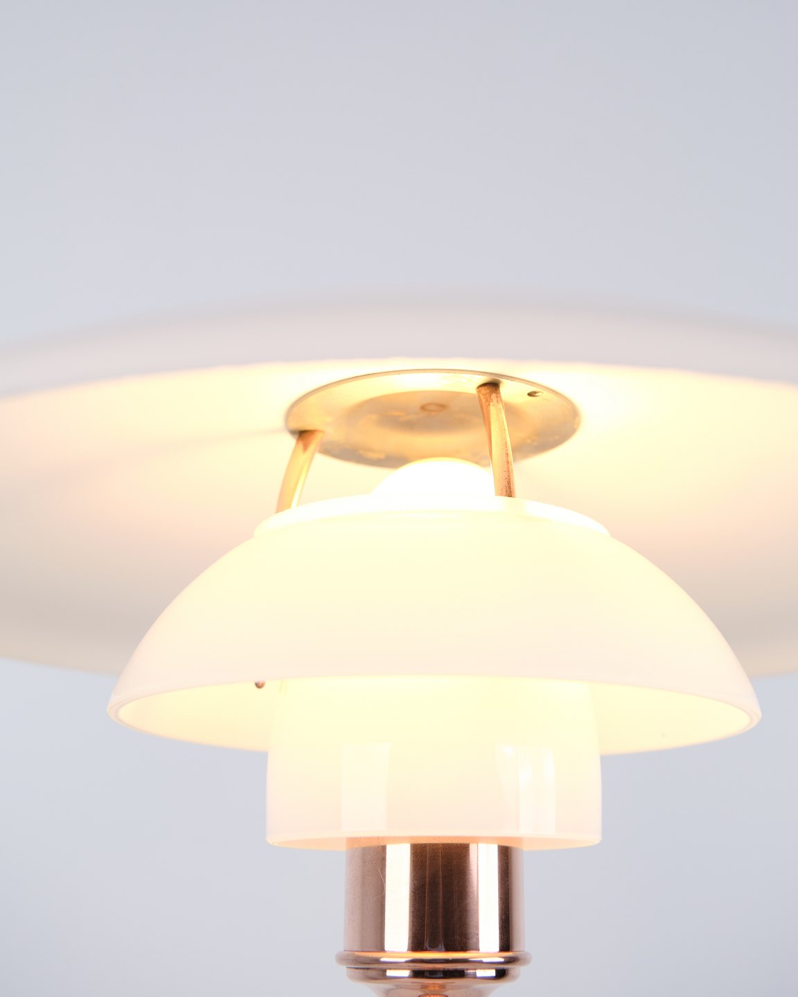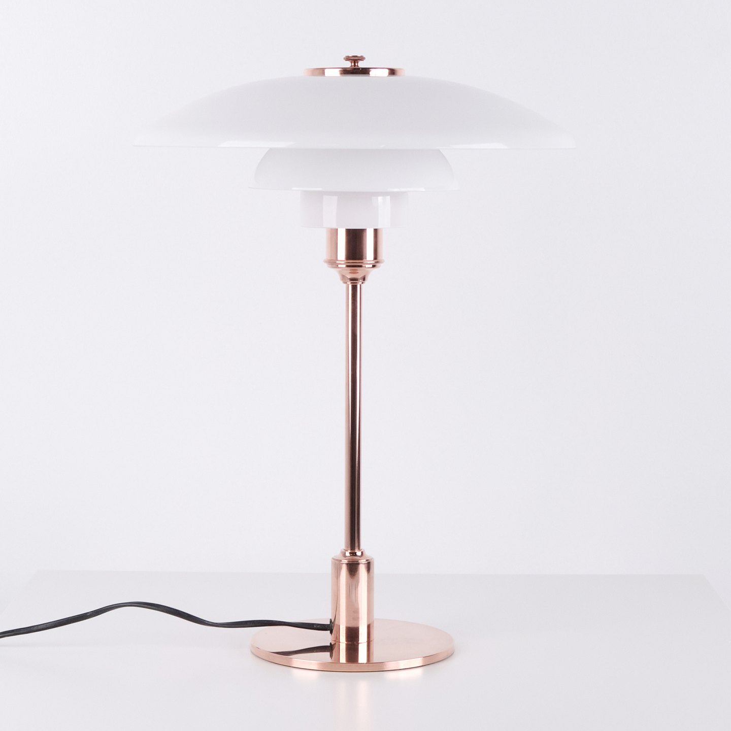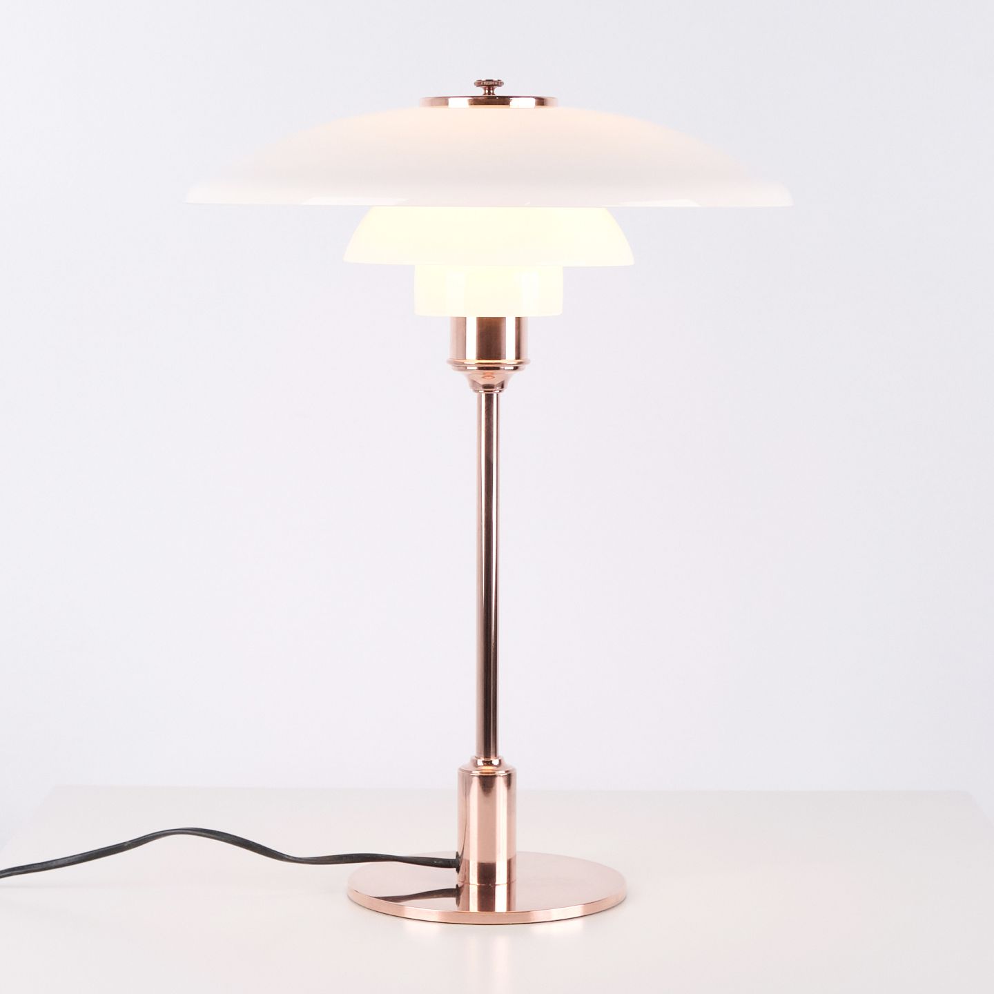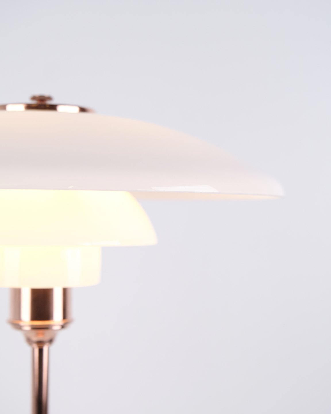 Lampe de table PH modèle 3½-2½ Limited Edition dessinée par Poul Henningsen et fabriquée par Louis Poulsen. La lampe est réalisée en cuivre avec abat-jour supérieur en verre opalin blanc et deux abat-jours inférieurs en verre opalin blanc. Le modèle a été commercialisé pendant une période limitée en 2015.