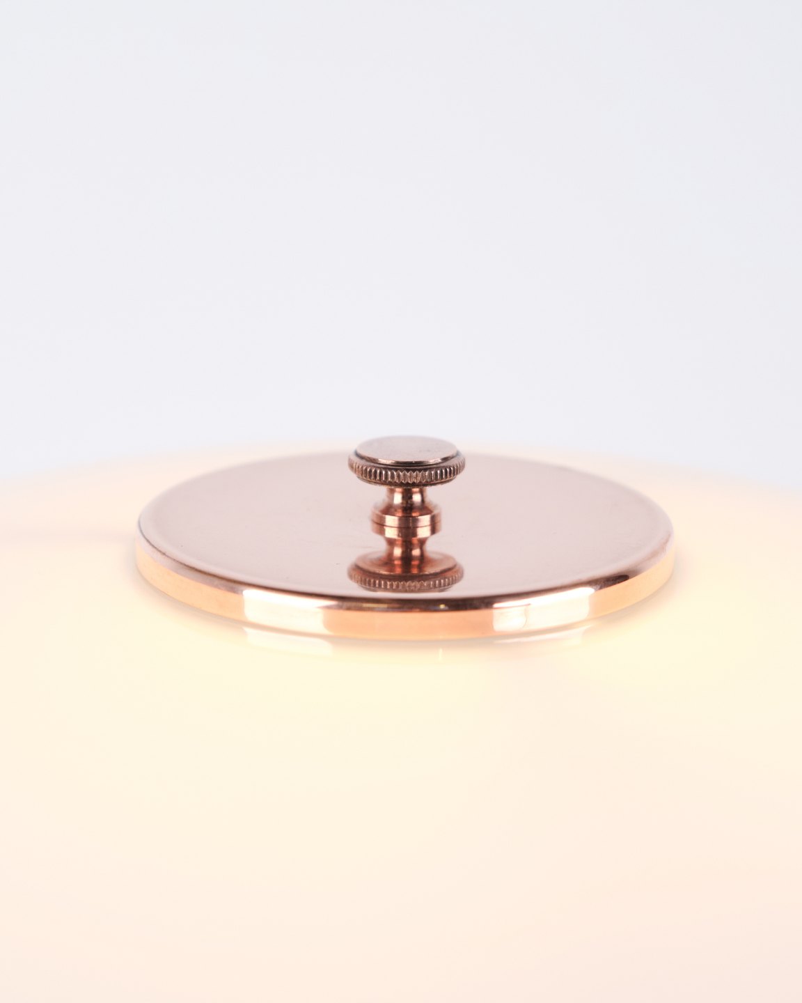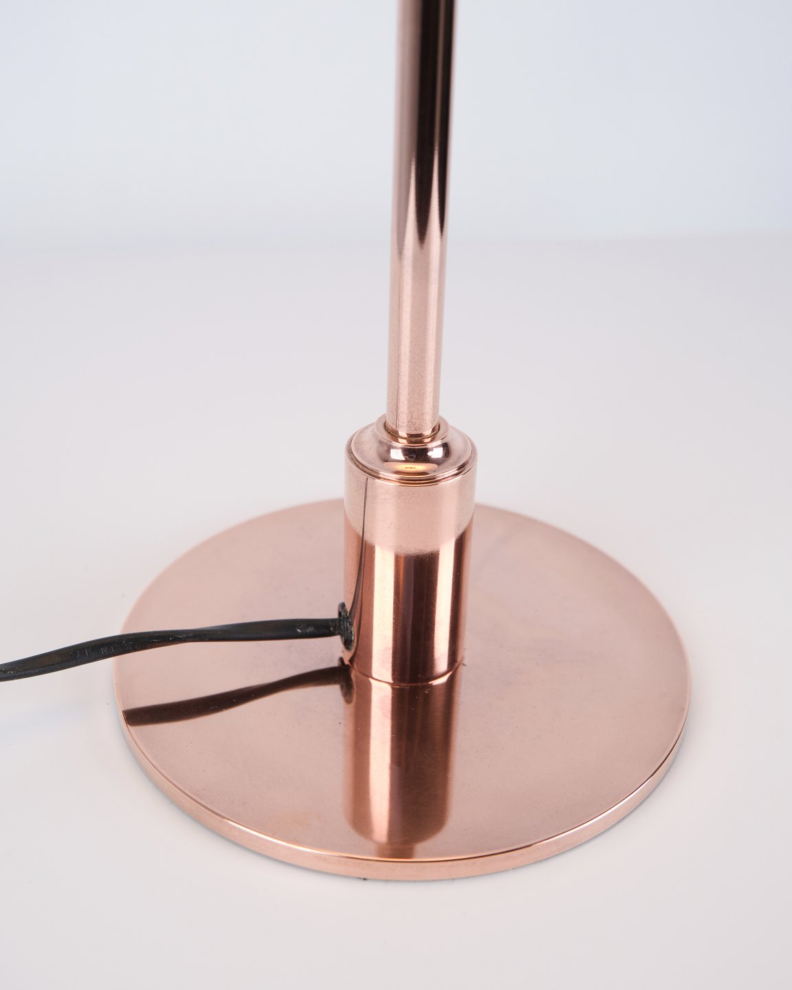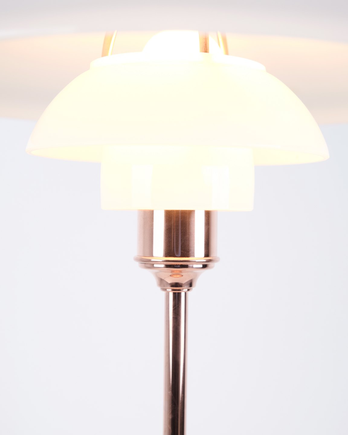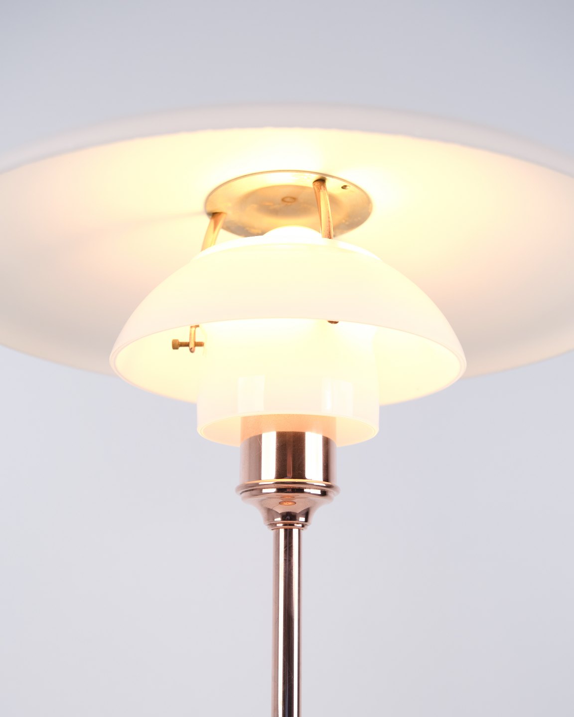 Lampe de table PH modèle 3½-2½ Limited Edition dessinée par Poul Henningsen et fabriquée par Louis Poulsen. La lampe est réalisée en cuivre avec abat-jour supérieur en verre opalin blanc et deux abat-jours inférieurs en verre opalin blanc. Le modèle a été commercialisé pendant une période limitée en 2015.