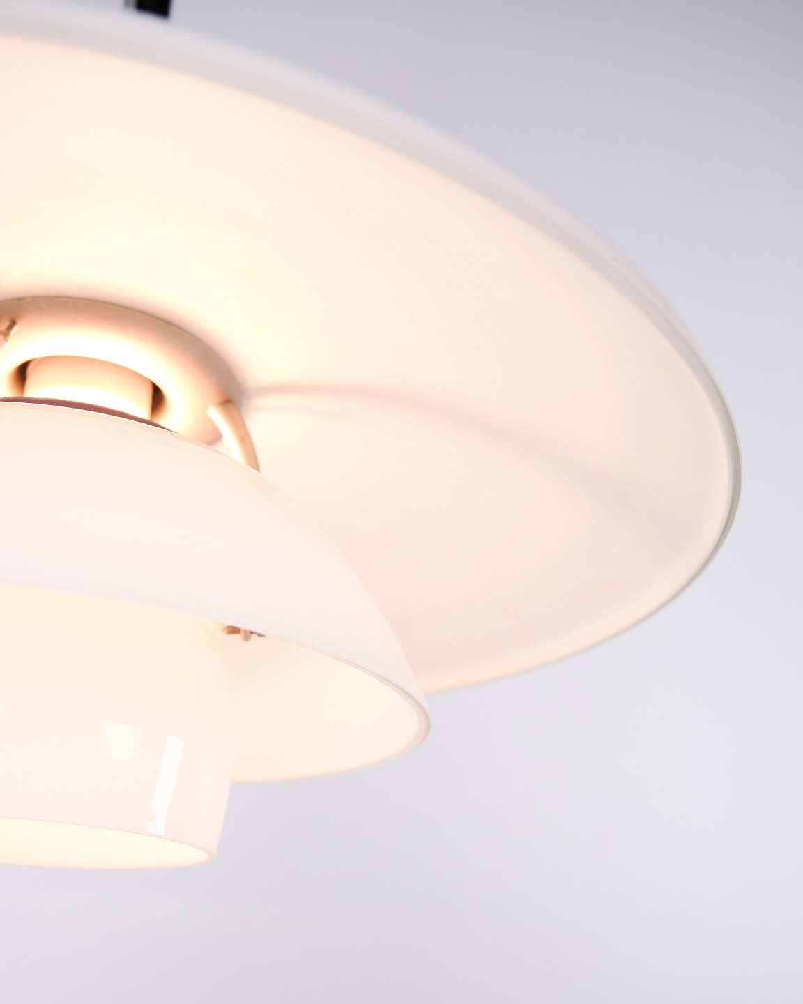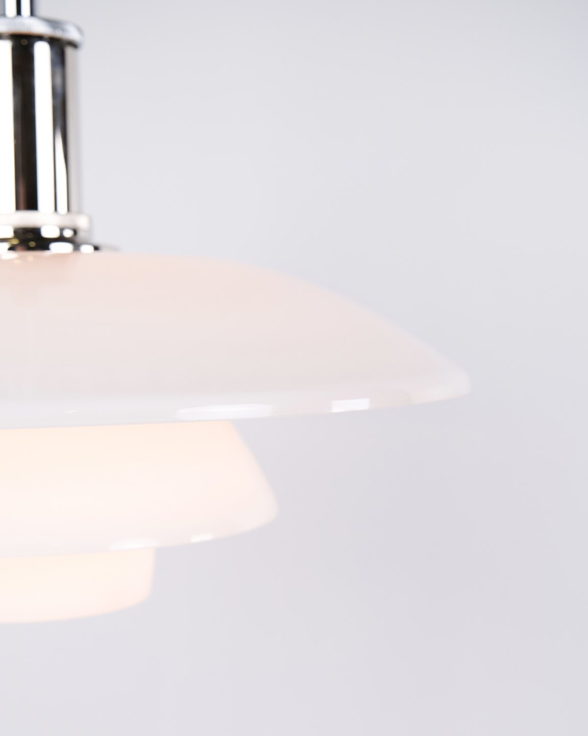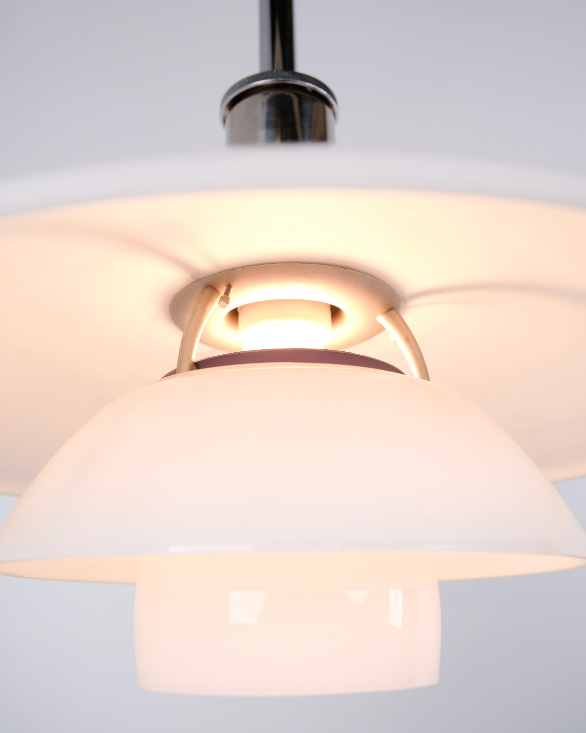 Suspension PH 4½-4 dessinée par Poul Henningsen pour Louis Poulsen. La lampe est réalisée avec trois abat-jours soufflés bouche en verre opalin blanc et suspension en chrome. Le modèle possède un abat-jour supérieur d’environ 45 cm et utilise les abat-jours inférieurs de la série PH 4/4, développés pour offrir une diffusion lumineuse plus large lorsqu’elle est suspendue bas au-dessus d’une table à manger ou d’un plan de table. La version actuelle a été introduite en 1980 et fait partie du système d’éclairage anti-éblouissement emblématique PH.