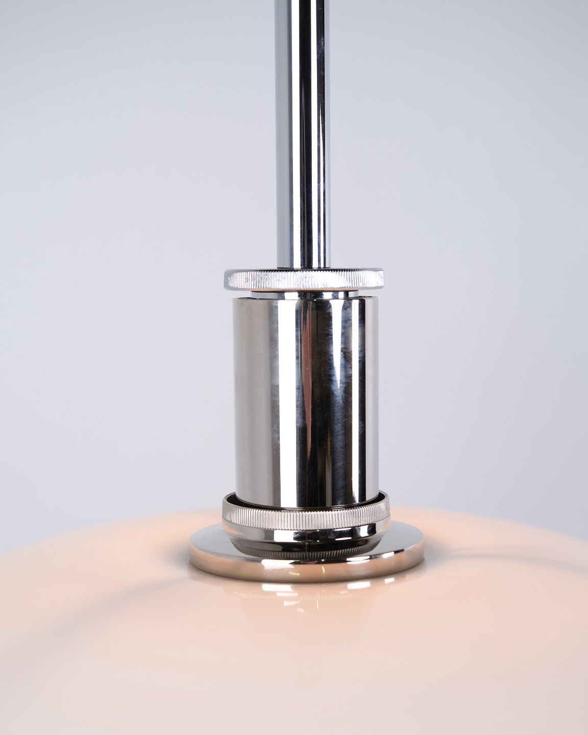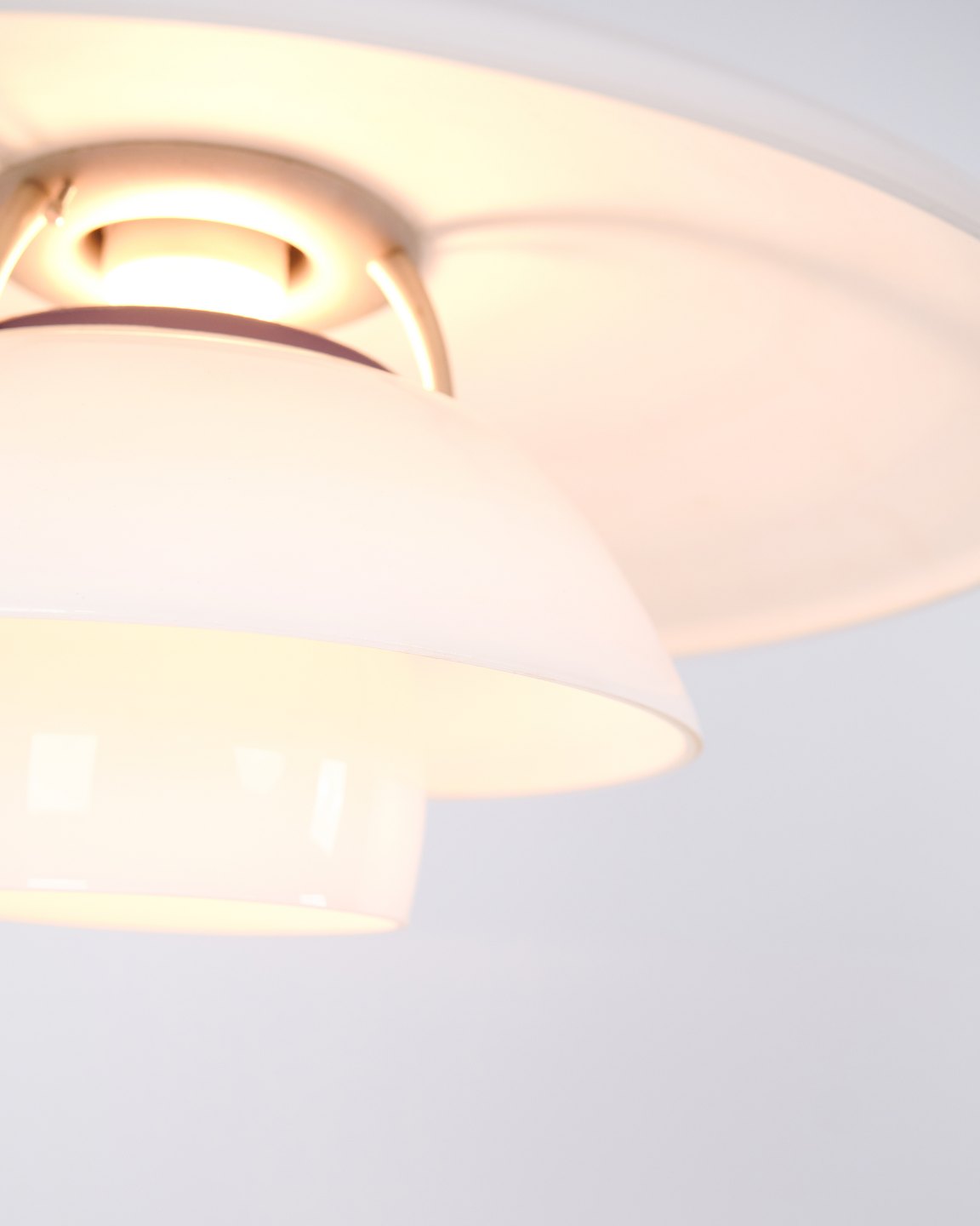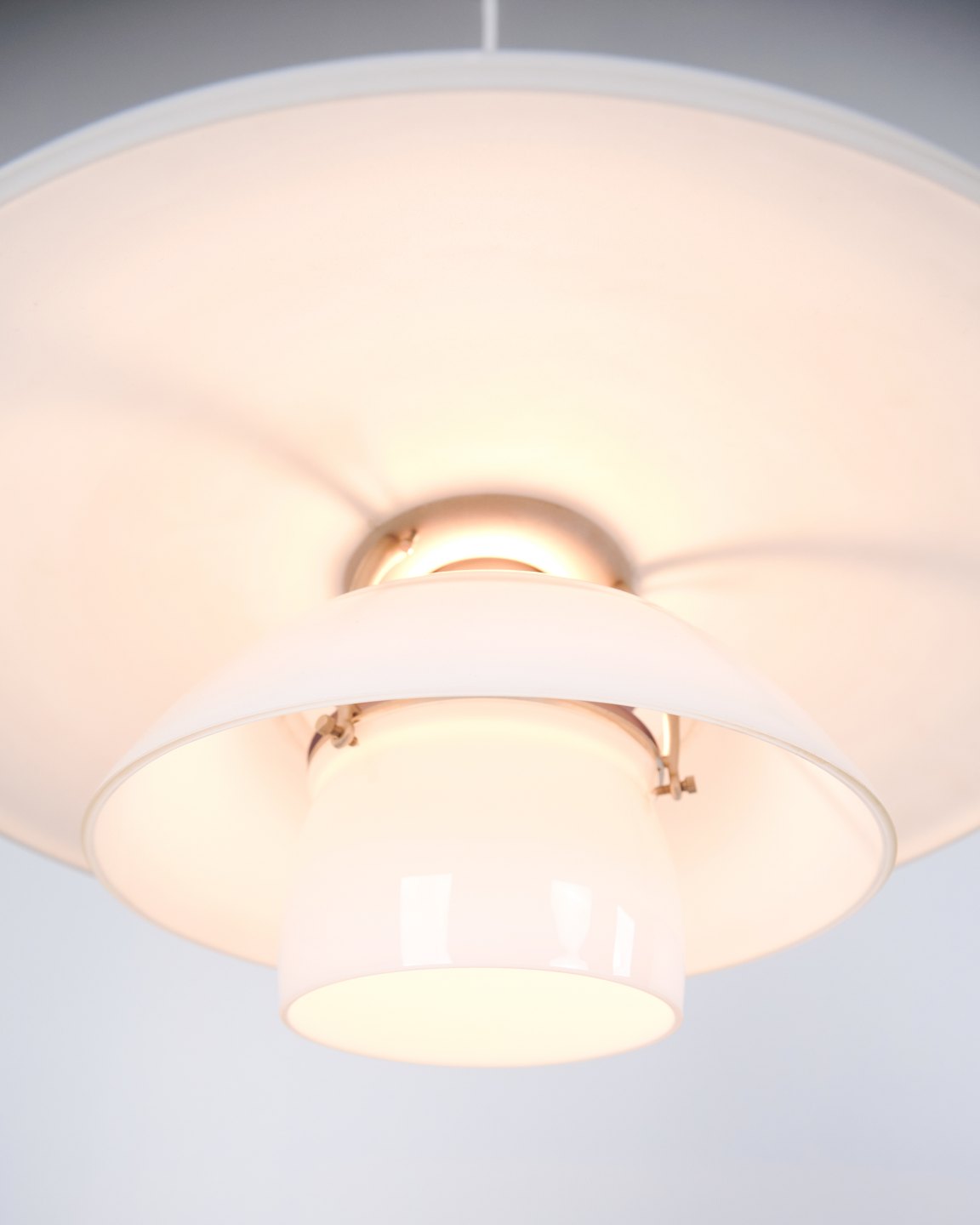 Suspension PH 4½-4 dessinée par Poul Henningsen pour Louis Poulsen. La lampe est réalisée avec trois abat-jours soufflés bouche en verre opalin blanc et suspension en chrome. Le modèle possède un abat-jour supérieur d’environ 45 cm et utilise les abat-jours inférieurs de la série PH 4/4, développés pour offrir une diffusion lumineuse plus large lorsqu’elle est suspendue bas au-dessus d’une table à manger ou d’un plan de table. La version actuelle a été introduite en 1980 et fait partie du système d’éclairage anti-éblouissement emblématique PH.