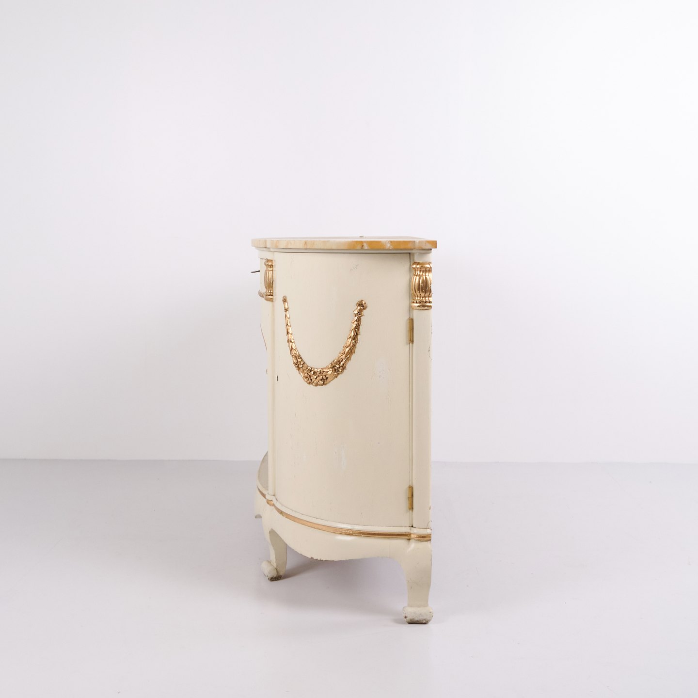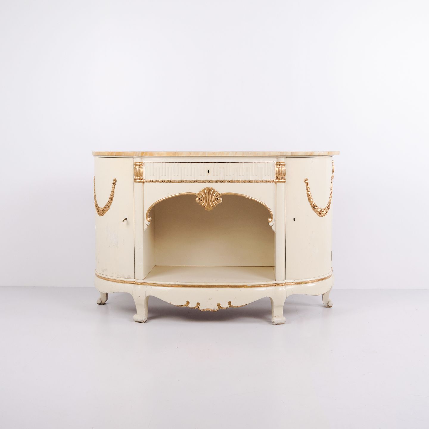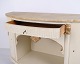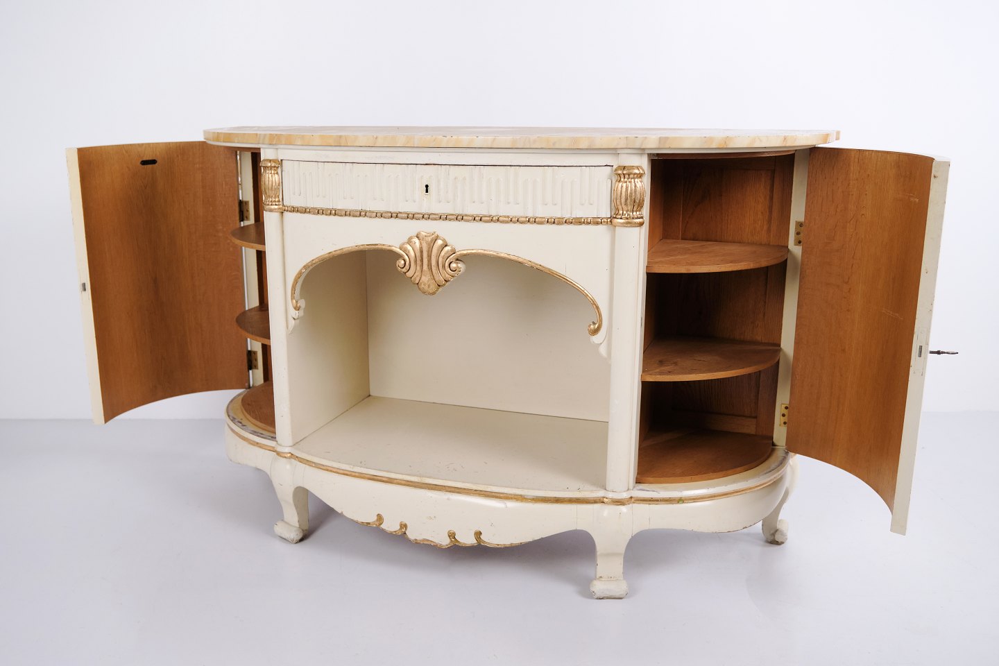 Buffet galbé réalisé par P. Svensen, N. Frihavnegade 15, Copenhague. Le meuble est en bois peint avec détails moulurés, décorations dorées et plateau en marbre d’origine. La façade présente une niche centrale ouverte, un petit tiroir ainsi que deux portes courbes avec étagères intérieures. Forme classique inspirée de l’Empire avec côtés galbés, pieds galbés et ferrures décoratives. Convient comme meuble d’entrée, console ou buffet de rangement.