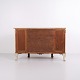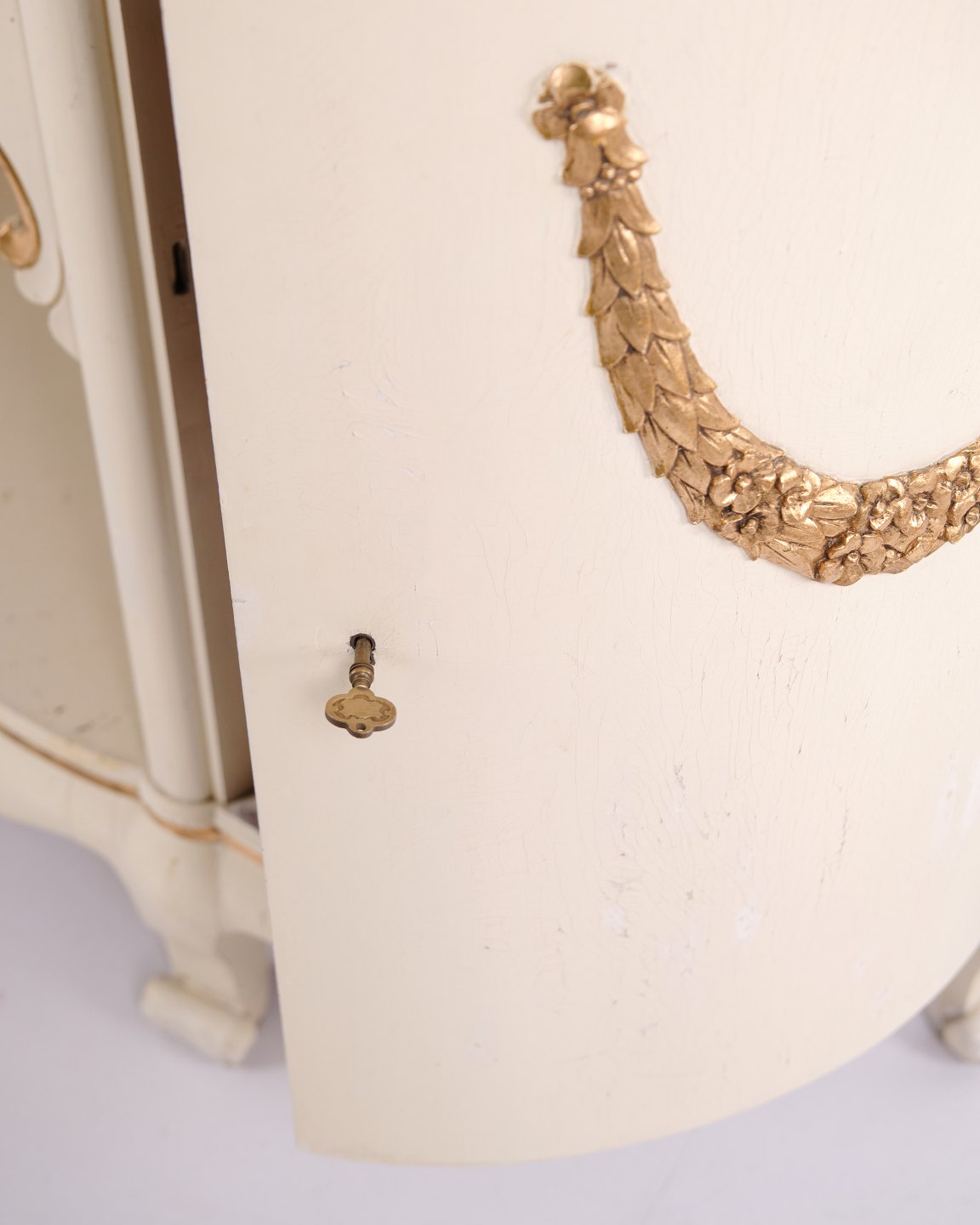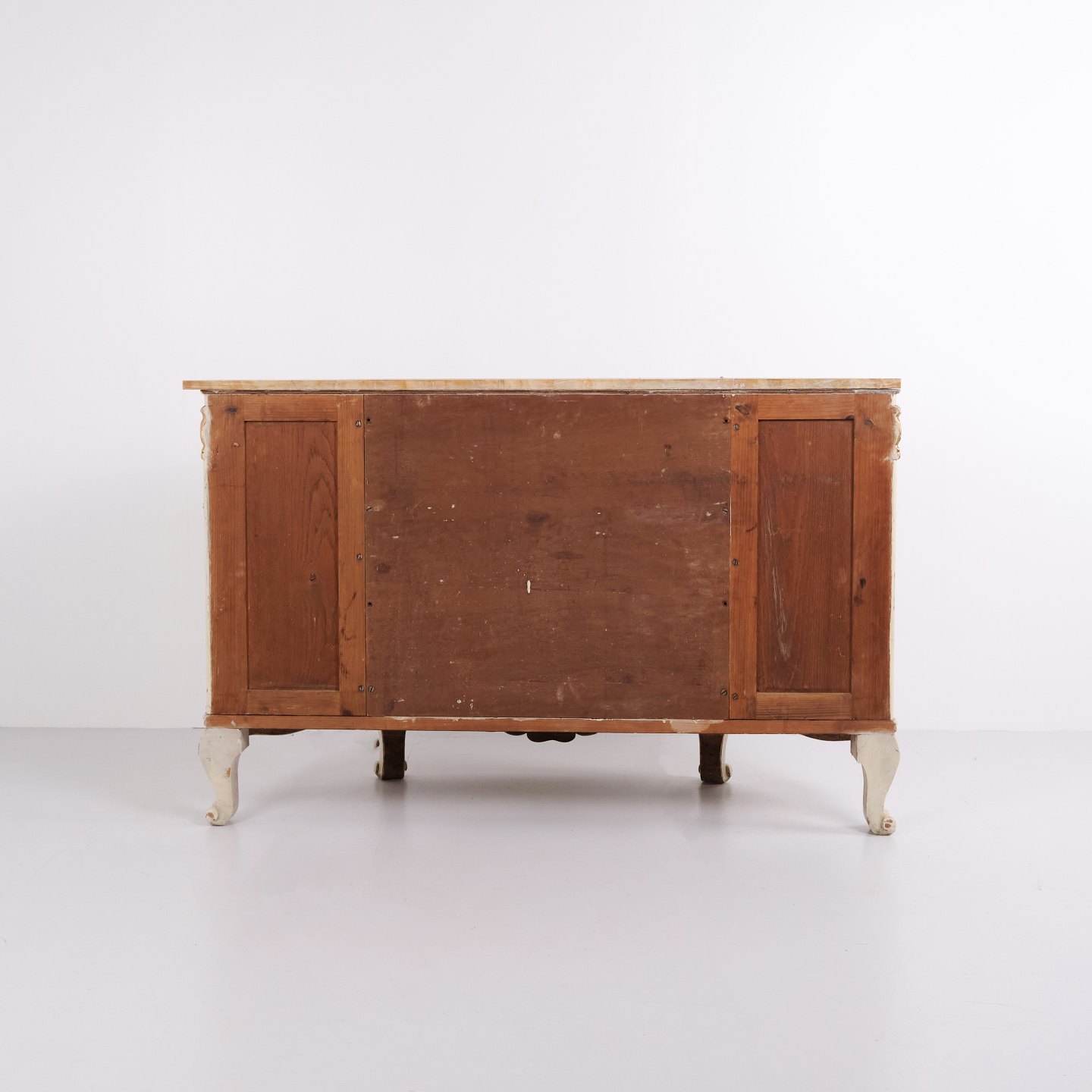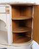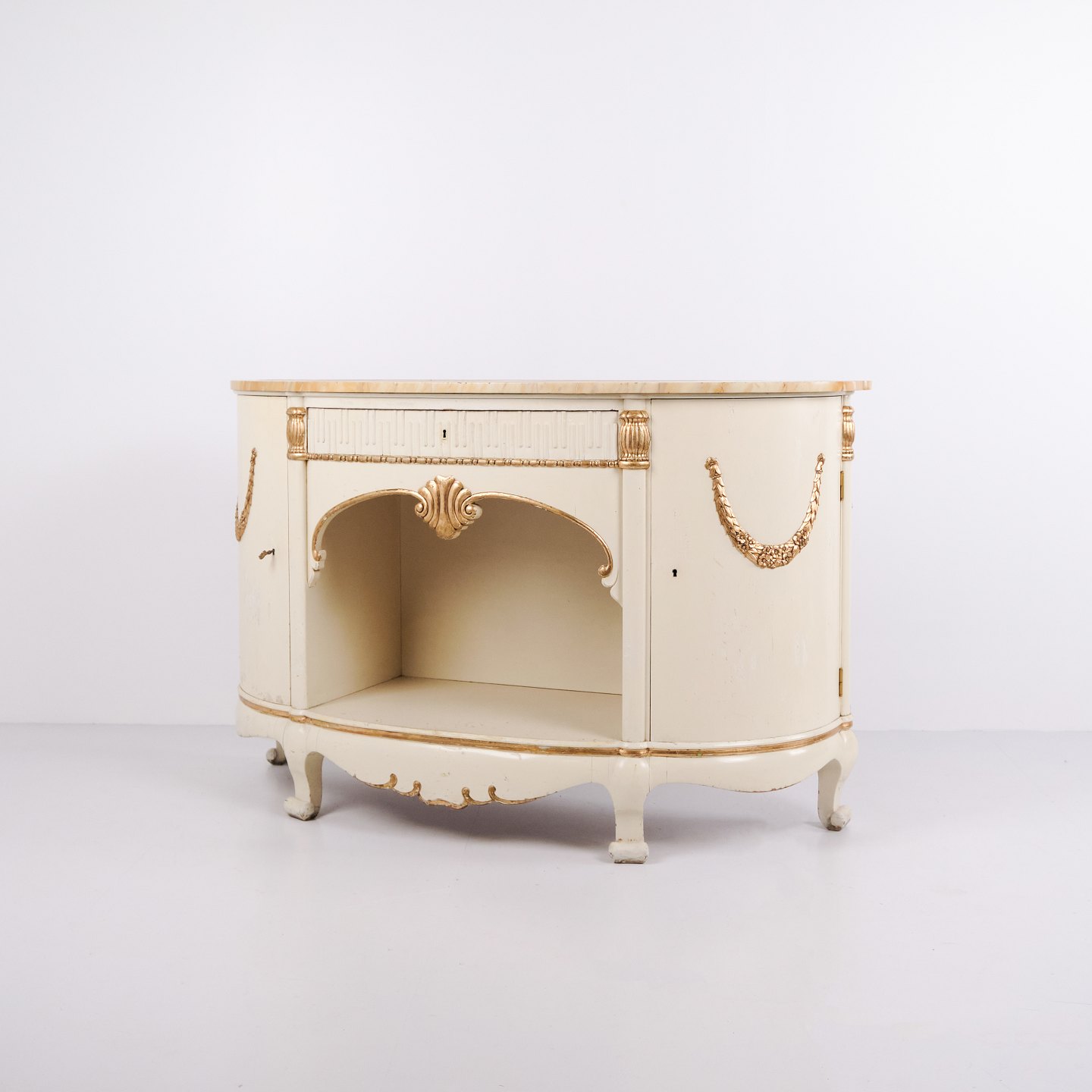 Buffet galbé réalisé par P. Svensen, N. Frihavnegade 15, Copenhague. Le meuble est en bois peint avec détails moulurés, décorations dorées et plateau en marbre d’origine. La façade présente une niche centrale ouverte, un petit tiroir ainsi que deux portes courbes avec étagères intérieures. Forme classique inspirée de l’Empire avec côtés galbés, pieds galbés et ferrures décoratives. Convient comme meuble d’entrée, console ou buffet de rangement.